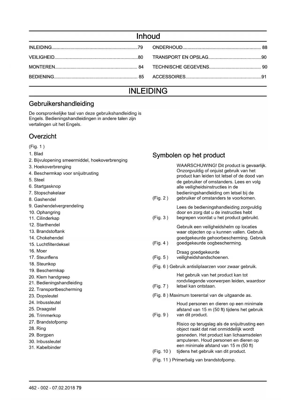 Symbolen op het product (Fig. 2 ) WAARSCHUWING! Dit product is gevaarlijk. Onzorgvuldig of onjuist gebruik van het product kan leiden tot letsel of de dood van de gebruiker of omstanders. Lees en volg alle veiligheidsinstructies in de bedieningshandleiding om letsel bij de gebruiker of omstanders te voorkomen. (Fig. 3 ) Lees de bedieningshandleiding zorgvuldig door en zorg dat u de instructies hebt begrepen voordat u het product gebruikt. (Fig. 4 ) Gebruik een veiligheidshelm op locaties waar objecten op u kunnen vallen. Gebruik goedgekeurde gehoorbescherming. Gebruik goedgekeurde oogbescherming. (Fig. 5 ) Draag goedgekeurde veiligheidshandschoenen. (Fig. 6 ) Gebruik antisliplaarzen voor zwaar gebruik. (Fig. 7 ) Het gebruik van het product kan tot rondvliegende voorwerpen leiden, waardoor letsel kan ontstaan. (Fig. 8 ) Maximum toerental van de uitgaande as. (Fig. 9 ) Houd personen en dieren op een minimale afstand van 15 m (50 ft) tijdens het gebruik van dit product. (Fig. 10 ) Risico op terugslag als de snijuitrusting een object raakt dat niet onmiddellijk wordt gesneden. Het product kan lichaamsdelen amputeren. Houd personen en dieren op een minimale afstand van 15 m (50 ft) tijdens het gebruik van dit product. (Fig. 11 ) Primerbalg van brandstofpomp.