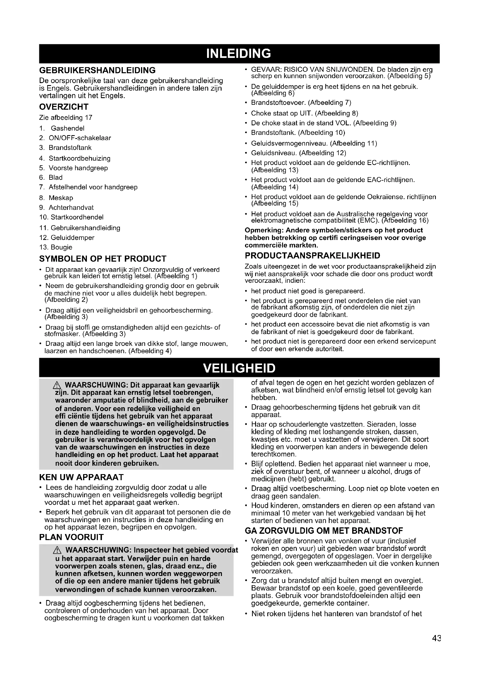 - Sla de machine op een droge plaats op, buiten het bereik van kinderen. VEILIGHEIDSWAARSCHUWING: Blootstelling aan trillingen door langdurig gebruik van handgereedschappen op benzine kan letsel van de bloedvaten of zenuwschade in de vingers, handen en gewrichten veroorzaken bij mensen die aanleg hebben voor circulatieaandoeningen of abnormale zwellingen. Langdurig gebruik bij koud weer is in verband gebracht met schade aan bloedvaten bij overigens gezonde mensen. Indien symptomen optreden zoals gevoelloosheid, pijn, verlies van kracht, verkleuring of verandering van de huid, of verlies van het gevoel in de vingers, handen of gewrichten, staak dan het gebruik van het apparaat en raadpleeg een arts. Een antivibratiesysteem garandeert niet dat deze problemen kunnen worden voorkomen. Gebruikers die motorische gereedschappen continu en regelmatig gebruiken, dienen hun lichamelijke toestand en de toestand van het apparaat nauwlettend in de gaten houden. MONTEREN a WAARSCHUWING: Wanneer u de machine samengebouwd hebt ontvangen, herhaal dan alle stappen om te controleren of uw apparaat goed is samengebouwd en alle koppelingen goed vastzitten. Houd u altijd aan de veiligheidsinformatie in de handleiding en op het apparaat.