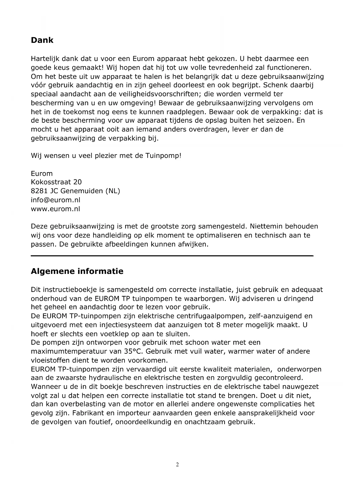 Algemene informatie Dit instructieboekje is samengesteld om correcte installatie, juist gebruik en adequaat onderhoud van de EUROM TP tuinpompen te waarborgen. Wij adviseren u dringend het geheel en aandachtig door te lezen voor gebruik. De EUROM TP-tuinpompen zijn elektrische centrifugaalpompen, zelf-aanzuigend en uitgevoerd met een injectiesysteem dat aanzuigen tot 8 meter mogelijk maakt. U hoeft er slechts een voetklep op aan te sluiten. De pompen zijn ontworpen voor gebruik met schoon water met een maximumtemperatuur van 35°C. Gebruik met vuil water, warmer water of andere vloeistoffen dient te worden voorkomen. EUROM TP-tuinpompen zijn vervaardigd uit eerste kwaliteit materialen, onderworpen aan de zwaarste hydraulische en elektrische testen en zorgvuldig gecontroleerd. Wanneer u de in dit boekje beschreven instructies en de elektrische tabel nauwgezet volgt zal u dat helpen een correcte installatie tot stand te brengen. Doet u dit niet, dan kan overbelasting van de motor en allerlei andere ongewenste complicaties het gevolg zijn. Fabrikant en importeur aanvaarden geen enkele aansprakelijkheid voor de gevolgen van foutief, onoordeelkundig en onachtzaam gebruik.3