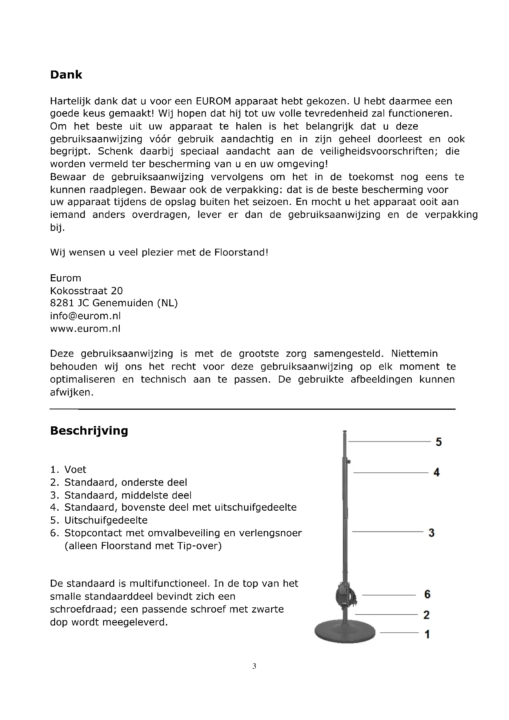De standaard is multifunctioneel. In de top van het smalle standaarddeel bevindt zich een schroefdraad; een passende schroef met zwarte dop wordt meegeleverd.4 Montage van de standaard Voor beide modellen Plaats het onderste deel van de standaard (met het bevestigingsplaatje) op de voet. Keer de voet om en schroef het onderste deel van de standaard vanaf onderkant voet vast met het plaatje en de borgmoer. Zet de voet weer rechtop. Plaats het beschermkapje over de aansluiting. Steek het middelste deel van de standaard in het onderste deel, schroefgaten op schroefgaten. Bevestig het op z’n plaats met vier fixatieschroefjes. Op dezelfde wijze bevestigt u het bovenste deel van de standaard (met daarin het verstelbare deel) over het middelste deel. Schuif het uitschuifgedeelte naar boven en ziet deze vast met de meegeleverde zwart zelftapper. Voor model met Tip-over Plaats het stopcontact met de verlengsnoer op het onderste deel van de standaard met het stopcontact naar boven. Bevestig deze stevig met de bijgeleverde beugels en schroefjes. Voor beide modellen Bevestig het apparaat op de standaard, met de meegeleverde borgmoer. Controleer of alle aansluitingen onwrikbaar vast zitten en het apparaat in zijn geheel stevig op z’n plaats staat voordat u hem in gebruik neemt. Het apparaat moet stevig en stabiel staan op een effen, volkomen horizontale ondergrond. Omvalbeveiliging (model met Tip-over) Het extra stopcontact is uitgevoerd met een omvalbeveiliging. Mocht hij dus ondanks uw voorzorgsmaatregelen toch een keer vallen dan schakelt hij automatisch uit. Neem in dat geval onmiddellijk de stekker uit het stopcontact. Controleer het apparaat wat bevestigt is aan de standaard nauwkeurig op beschadigingen en zet hem weer rechtop. Stel een beschadigd apparaat nooit in werking maar biedt het ter controle en/of reparatie aan bij uw dealer of een erkend servicepunt! Wanneer u geen beschadigingen constateert schakelt u het apparaat uit, steekt u de stekker weer in het stopcontact en stelt u het apparaat weer in werking. Houd het apparaat het eerste kwartier nauwkeurig in het oog; doen zich alsnog storingen voor, schakel hem dan onmiddellijk uit en biedt hem ter reparatie aan bij uw dealer/servicepunt.5 Verwijdering Binnen de EU betekent dit symbool dat dit product niet met het normale huishoudelijke afval mag worden afgevoerd. Afgedankte apparaten bevatten waardevolle materialen die hergebruikt kunnen en moeten worden, om het milieu en de gezondheid niet te schaden door ongereguleerde afvalinzameling. Breng afgedankte apparatuur daarom naar een daarvoor aangewezen inzamelpunt of wend u tot het bedrijf waar u het apparaat gekocht hebt. Zij kunnen er voor zorgen dat zoveel mogelijk onderdelen van het apparaat hergebruikt worden.6 Dank Vielen Dank, dass Sie sich für ein EUROM-Gerät entschieden haben. Mit diesem Produkt haben Sie eine gute Wahl getroffen! Wir hoffen, dass das Gerät zu Ihrer vollen Zufriedenheit funktionieren wird. Damit Sie das Gerät optimal nutzen können, ist es wichtig, dass Sie die gesamte Betriebsanleitung vor dem ersten Gebrauch sorgfältig lesen und verstehen. Besondere Aufmerksamkeit sollten Sie dabei den Sicherheitsvorschriften widmen, die zu Ihrer eigenen Sicherheit und zur Sicherheit Ihrer Umgebung zu beachten sind. Heben Sie die Betriebsanleitung anschließend auf, um sie in Zukunft noch einmal nachlesen zu können. Bewahren Sie auch die Verpackung auf, denn sie ist der beste Schutz für Ihr Gerät während der Lagerung außerhalb der Saison. Und falls Sie das Gerät einmal einer anderen Person übertragen, sollten Sie es einschließlich Betriebsanleitung und Verpackung übergeben. Wir wünschen Ihnen viel Spaß mit dem Floorstand! Eurom Kokosstraat 20 8281 JC Genemuiden (NL) info@eurom.nl www.eurom.nl Diese Gebrauchsanleitung wurde mit größtmöglicher Sorgfalt zusammengestellt. Dennoch behalten wir uns vor, diese Anleitung jederzeit zu optimieren und technisch anzupassen. Die verwendeten Bilder können abweichen.