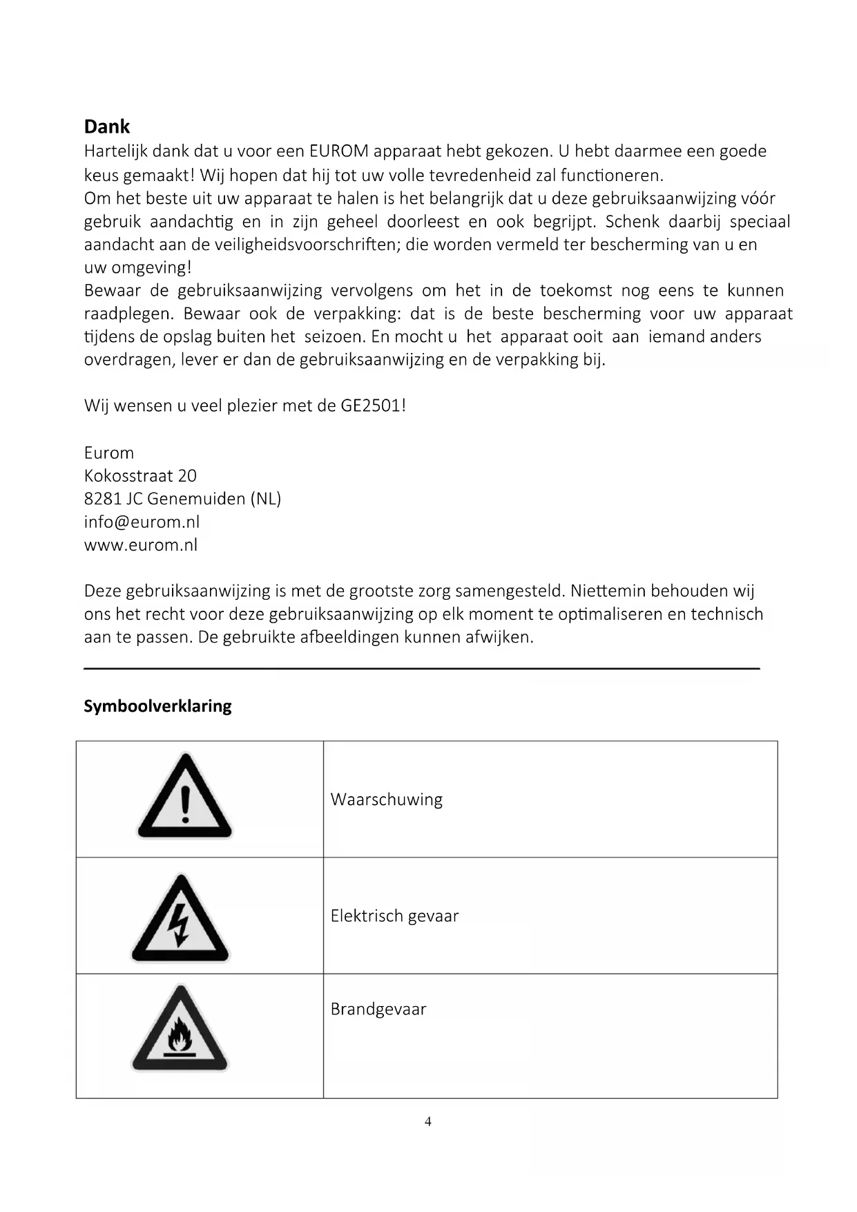 Generaattori kuljetetaan ilman öljyä. Jos öljysäiliötä ei täytetä, generaattori ei käynnisty. Varmista, että generaattori on täysin tasainen öljyä täytettäessä. Kallistaminen voi johtaa ylitäyttöön ja vahingoittaa moottoria.4 Dank Hartelijk dank dat u voor een EUROM apparaat hebt gekozen. U hebt daarmee een goede keus gemaakt! Wij hopen dat hij tot uw volle tevredenheid zal functioneren. Om het beste uit uw apparaat te halen is het belangrijk dat u deze gebruiksaanwijzing vóór gebruik aandachtig en in zijn geheel doorleest en ook begrijpt. Schenk daarbij speciaal aandacht aan de veiligheidsvoorschriften; die worden vermeld ter bescherming van u en uw omgeving! Bewaar de gebruiksaanwijzing vervolgens om het in de toekomst nog eens te kunnen raadplegen. Bewaar ook de verpakking: dat is de beste bescherming voor uw apparaat tijdens de opslag buiten het seizoen. En mocht u het apparaat ooit aan iemand anders overdragen, lever er dan de gebruiksaanwijzing en de verpakking bij. Wij wensen u veel plezier met de GE2501! Eurom Kokosstraat 20 8281 JC Genemuiden (NL) info@eurom.nl www.eurom.nl Deze gebruiksaanwijzing is met de grootste zorg samengesteld. Niettemin behouden wij ons het recht voor deze gebruiksaanwijzing op elk moment te optimaliseren en technisch aan te passen. De gebruikte afbeeldingen kunnen afwijken.