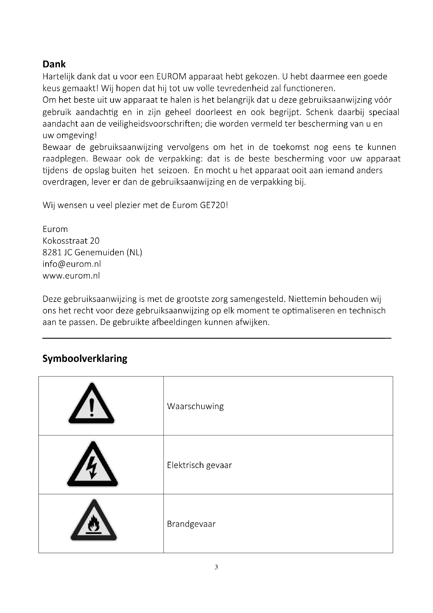 Dank Hartelijk dank dat u voor een EUROM apparaat hebt gekozen. U hebt daarmee een goede keus gemaakt! Wij hopen dat hij tot uw volle tevredenheid zal functioneren. Om het beste uit uw apparaat te halen is het belangrijk dat u deze gebruiksaanwijzing vóór gebruik aandachtig en in zijn geheel doorleest en ook begrijpt. Schenk daarbij speciaal aandacht aan de veiligheidsvoorschriften; die worden vermeld ter bescherming van u en uw omgeving! Bewaar de gebruiksaanwijzing vervolgens om het in de toekomst nog eens te kunnen raadplegen. Bewaar ook de verpakking: dat is de beste bescherming voor uw apparaat tijdens de opslag buiten het seizoen. En mocht u het apparaat ooit aan iemand anders overdragen, lever er dan de gebruiksaanwijzing en de verpakking bij. Wij wensen u veel plezier met de Eurom GE720! Eurom Kokosstraat 20 8281 JC Genemuiden (NL) info@eurom.nl www.eurom.nl Deze gebruiksaanwijzing is met de grootste zorg samengesteld. Niettemin behouden wij ons het recht voor deze gebruiksaanwijzing op elk moment te optimaliseren en technisch aan te passen. De gebruikte afbeeldingen kunnen afwijken.