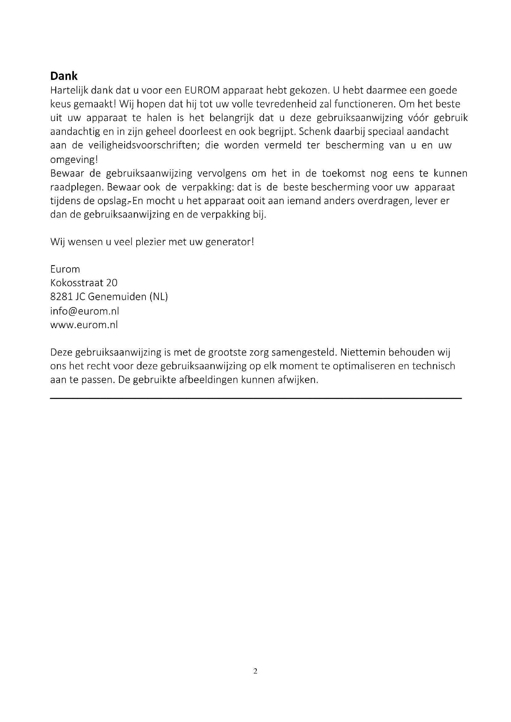 - Neem contact op met uw servicepunt Wend u met alle andere problemen tot uw leverancier of servicepunt Let op! Voer nooit zelf reparaties uit aan uw generator maar ga er mee naar uw servicepunt of een op dit terrein gekwalificeerd monteur. Ondeskundig uitgevoerde21 reparaties doen de garantie en aansprakelijkheid van leverancier, importeur en fabrikant vervallen! Verwijdering Gooi het apparaat aan het einde van de levensduur weg volgens de plaatselijke wetten en voorschriften of lever het apparaat in bij uw leverancier. Ter bescherming van het milieu mogen generatoren, accu’s, motorolie, enz. Niet bij het normaal afval worden gezet. Houd u aan de wettelijke voorschriften. Voer afgewerkte motorolie op de wettelijke voorgeschreven manier af. U dient de olie in een afgesloten verpakking bij een daarvvoor bestemd inzamelpunt in te leveren. Volg voor het afvoeren van accu’s de lokale regels. Een onluist afgevoerde accu kan het milieu zwaar belasten. Bedradingdiagram Het bedradingsdiagram vindt u aan het einde van deze handleiding Bijlages De CE-verklaring vindt u aan het einde van deze handleiding.22 Thank you Thank you for choosing a EUROM device. You have made a good choice! We hope you are satisfied with how it functions. To get the most out of your device, it is important that you read and understand this manual carefully and in its entirety before use. Pay special attention to the safety instructions; they are listed to protect you and your surroundings! Then keep the user manual for future reference. Also keep the packaging: it is the best protection for your device during storage. And should you ever hand over the device to someone else, please provide the user manual and packaging with it. We hope you enjoy your generator! Eurom Kokosstraat 20 8281 JC Genemuiden (NL) info@eurom.nl www.eurom.nl This user manual has been compiled with the utmost care. Nevertheless, we reserve the right to optimise and technically modify this user manual at any time. The images used may differ.