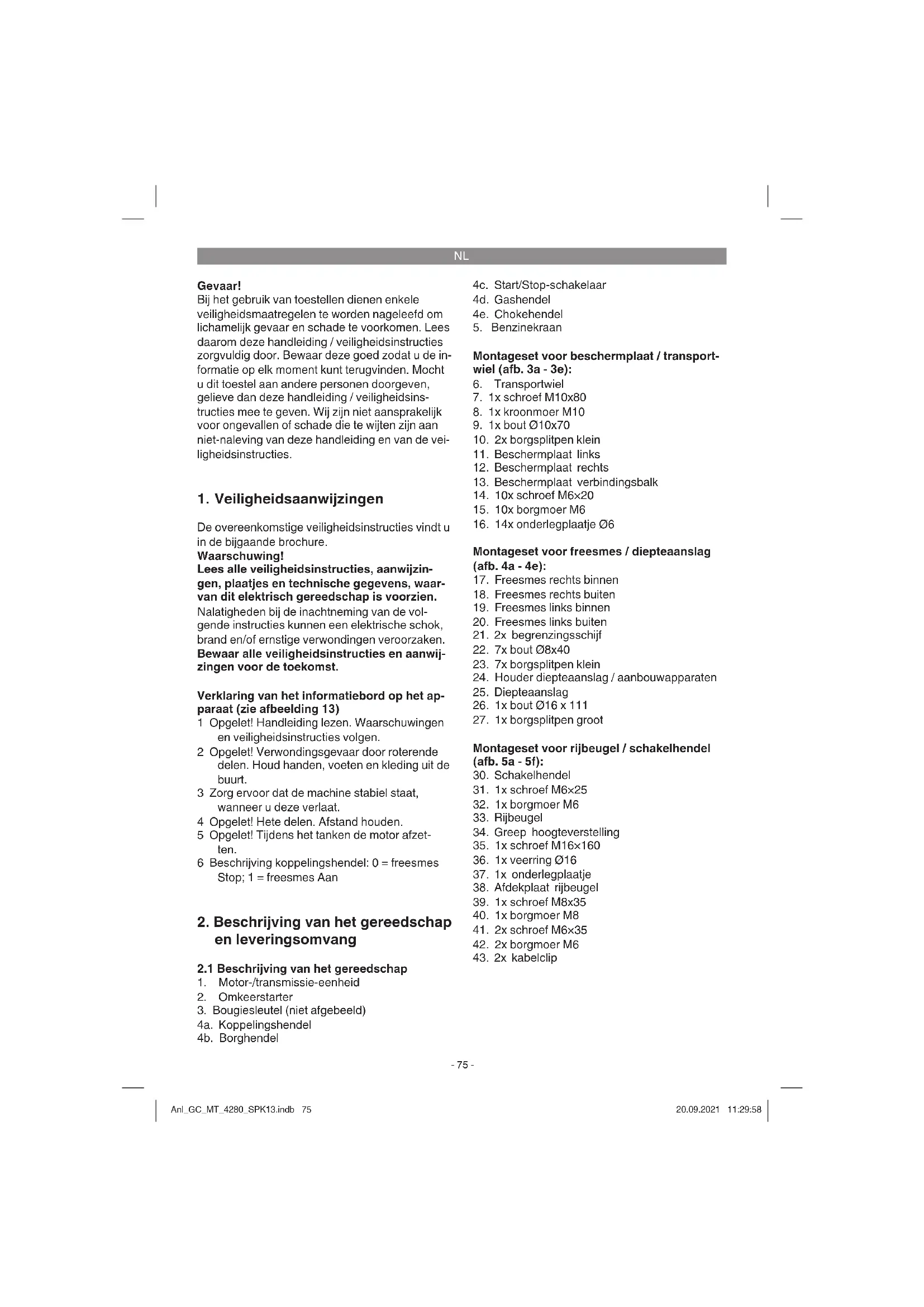 Gashendel (4d) in positie brengen voor het gewenste toerental. Opgelet! Bij het starten met de omkeerstarter kan het door plotselinge terugslag, veroorzaakt door de aanlo- pende motor, tot handletsel komen. Draag bij het starten veiligheidshandschoenen. Aanwijzing! De trekkabel niet laten terugsprin- gen. Aanwijzing! Bij koel weer kan het vereist zijn om de startpoging meermaals te herhalen. Motor stoppen Zet de motor Start/Stop-hendel (4c) in positie STOP. Anl_GC_MT_4280_SPK13.indb 77Anl_GC_MT_4280_SPK13.indb 77 20.09.2021 11:29:5920.09.2021 11:29:59NL
