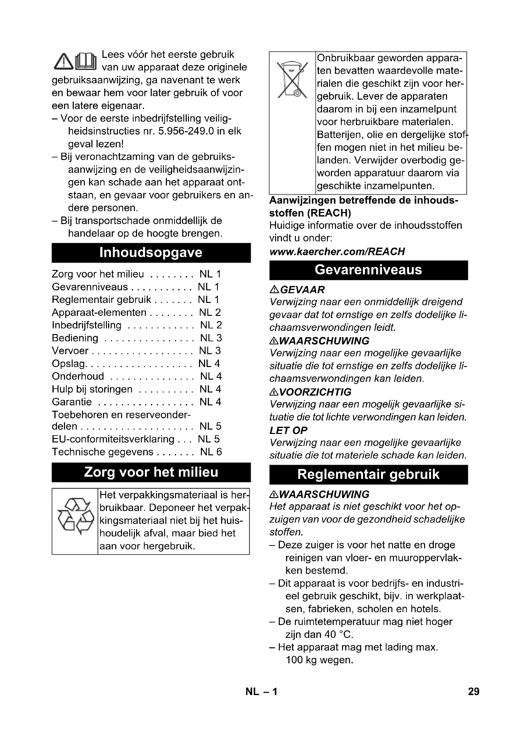 Codice com- ponente Lunghezza cavo EU 6.647-069.0 10 m 28 IT– 1 Lees vóór het eerste gebruik van uw apparaat deze originele gebruiksaanwijzing, ga navenant te werk en bewaar hem voor later gebruik of voor een latere eigenaar. – Voor de eerste inbedrijfstelling veilig- heidsinstructies nr. 5.956-249.0 in elk geval lezen! – Bij veronachtzaming van de gebruiks- aanwijzing en de veiligheidsaanwijzin- gen kan schade aan het apparaat ont- staan, en gevaar voor gebruikers en an- dere personen. – Bij transportschade onmiddellijk de handelaar op de hoogte brengen. Aanwijzingen betreffende de inhouds- stoffen (REACH) Huidige informatie over de inhoudsstoffen vindt u onder: www.kaercher.com/REACH GEVAAR Verwijzing naar een onmiddellijk dreigend gevaar dat tot ernstige en zelfs dodelijke li- chaamsverwondingen leidt. 몇 WAARSCHUWING Verwijzing naar een mogelijke gevaarlijke situatie die tot ernstige en zelfs dodelijke li- chaamsverwondingen kan leiden. 몇 VOORZICHTIG Verwijzing naar een mogelijk gevaarlijke si- tuatie die tot lichte verwondingen kan leiden. LET OP Verwijzing naar een mogelijke gevaarlijke situatie die tot materiele schade kan leiden. 몇 WAARSCHUWING Het apparaat is niet geschikt voor het op- zuigen van voor de gezondheid schadelijke stoffen. – Deze zuiger is voor het natte en droge reinigen van vloer- en muuroppervlak- ken bestemd. – Dit apparaat is voor bedrijfs- en industri- eel gebruik geschikt, bijv. in werkplaat- sen, fabrieken, scholen en hotels. – De ruimtetemperatuur mag niet hoger zijn dan 40 °C. – Het apparaat mag met lading max. 100 kg wegen. Inhoudsopgave Zorg voor het milieu . . . . . . . . NL 1 Gevarenniveaus . . . . . . . . . . . NL 1 Reglementair gebruik . . . . . . . NL 1 Apparaat-elementen . . . . . . . . NL 2 Inbedrijfstelling . . . . . . . . . . . . NL 2 Bediening . . . . . . . . . . . . . . . . NL 3 Vervoer . . . . . . . . . . . . . . . . . . NL 3 Opslag. . . . . . . . . . . . . . . . . . . NL 4 Onderhoud . . . . . . . . . . . . . . . NL 4 Hulp bij storingen . . . . . . . . . . NL 4 Garantie . . . . . . . . . . . . . . . . . NL 4 Toebehoren en reserveonder- delen . . . . . . . . . . . . . . . . . . . . NL 5 EU-conformiteitsverklaring . . . NL 5 Technische gegevens . . . . . . . NL 6 Zorg voor het milieu Het verpakkingsmateriaal is her- bruikbaar. Deponeer het verpak- kingsmateriaal niet bij het huis- houdelijk afval, maar bied het aan voor hergebruik. Onbruikbaar geworden appara- ten bevatten waardevolle mate- rialen die geschikt zijn voor her- gebruik. Lever de apparaten daarom in bij een inzamelpunt voor herbruikbare materialen. Batterijen, olie en dergelijke stof- fen mogen niet in het milieu be- landen. Verwijder overbodig ge- worden apparatuur daarom via geschikte inzamelpunten. Gevarenniveaus Reglementair gebruik 29NL– 2 1 Sterschroef 2 Patronenfilter 3 Mechanische overloopbeveiliging 4 Zuigkop 5 Zuigslang 6 Duwbeugel 7 Kabelhaak 8 Vergrendeling van de zuigkop 9 Vuilreservoir 10 Luchtinlaatleidingen 11 Kantelchassis 12 Handgreep van het reservoir 13 Zwenkwiel 14 Vloersproeier 15 Zuigbuis 16 Handgreep 17 Elleboog 18 Hoofdschakelaar zuigturbine 2 19 Hoofdschakelaar zuigturbine 1 20 Hoofdschakelaar zuigturbine 3 21 Houder voor vloerspuitkop 22 Aftapslang 23 Houder voor zuigbuizen 24 Houder voor voegsproeier 25 Netkabel 26 Typeplaatje LET OP De maximaal toegelaten netimpedantie aan het elektrische aansluitpunt (zie Tech- nische gegevens) mag niet overschreden worden. In geval van onduidelijkheden in verband met de netimpedantie aan uw aan- sluitpunt neemt u best contact op met uw electriciteitsmaatschappij. LET OP Beschadigingsgevaar! Tijdens het zuigen mag de patroonfilter nooit verwijderd wor- den. – Bij het opzuigen van fijn stof kan ook nog een papieren filterzak of een mem- braanfilter (bijzondere toebehoren) ge- bruikt worden. Afbeelding Zuigkop ontgrendelen en wegnemen. Papieren filterzak of membraanfilter (bijzondere toebehoren) monteren. Zuigkop eropzetten en vergrendelen. Afbeelding Borstelstrook demonteren. Rubber strippen inbouwen. Aanwijzing: De gestructueerde kant van de rubber strippen moet naar buiten wijzen. – Bij het opzuigen van nat vuil moet altijd de papieren filterzak resp. de mem- braanfilter (speciale accessoires) ver- wijderd worden. – Wij raden u aan een speciale filterzak (nat) te gebruiken (zie filtersystemen). LET OP Beschadigingsgevaar! Tijdens het zuigen mag de patroonfilter nooit verwijderd wor- den. – Na beëindiging van het natzuigen: Me- chanische overloopbescherming en re- servoir met een vochtige doek schoon- maken en afdrogen. – Bij direct wisselen van nat- naar droog- zuigen dient het natte patroonfilter door een droog vervangen te worden. Apparaat-elementen Inbedrijfstelling Stroomaansluiting Droogzuigen Inbouw papierfilterzak (optie) Natzuigen Inbouw rubber lippen Papieren filterzak wegnemen Natzuigen met patronenfilter 30 NL– 3 Zuigkop ontgrendelen en wegnemen. Sterschroef losschroeven en patroonfil- ter verwijderen. Afbeelding Sterschroef vastschroeven. Natfilter monteren. Zuigkop eropzetten en vergrendelen. LET OP Beschadigingsgevaar! Tijdens het zuigen mag het natfilter nooit verwijderd worden. – Na beëindiging van het natzuigen: Me- chanische overloopbescherming en re- servoir met een vochtige doek schoon- maken en afdrogen. – Bij het wisselen van nat- naar droogzui- gen dient het natfilter door een patro- nenfilter vervangen te worden. 몇 VOORZICHTIG Lokale voorschriften inzake de behande- ling van afvalwater in acht nemen. Apparaat met metaal reservoirs: Afbeelding Apparaat met kunstof reservoirs: Afbeelding Afvalwater aflaten via de aftapslang. Afbeelding Parkeerrem vastzetten. Reservoir aan de handgreep vasthou- den en kantelen door het op te tillen. Reservoir volledig leegmaken. Afbeelding De zuigslang is van een clip-systeem voor- zien. Alle C-40/C-DN-40 accessoires kun- nen worden aangesloten. Steek de netstekker in de contactdoos. Apparaat inschakelen. – Het zuigk