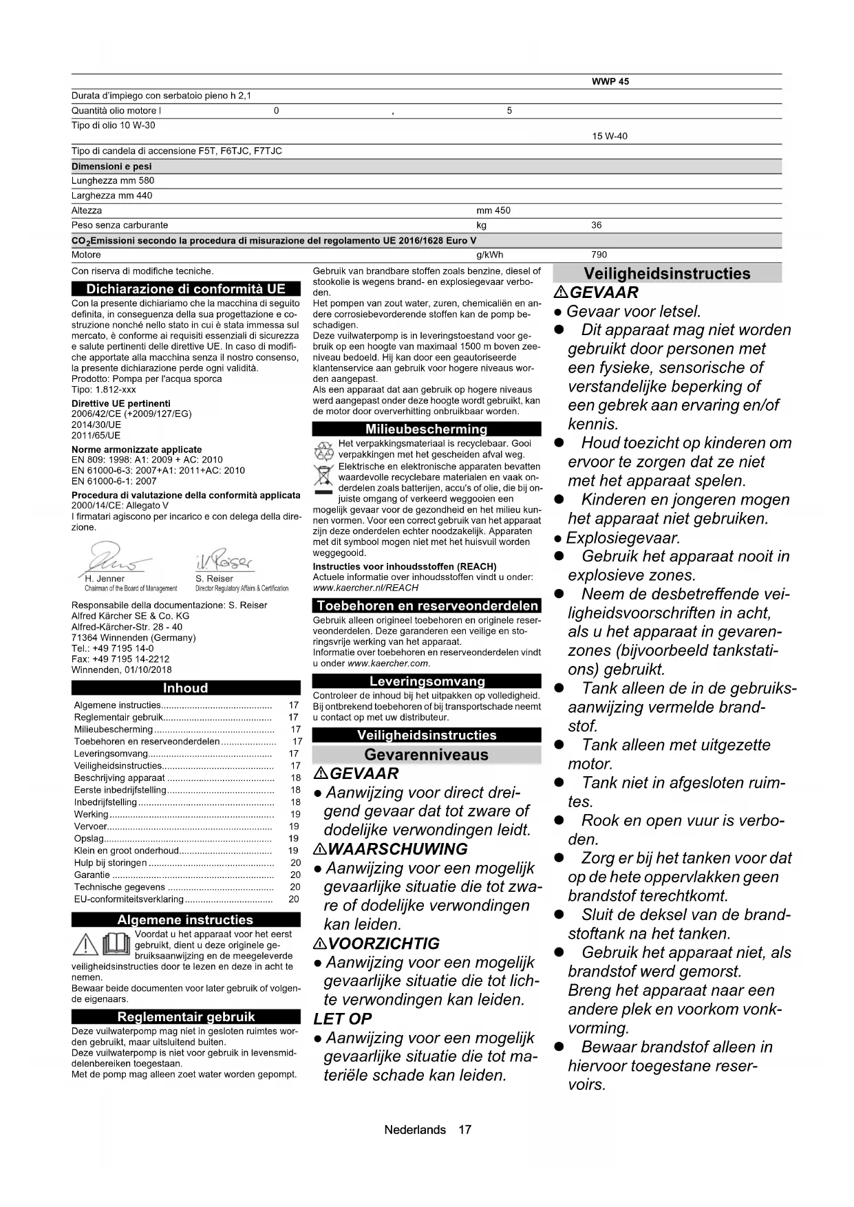 Potenza del motore kW/PS 5,1/6,9 Tipo di carburante Benzina, minimo 88 ottani Contenuto serbatoio carburante l 3,6Nederlands 17 Con riserva di modifiche tecniche. Dichiarazione di conformità UE Con la presente dichiariamo che la macchina di seguito definita, in conseguenza della sua progettazione e co- struzione nonché nello stato in cui è stata immessa sul mercato, è conforme ai requisiti essenziali di sicurezza e salute pertinenti delle direttive UE. In caso di modifi- che apportate alla macchina senza il nostro consenso, la presente dichiarazione perde ogni validità. Prodotto: Pompa per l'acqua sporca Tipo: 1.812-xxx Direttive UE pertinenti 2006/42/CE (+2009/127/EG) 2014/30/UE 2011/65/UE Norme armonizzate applicate EN 809: 1998: A1: 2009 + AC: 2010 EN 61000-6-3: 2007+A1: 2011+AC: 2010 EN 61000-6-1: 2007 Procedura di valutazione della conformità applicata 2000/14/CE: Allegato V I firmatari agiscono per incarico e con delega della dire- zione. Responsabile della documentazione: S. Reiser Alfred Kärcher SE & Co. KG Alfred-Kärcher-Str. 28 - 40 71364 Winnenden (Germany) Tel.: +49 7195 14-0 Fax: +49 7195 14-2212 Winnenden, 01/10/2018 Inhoud Algemene instructies Voordat u het apparaat voor het eerst gebruikt, dient u deze originele ge- bruiksaanwijzing en de meegeleverde veiligheidsinstructies door te lezen en deze in acht te nemen. Bewaar beide documenten voor later gebruik of volgen- de eigenaars. Reglementair gebruik Deze vuilwaterpomp mag niet in gesloten ruimtes wor- den gebruikt, maar uitsluitend buiten. Deze vuilwaterpomp is niet voor gebruik in levensmid- delenbereiken toegestaan. Met de pomp mag alleen zoet water worden gepompt. Gebruik van brandbare stoffen zoals benzine, diesel of stookolie is wegens brand- en explosiegevaar verbo- den. Het pompen van zout water, zuren, chemicaliën en an- dere corrosiebevorderende stoffen kan de pomp be- schadigen. Deze vuilwaterpomp is in leveringstoestand voor ge- bruik op een hoogte van maximaal 1500 m boven zee- niveau bedoeld. Hij kan door een geautoriseerde klantenservice aan gebruik voor hogere niveaus wor- den aangepast. Als een apparaat dat aan gebruik op hogere niveaus werd aangepast onder deze hoogte wordt gebruikt, kan de motor door oververhitting onbruikbaar worden. Milieubescherming Het verpakkingsmateriaal is recyclebaar. Gooi verpakkingen met het gescheiden afval weg. Elektrische en elektronische apparaten bevatten waardevolle recyclebare materialen en vaak on- derdelen zoals batterijen, accu's of olie, die bij on- juiste omgang of verkeerd weggooien een mogelijk gevaar voor de gezondheid en het milieu kun- nen vormen. Voor een correct gebruik van het apparaat zijn deze onderdelen echter noodzakelijk. Apparaten met dit symbool mogen niet met het huisvuil worden weggegooid. Instructies voor inhoudsstoffen (REACH) Actuele informatie over inhoudsstoffen vindt u onder: www.kaercher.nl/REACH Toebehoren en reserveonderdelen Gebruik alleen origineel toebehoren en originele reser- veonderdelen. Deze garanderen een veilige en sto- ringsvrije werking van het apparaat. Informatie over toebehoren en reserveonderdelen vindt u onder www.kaercher.com. Leveringsomvang Controleer de inhoud bij het uitpakken op volledigheid. Bij ontbrekend toebehoren of bij transportschade neemt u contact op met uw distributeur. Veiligheidsinstructies Gevarenniveaus GEVAAR ● Aanwijzing voor direct drei- gend gevaar dat tot zware of dodelijke verwondingen leidt. 몇 WAARSCHUWING ● Aanwijzing voor een mogelijk gevaarlijke situatie die tot zwa- re of dodelijke verwondingen kan leiden. 몇 VOORZICHTIG ● Aanwijzing voor een mogelijk gevaarlijke situatie die tot lich- te verwondingen kan leiden. LET OP ● Aanwijzing voor een mogelijk gevaarlijke situatie die tot ma- teriële schade kan leiden. Veiligheidsinstructies GEVAAR ● Gevaar voor letsel. Dit apparaat mag niet worden gebruikt door personen met een fysieke, sensorische of verstandelijke beperking of een gebrek aan ervaring en/of kennis. Houd toezicht op kinderen om ervoor te zorgen dat ze niet met het apparaat spelen. Kinderen en jongeren mogen het apparaat niet gebruiken. ● Explosiegevaar. Gebruik het apparaat nooit in explosieve zones. Neem de desbetreffende vei- ligheidsvoorschriften in acht, als u het apparaat in gevaren- zones (bijvoorbeeld tankstati- ons) gebruikt. Tank alleen de in de gebruiks- aanwijzing vermelde brand- stof. Tank alleen met uitgezette motor. Tank niet in afgesloten ruim- tes. Rook en open vuur is verbo- den. Zorg er bij het tanken voor dat op de hete oppervlakken geen brandstof terechtkomt. Sluit de deksel van de brand- stoftank na het tanken. Gebruik het apparaat niet, als brandstof werd gemorst. Breng het apparaat naar een andere plek en voorkom vonk- vorming. Bewaar brandstof alleen in hiervoor toegestane reser- voirs. Durata d’impiego con serbatoio pieno h 2,1 Quantità olio motore l0,5 Tipo di olio 10 W-30 15 W-40 Tipo di candela di accensione F5T, F6TJC, F7TJC Dimensioni e pesi Lunghezza mm 580 Larghezza mm 440 Altezza mm 450 Peso senza carburante kg 36