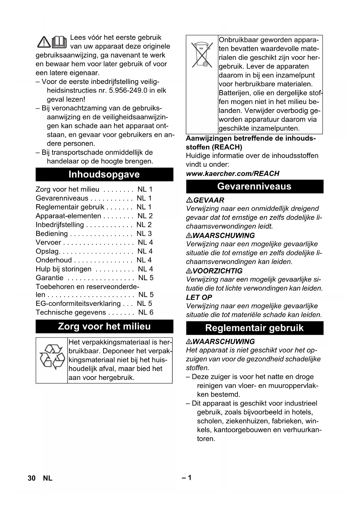 Codice com- ponente Lunghezza cavo EU 6.649-915.0 10 m GB 6.650-151.0 10 m CH 6.650-292.0 10 m AU 6.650-166.0 10 m 29IT– 1 Lees vóór het eerste gebruik van uw apparaat deze originele gebruiksaanwijzing, ga navenant te werk en bewaar hem voor later gebruik of voor een latere eigenaar. – Voor de eerste inbedrijfstelling veilig- heidsinstructies nr. 5.956-249.0 in elk geval lezen! – Bij veronachtzaming van de gebruiks- aanwijzing en de veiligheidsaanwijzin- gen kan schade aan het apparaat ont- staan, en gevaar voor gebruikers en an- dere personen. – Bij transportschade onmiddellijk de handelaar op de hoogte brengen. Aanwijzingen betreffende de inhouds- stoffen (REACH) Huidige informatie over de inhoudsstoffen vindt u onder: www.kaercher.com/REACH GEVAAR Verwijzing naar een onmiddellijk dreigend gevaar dat tot ernstige en zelfs dodelijke li- chaamsverwondingen leidt. 몇 WAARSCHUWING Verwijzing naar een mogelijke gevaarlijke situatie die tot ernstige en zelfs dodelijke li- chaamsverwondingen kan leiden. 몇 VOORZICHTIG Verwijzing naar een mogelijk gevaarlijke si- tuatie die tot lichte verwondingen kan leiden. LET OP Verwijzing naar een mogelijke gevaarlijke situatie die tot materiële schade kan leiden. 몇 WAARSCHUWING Het apparaat is niet geschikt voor het op- zuigen van voor de gezondheid schadelijke stoffen. – Deze zuiger is voor het natte en droge reinigen van vloer- en muuroppervlak- ken bestemd. – Dit apparaat is geschikt voor industrieel gebruik, zoals bijvoorbeeld in hotels, scholen, ziekenhuizen, fabrieken, win- kels, kantoorgebouwen en verhuurkan- toren. Inhoudsopgave Zorg voor het milieu . . . . . . . . NL 1 Gevarenniveaus . . . . . . . . . . . NL 1 Reglementair gebruik . . . . . . . NL 1 Apparaat-elementen . . . . . . . . NL 2 Inbedrijfstelling . . . . . . . . . . . . NL 2 Bediening . . . . . . . . . . . . . . . . NL 3 Vervoer . . . . . . . . . . . . . . . . . . NL 4 Opslag. . . . . . . . . . . . . . . . . . . NL 4 Onderhoud . . . . . . . . . . . . . . . NL 4 Hulp bij storingen . . . . . . . . . . NL 4 Garantie . . . . . . . . . . . . . . . . . NL 5 Toebehoren en reserveonderde- len . . . . . . . . . . . . . . . . . . . . . . NL 5 EG-conformiteitsverklaring . . . NL 5 Technische gegevens . . . . . . . NL 6 Zorg voor het milieu Het verpakkingsmateriaal is her- bruikbaar. Deponeer het verpak- kingsmateriaal niet bij het huis- houdelijk afval, maar bied het aan voor hergebruik. Onbruikbaar geworden appara- ten bevatten waardevolle mate- rialen die geschikt zijn voor her- gebruik. Lever de apparaten daarom in bij een inzamelpunt voor herbruikbare materialen. Batterijen, olie en dergelijke stof- fen mogen niet in het milieu be- landen. Verwijder overbodig ge- worden apparatuur daarom via geschikte inzamelpunten. Gevarenniveaus Reglementair gebruik 30 NL– 2 1 Elektroden 2 Zuigslang 3 Duwbeugel, verstelbaar 4 Vergrendeling van de zuigkop 5 Vuilreservoir 6 Zuigkop 7 Zwenkwiel 8Gestel 9 Luchtinlaatleidingen 10 Handgreep gestel 11 Vloersproeier 12 Zuigbuis 13 Handgreep 14 Slang- en kabelhaak 15 Filterafdekking 16 Elleboog 17 Draaischakelaar 18 Houder voor vloerspuitkop 19 Kiephulp 20 Typeplaatje 21 Aftapslang 22 Houder voor zuigbuizen 23 Netkabel 24 Bevestigingsschroef van de duwbeugel 25 Vlak harmonicafilter 26 Filterreiniging – Bedieningselementen voor het reini- gingsproces zijn geel. – Bedieningselementen voor het onder- houd en de service zijn lichtgrijs. LET OP Bij het zuigen mag de vlakvouwfilter nooit verwijderd worden. – Bij het opzuigen van fijn stof kan ook nog een papieren filterzak, een vliesfil- terzak of een membraanfilter gebruikt worden. Afbeelding Zuigkop ontgrendelen en wegnemen. Papierfilterzak, vliesfilterzak (bijzoon- dere accessoires) of membraanfilter (bijzondere accessoires) monteren. Zuigkop eropzetten en vergrendelen. LET OP Opletten bij wisselen van nat- naar droogzuigen: zuigen van droog stof met nat filterelement verstopt de filter en kan deze onbruikbaar maken. Nat filter vóór gebruik goed drogen of door een droog vervangen. Indien nodig de filter vervangen zoals beschreven in punt "Instandhouding en onderhoud". Instructie: Bij continu natzuigen raden wij aan om een vlakke PES-harmonicafilter te gebruiken (zie Filtersystemen). Afbeelding Borstelstrook demonteren. Rubber strippen inbouwen. Aanwijzing: De gestructueerde kant van de rubber strippen moet naar buiten wijzen. – Bij het opzuigen van nat vuil moet altijd de papierfilterzak, de vliesfilterzak (bij- zondere accessoires) of de membraan- filter (speciale accessoires) verwijderd worden. – Wij raden u aan een speciale filterzak (nat) te gebruiken (zie filtersystemen). Apparaat-elementen Kleurmarkering Inbedrijfstelling Droogzuigen Papieren filterzak/vliesfilterzak aanbrengen Omschakeling van nat- naar droogzuigen Natzuigen Inbouw rubber lippen Papieren filterzak/vliesfilterzak verwijderen 31NL– 3 몇 VOORZICHTIG Lokale voorschriften inzake de behande- ling van afvalwater in acht nemen. Apparaat met metaal reservoirs: Afbeelding Apparaat met kunstof reservoirs: Afbeelding Afvalwater aflaten via de aftapslang. – Bij het opzuigen van nat vuil met de stof- of voegkop, resp. indien er over- wegend water uit een container opge- zogen wordt, raden wij u aan om de functie 'Automatische filterreiniging' uit te zetten. – Bij het bereiken van de max. vulstand schakelt het apparaat automatisch uit. – Bij niet geleidende vloeistoffen (b.v. booremulsie, oliën en vetten) wordt het toestel bij een volle container niet uitschakeld. De vulstand moet voortdurend gecontroleerd worden en de container moet tijdig geleegd worden. – Na het stoppen met natzuigen: Vlak- vouwfilter samen met de filterreiniging schoonmaken. Elektrodes met een bor- stel schoonmaken. Reservoir met een vochtige doek schoonmaken en afdro- gen. Afbeelding De zuigslang is van een clip-systeem voor- zien. Alle C-40/C-DN-40 accessoires kun- nen worden aangesloten. Steek de netstekker in de contactdoos. Apparaat met de 