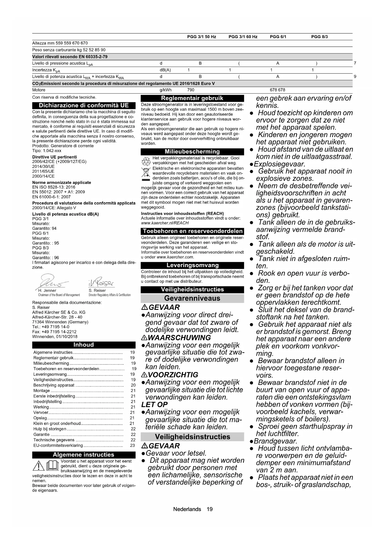 EN 55012: 2007 + A1: 2009 EN 61000-6-1: 2007 Procedura di valutazione della conformità applicata 2000/14/CE: Allegato V Livello di potenza acustica dB(A) PGG 3/1 Misurato: Garantito: 94 PGG 6/1 Misurato: Garantito: : 95 PGG 8/3 Misurato: Garantito: : 96 I firmatari agiscono per incarico e con delega della dire- zione. Responsabile della documentazione: S. Reiser Alfred Kärcher SE & Co. KG Alfred-Kärcher-Str. 28 - 40 71364 Winnenden (Germany) Tel.: +49 7195 14-0 Fax: +49 7195 14-2212 Winnenden, 01/10/2018 Inhoud Algemene instructies Voordat u het apparaat voor het eerst gebruikt, dient u deze originele ge- bruiksaanwijzing en de meegeleverde veiligheidsinstructies door te lezen en deze in acht te nemen. Bewaar beide documenten voor later gebruik of volgen- de eigenaars. Reglementair gebruik Deze stroomgenerator is in leveringstoestand voor ge- bruik op een hoogte van maximaal 1500 m boven zee- niveau bedoeld. Hij kan door een geautoriseerde klantenservice aan gebruik voor hogere niveaus wor- den aangepast. Als een stroomgenerator die aan gebruik op hogere ni- veaus werd aangepast onder deze hoogte wordt ge- bruikt, kan de motor door oververhitting onbruikbaar worden. Milieubescherming Het verpakkingsmateriaal is recyclebaar. Gooi verpakkingen met het gescheiden afval weg. Elektrische en elektronische apparaten bevatten waardevolle recyclebare materialen en vaak on- derdelen zoals batterijen, accu's of olie, die bij on- juiste omgang of verkeerd weggooien een mogelijk gevaar voor de gezondheid en het milieu kun- nen vormen. Voor een correct gebruik van het apparaat zijn deze onderdelen echter noodzakelijk. Apparaten met dit symbool mogen niet met het huisvuil worden weggegooid. Instructies voor inhoudsstoffen (REACH) Actuele informatie over inhoudsstoffen vindt u onder: www.kaercher.nl/REACH Toebehoren en reserveonderdelen Gebruik alleen origineel toebehoren en originele reser- veonderdelen. Deze garanderen een veilige en sto- ringsvrije werking van het apparaat. Informatie over toebehoren en reserveonderdelen vindt u onder www.kaercher.com. Leveringsomvang Controleer de inhoud bij het uitpakken op volledigheid. Bij ontbrekend toebehoren of bij transportschade neemt u contact op met uw distributeur. Veiligheidsinstructies Gevarenniveaus GEVAAR ●Aanwijzing voor direct drei- gend gevaar dat tot zware of dodelijke verwondingen leidt. 몇 WAARSCHUWING ●Aanwijzing voor een mogelijk gevaarlijke situatie die tot zwa- re of dodelijke verwondingen kan leiden. 몇 VOORZICHTIG ●Aanwijzing voor een mogelijk gevaarlijke situatie die tot lichte verwondingen kan leiden. LET OP ●Aanwijzing voor een mogelijk gevaarlijke situatie die tot ma- teriële schade kan leiden. Veiligheidsinstructies GEVAAR ●Gevaar voor letsel. ● Dit apparaat mag niet worden gebruikt door personen met een lichamelijke, sensorische of verstandelijke beperking of een gebrek aan ervaring en/of kennis. ● Houd toezicht op kinderen om ervoor te zorgen dat ze niet met het apparaat spelen. ● Kinderen en jongeren mogen het apparaat niet gebruiken. ● Houd afstand van de uitlaat en kom niet in de uitlaatgasstraal. ●Explosiegevaar. ● Gebruik het apparaat nooit in explosieve zones. ● Neem de desbetreffende vei- ligheidsvoorschriften in acht als u het apparaat in gevaren- zones (bijvoorbeeld tankstati- ons) gebruikt. ● Tank alleen de in de gebruiks- aanwijzing vermelde brand- stof. ● Tank alleen als de motor is uit- geschakeld. ● Tank niet in afgesloten ruim- ten. ● Rook en open vuur is verbo- den. ● Zorg er bij het tanken voor dat er geen brandstof op de hete oppervlakken terechtkomt. ● Sluit het deksel van de brand- stoftank na het tanken. ● Gebruik het apparaat niet als er brandstof is gemorst. Breng het apparaat naar een andere plek en voorkom vonkvor- ming. ● Bewaar brandstof alleen in hiervoor toegestane reser- voirs. ● Bewaar brandstof niet in de buurt van open vuur of appa- raten die een ontstekingsvlam hebben of vonken vormen (bij- voorbeeld kachels, verwar- mingsketels of boilers). ● Sproei geen starthulpspray in het luchtfilter. ●Brandgevaar. ● Houd tussen licht ontvlamba- re voorwerpen en de geluid- demper een minimumafstand van 2 m aan. ● Plaats het apparaat niet in een bos-, struik- of graslandschap, Altezza mm 559 559 670 670 Peso senza carburante kg 52 52 85 90 Valori rilevati secondo EN 60335-2-79 Livello di pressione acustica L