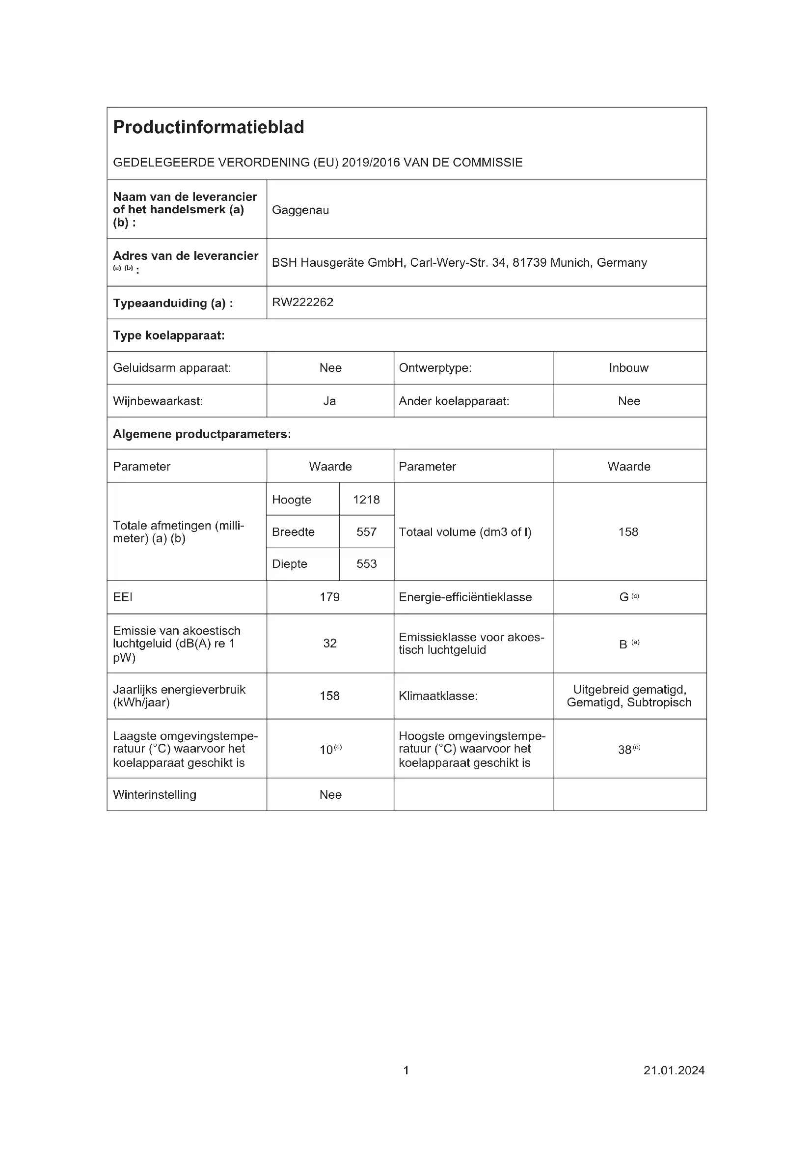 24 maanden Aanvullende informatie (a) (b) : Link naar de website van de leverancier met de informatie zoals bedoeld in punt 4 van bijlage II bij Verorde- ning (EU) 2019/2019 van de Commissie: www.gaggenau.com/energylabel (a) dit element wordt niet relevant geacht voor de toepassing van artikel 2, lid 6, van Verordening (EU) 2017/1369. (b) wijzigingen van deze elementen worden niet relevant geacht voor de toepassing van artikel 4, lid 4, van Verordening (EU) 2017/1369. (c) de leverancier voert deze gegevens niet in indien de productendatabank de definitieve inhoud van deze cel automatisch aanmaakt. (d) zoals vastgesteld overeenkomstig Gedelegeerde Verordening (EU) 2019/2015 van de Commissie.