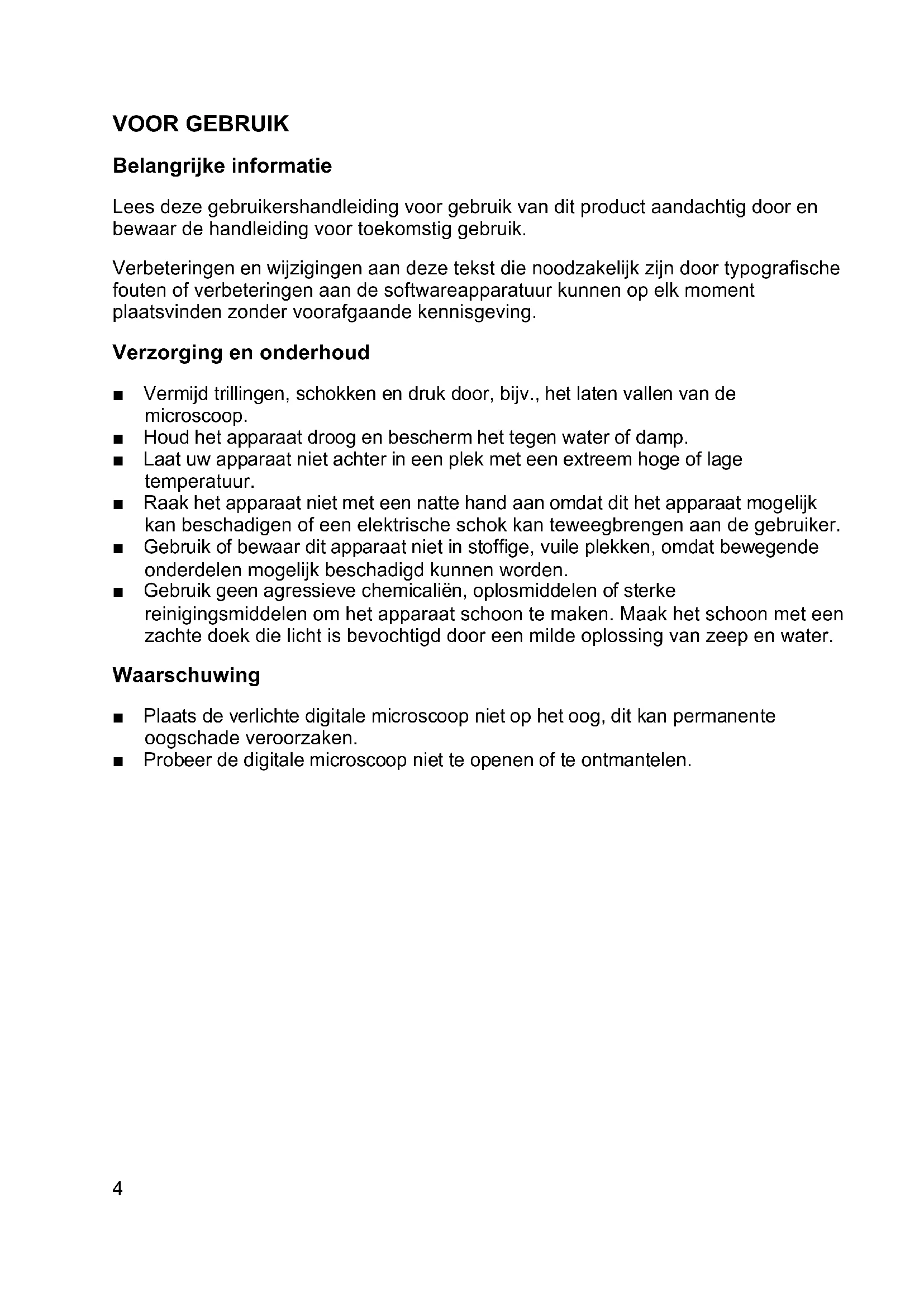 VOOR GEBRUIK Belangrijke informatie Lees deze gebruikershandleiding voor gebruik van dit product aandachtig door en bewaar de handleiding voor toekomstig gebruik. Verbeteringen en wijzigingen aan deze tekst die noodzakelijk zijn door typografische fouten of verbeteringen aan de softwareapparatuur kunnen op elk moment plaatsvinden zonder voorafgaande kennisgeving. Verzorging en onderhoud ■ Vermijd trillingen, schokken en druk door, bijv., het laten vallen van de microscoop. ■ Houd het apparaat droog en bescherm het tegen water of damp. ■ Laat uw apparaat niet achter in een plek met een extreem hoge of lage temperatuur. ■ Raak het apparaat niet met een natte hand aan omdat dit het apparaat mogelijk kan beschadigen of een elektrische schok kan teweegbrengen aan de gebruiker. ■ Gebruik of bewaar dit apparaat niet in stoffige, vuile plekken, omdat bewegende onderdelen mogelijk beschadigd kunnen worden. ■ Gebruik geen agressieve chemicaliën, oplosmiddelen of sterke reinigingsmiddelen om het apparaat schoon te maken. Maak het schoon met een zachte doek die licht is bevochtigd door een milde oplossing van zeep en water. Waarschuwing ■ Plaats de verlichte digitale microscoop niet op het oog, dit kan permanente oogschade veroorzaken. ■ Probeer de digitale microscoop niet te openen of te ontmantelen.5 Productbeschrijving ■ Dit product verschilt van een traditionele optische microscoop waarbij je door een oculair kijkt, door de weergave van een vergrote afbeelding of live video op een computerbeeldscherm via een USB-aansluiting. ■ Dit product heeft een geïntegreerde objectentorentje met zes verschillende objectlenzen. Bij het bekijken van de afbeelding op een 17" beeldscherm kan dit product specimens vergroten met 100x, 200x, 300x, 400x, 500x en 600x. De vergroting is afhankelijk van de grootte van het gebruikte beeldscherm - des te groter het beeldscherm, des te hoger de vergroting. ■ Opnames van de specimens kunnen worden vastgelegd met de knop momentopname aan de bovenzijde van het apparaat. Live video's en momentopnames kunnen ook worden vastgelegd en opgeslagen op de computer met de meegeleverde software. Computervereisten Op Windows gebaseerde PC Compatibele besturingssystemen