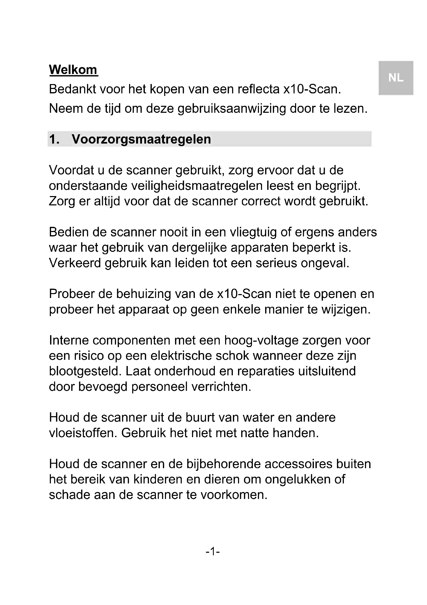 Voordat u de scanner gebruikt, zorg ervoor dat u de onderstaande veiligheidsmaatregelen leest en begrijpt. Zorg er altijd voor dat de scanner correct wordt gebruikt. Bedien de scanner nooit in een vliegtuig of ergens anders waar het gebruik van dergelijke apparaten beperkt is. Verkeerd gebruik kan leiden tot een serieus ongeval. Probeer de behuizing van de x10-Scan niet te openen en probeer het apparaat op geen enkele manier te wijzigen. Interne componenten met een hoog-voltage zorgen voor een risico op een elektrische schok wanneer deze zijn blootgesteld. Laat onderhoud en reparaties uitsluitend door bevoegd personeel verrichten. Houd de scanner uit de buurt van water en andere vloeistoffen. Gebruik het niet met natte handen. Houd de scanner en de bijbehorende accessoires buiten het bereik van kinderen en dieren om ongelukken of schade aan de scanner te voorkomen.-2-
