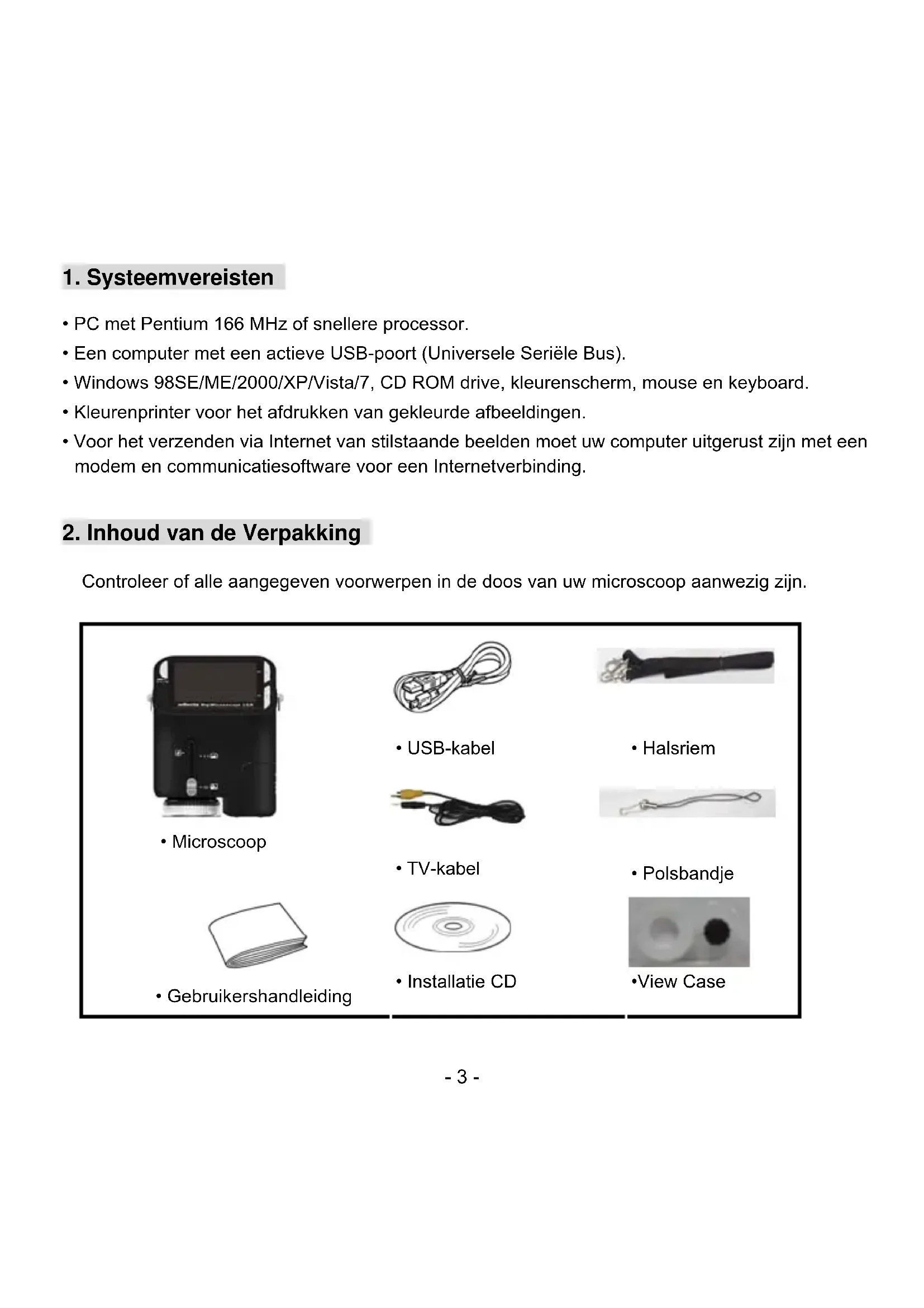 Accessoires USB-kabel, Gebruikershandleiding, CD software, Tv-kabel, View case Bijgesloten Software ArcSoft Media Impression™ 2.0 - 22 -Aan het einde van zijn leven mag u dit product niet bij het normale of huishoudelijke afval stoppen. Breng het product naar een bevoegd lozingscentrum voor de recycling van de elektrische en elektronische apparatuur of lever het apparaat voor verwerking bij de verkoper in. AEEA Richtlijn & Het Product Afdanken - 23 -Microscope