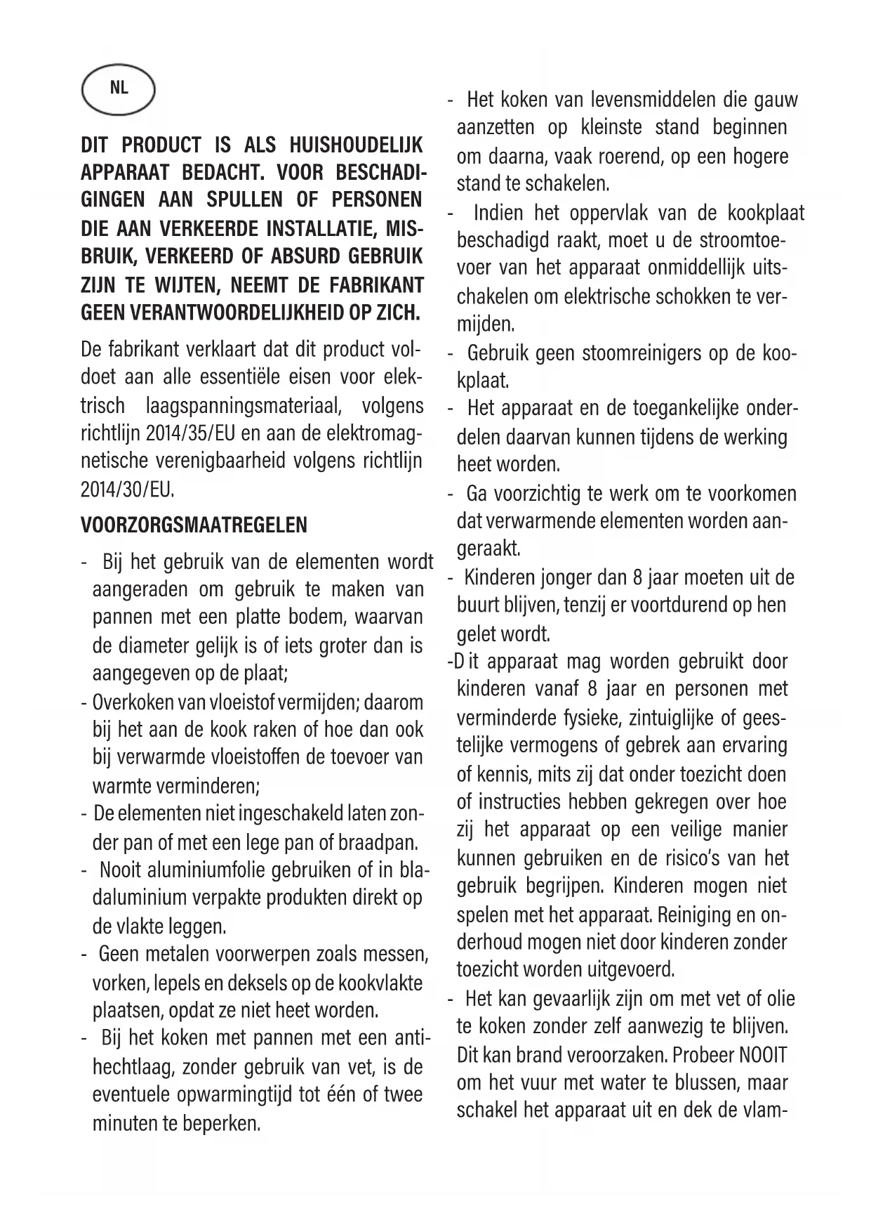 GEEN VERANTWOORDELIJKHEID OP ZICH. De fabrikant verklaart dat dit product vol- doet aan alle essentiële eisen voor elek- trisch laagspanningsmateriaal, volgens richtlijn 2014/35/EU en aan de elektromag- netische verenigbaarheid volgens richtlijn 2014/30/EU. VOORZORGSMAATREGELEN - Bij het gebruik van de elementen wordt aangeraden om gebruik te maken van pannen met een platte bodem, waarvan de diameter gelijk is of iets groter dan is aangegeven op de plaat;