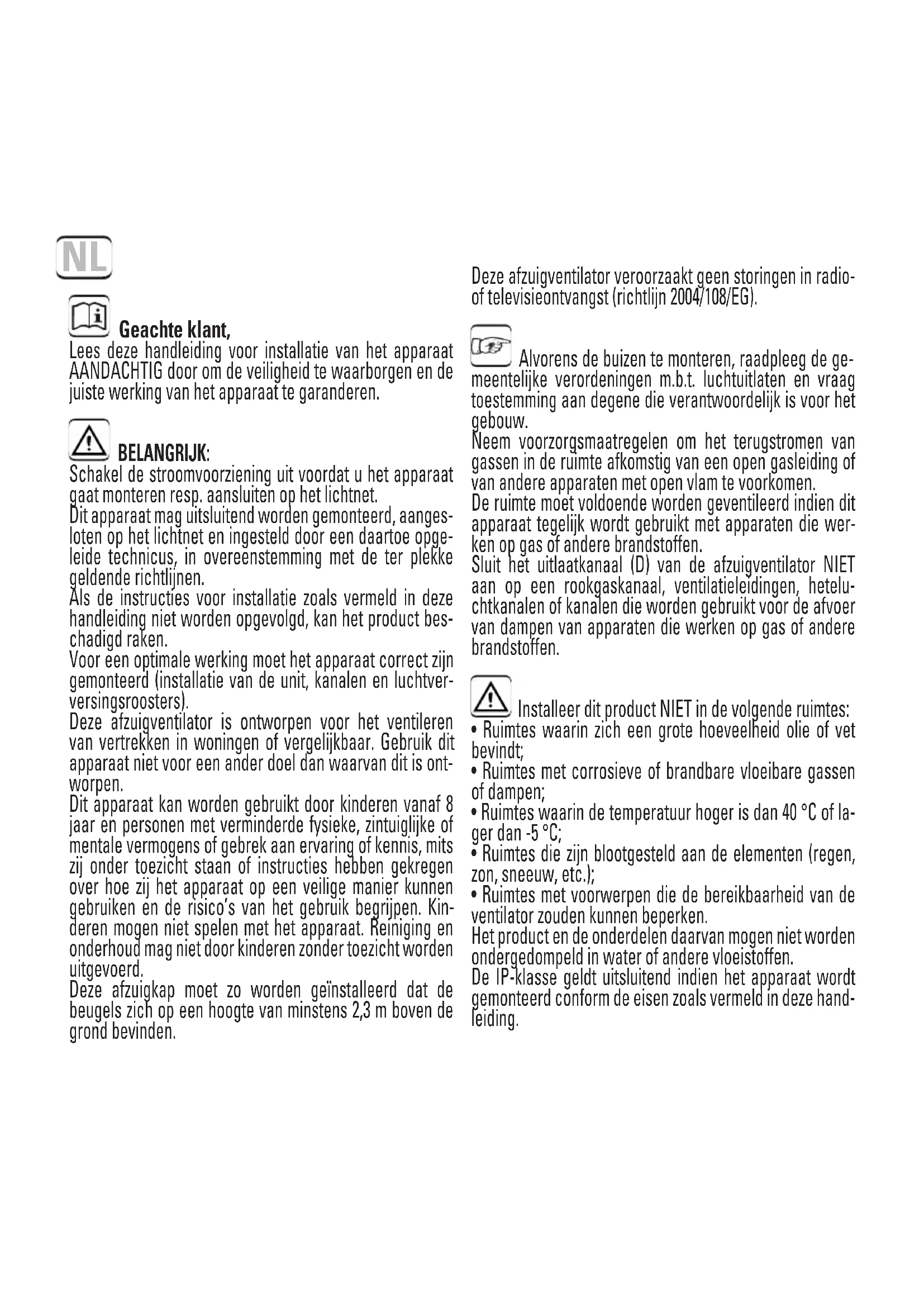 - Ruimtes met voorwerpen die de bereikbaarheid van de ventilator zouden kunnen beperken. Het product en de onderdelen daarvan mogen niet worden ondergedompeld in water of andere vloeistoffen. De IP-klasse geldt uitsluitend indien het apparaat wordt gemonteerd conform de eisen zoals vermeld in deze hand- leiding. Geachte klant, Lees deze handleiding voor installatie van het apparaat AANDACHTIG door om de veiligheid te waarborgen en de juiste werking van het apparaat te garanderen. BELANGRIJK: Schakel de stroomvoorziening uit voordat u het apparaat gaat monteren resp. aansluiten op het lichtnet. Dit apparaat mag uitsluitend worden gemonteerd, aanges- loten op het lichtnet en ingesteld door een daartoe opge- leide technicus, in overeenstemming met de ter plekke geldende richtlijnen. Als de instructies voor installatie zoals vermeld in deze handleiding niet worden opgevolgd, kan het product bes- chadigd raken. Voor een optimale werking moet het apparaat correct zijn gemonteerd (installatie van de unit, kanalen en luchtver- versingsroosters). Deze afzuigventilator is ontworpen voor het ventileren van vertrekken in woningen of vergelijkbaar. Gebruik dit apparaat niet voor een ander doel dan waarvan dit is ont- worpen. Dit apparaat kan worden gebruikt door kinderen vanaf 8 jaar en personen met verminderde fysieke, zintuiglijke of mentale vermogens of gebrek aan ervaring of kennis, mits zij onder toezicht staan of instructies hebben gekregen over hoe zij het apparaat op een veilige manier kunnen gebruiken en de risico’s van het gebruik begrijpen. Kin- deren mogen niet spelen met het apparaat. Reiniging en onderhoud mag niet door kinderen zonder toezicht worden uitgevoerd. Deze afzuigkap moet zo worden geïnstalleerd dat de beugels zich op een hoogte van minstens 2,3 m boven de grond bevinden. NLDe fabrikant is niet verantwoordelijk voor persoonlijk letsel, negatieve gevolgen voor dieren of materiële schade te wijten aan onoordeelkundig gebruik van het apparaat zoals vermeld in de waarschuwingen m.b.t. installatie, gebruik en onder- houd in deze handleiding. Na installatie moeten deze instructies worden overhan- digd aan de eigenaar/gebruiker van het apparaat. Het moet mogelijk zijn om het apparaat te ontkoppelen van de netstroom na de installatie. U kunt het apparaat ontkoppelen door ervoor te zorgen dat het stopcontact bereikbaar is of door een schakelaar in de vaste bedrading tussen te voegen die voldoet aan de normen van elektrische installaties. INSTALLATIE: Voordat u met de installatie begint, moet u controleren of de schroef niet vervormd noch beschadigd is, dat ze vrij kan draaien en dat er zich geen enkel vreemd voorwerp aan de binnenkant van de behuizing bevindt. Het apparaat moet worden geïnstalleerd zoals weergegeven in de bijgevoegde illus- tratie. Er kan worden gekozen voor installatie tegen een muur of onder het plafond, met rechtstreekse afvoer naar een apart afvoerkanaal (zie fig. 1A) Om over te gaan tot het installeren dient u in de muur of het plafond waar u het appa- raat wilt installeren een ronde opening te maken waarvan de diameter overeenkomt met het model dat u wilt installeren (100mm; 120mm of 150mm), naast gaten voor de bevestiging daarvan (zie afb. 2). Verwijder het deksel zoals afgebeeld in fig. 1B Leid de aansluitdraden via het gedeelte gemarkeerd met ‘PC’ en de doorvoer in het apparaat (zie fig. 3A). Sluit het apparaat aan zoals vermeld onder ‘ELEKTRISCHE AANSLUITING’ Als het apparaat wordt gemonteerd met een losse afvoerbuis, plaats dan de buis (D) in het gat dat u zojuist heeft aangebracht voor de afzuigventilator. Als bij installatie gebruik wordt gemaakt van losse afvoerbuis of een directe uitlaat, dan moeten luchtroosters worden gemonteerd die voldoen aan de landelijk geldende vei- ligheidsrichtlijnen om te voorkomen dat de ventilatorbladen bereikbaar zijn (zie fig. 1A). Controleer of er zich geen obstakels in de luchtstroom bevinden. Bevestig de basisunit met de door de fabrikant bijgeleverde pluggen en schroeven. ELEKTRISCHE AANSLUITING: Controleer of de spanning (V) en frequentie (Hz) van de stroomvoorziening overeenko- men met de waarden zoals vermeld op het typeplaatje. Het apparaat moet permanent aangesloten worden met vaste bedrading, die in de muur wordt gelegd en het apparaat via de achterzijde binnenkomt. (Kabel getipt of stijve, 2 of 3 geleiders minimale doorsnede van 1 mm