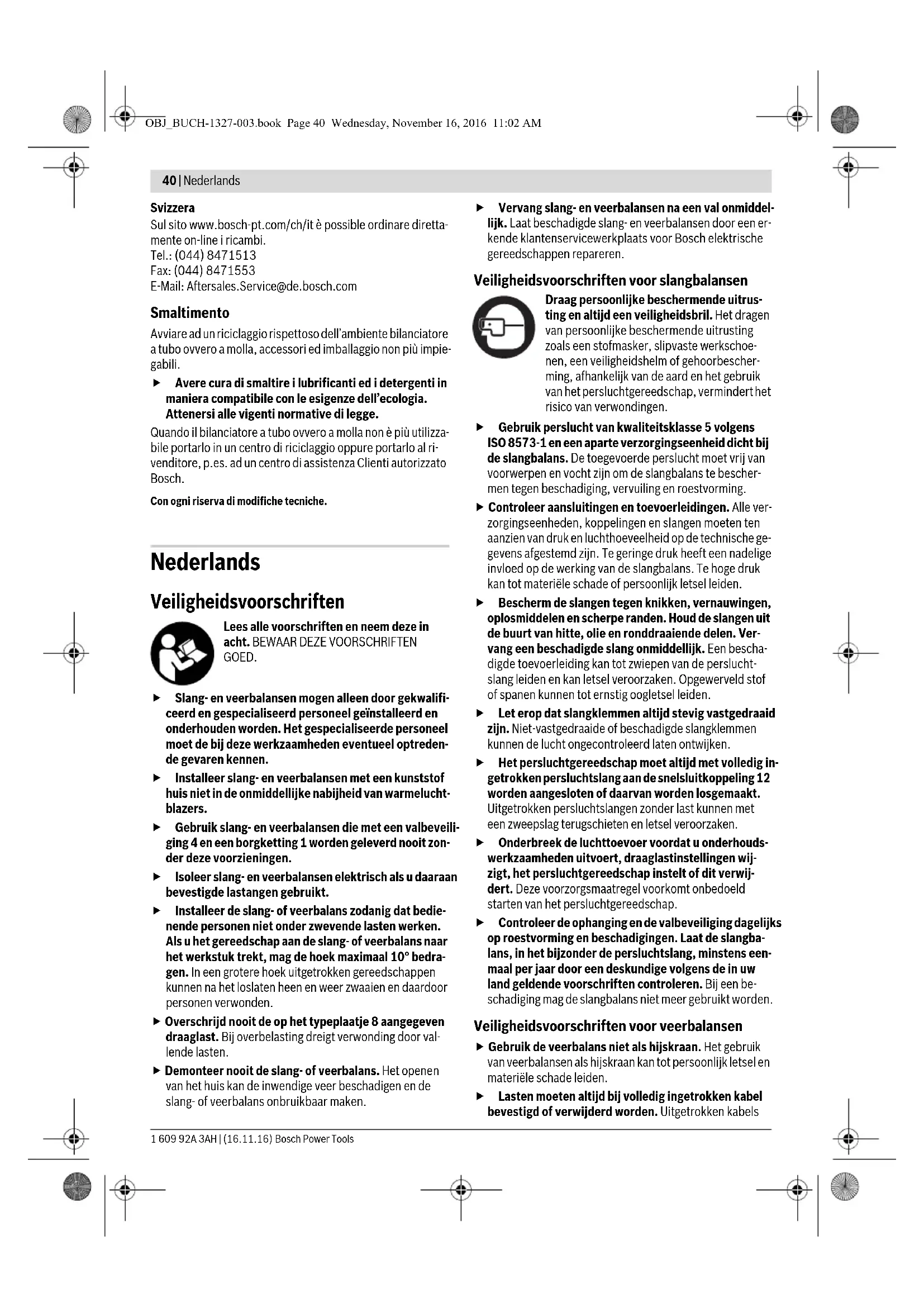 - Durante la regolazione del carico portare guanti di pro- tezione e tenere ben salda la chiave per esagono cavo. In caso di regolazione massima del carico la molla della re- golazione del carico si trova sotto notevole tensione che può scaricarsi improvvisamente premendo la chiave per esagono cavo. Inserire la chiave per esagono cavo 9 nell’incavo della molla della regolazione del carico 6. Per ridurre la forza di ritorno premere l’incavo della molla verso l’interno e ruotare in senso antiorario la chiave per esa- gono cavo 9. Per aumentare la forza di ritorno premere l’incavo della mol- la verso l’interno e ruotare in senso orario la chiave per esago- no cavo 9. – Nel tipo 0 607 950 957 massimo 11 giri. – Nel tipo 0 607 950 958 massimo 5 giri. Manutenzione ed assistenza Manutenzione e pulizia Bilanciatori a tubo Interrompere l’alimentazione di aria prima di effettua- re interventi di manutenzione, eseguire operazioni di regolazione del carico oppure collegare o rimuovere l’utensile pneumatico. Questa misura preventiva impedi- sce l’avvio accidentale dell’utensile pneumatico. Controllare giornalmente la sospensione e la protezio- ne contro la caduta in merito a corrosione e danneggia- menti. Fare controllare almeno una volta all’anno da un esperto il bilanciatore a tubo, in modo particolare il tu- bo flessibile dell’aria compressa, secondo le rispettive norme relative specifiche del paese di impiego. In caso di danneggiamento il bilanciatore a tubo non deve essere utilizzato ulteriormente. Ingrassare le parti mobili esterne come i punti di attrito sulla sospensione 2 e la protezione contro la caduta 4. Pulire regolarmente il filtro all’entrata dell’aria del bilanciatore a tubo. Per effettuare questa operazione svitare il raccordo per tubo 14 e rimuovere le particelle di polvere e sporcizia dal filtro. Al termine avvitare di nuovo saldamente il raccordo per tubo. Per evitare danneggiamenti alle parti interne della valvola del bilanciatore a tubo sarebbe necessario durante l’avvitamento e lo svitamento del raccordo per tubo 14 tenere fermo al rac- cordo di collegamento sporgente all’entrata dell’aria 7 con una chiave fissa (apertura della chiave 17 mm). Osservare la raccomandazione per additivi per l’aria compressa riportata nelle istruzioni per l’uso dell’utensile pneumatico utilizzato sul bilan- ciatore a tubo! Bilanciatori a molla Controllare giornalmente la fune, la sospensione e la protezione contro la caduta (se presente) in merito a corrosione e danneggiamenti. Fare controllare almeno una volta all’anno da un esperto il bilanciatore a molla, in modo particolare la fune, secondo ISO 4309. In caso di danneggiamento il bilanciatore a molla non deve essere utilizzato ulteriormente. Ingrassare le parti mobili esterne come i punti di attrito sulla sospensione 2 e la protezione contro la caduta 4. La cura della fune con un grasso privo di acidi (vaselina) au- menta la durata della stessa. Accessori Visitando i siti www.bosch-pt.com e www.boschproductiontools.com, oppure rivolgendo Vi al Vo- stro rivenditore di fiducia è possibile informarsi sulla comple- ta gamma dei prodotti di accessori di qualità. Assistenza clienti e consulenza impieghi Il servizio di assistenza risponde alle Vostre domande relative alla riparazione ed alla manutenzione del Vostro prodotto nonché concernenti le parti di ricambio. Disegni in vista esplosa ed informazioni relative alle parti di ricambio sono consultabili anche sul sito: www.bosch-pt.com Il team Bosch che si occupa della consulenza impieghi vi aiu- terà in caso di domande relative ai nostri prodotti ed ai loro accessori. In caso di richieste o di ordinazione di pezzi di ricambio, comunicare sempre il codice prodotto a 10 cifre riportato sulla targhetta di fabbricazione del prodotto. Italia Officina Elettroutensili Robert Bosch S.p.A. Corso Europa 2/A 20020 LAINATE (MI) Tel.: (02) 3696 2663 Fax: (02) 3696 2662 Fax: (02) 3696 8677 E-Mail: officina.elettroutensili@it.bosch.com OBJ_BUCH-1327-003.book Page 39 Wednesday, November 16, 2016 11:02 AM40 | Nederlands 1 609 92A 3AH | (16.11.16) Bosch Power Tools Svizzera Sul sito www.bosch-pt.com/ch/it è possible ordinare diretta- mente on-line i ricambi. Tel.: (044) 8471513 Fax: (044) 8471553 E-Mail: Aftersales.Service@de.bosch.com Smaltimento Avviare ad un riciclaggio rispettoso dell’ambiente bilanciatore a tubo ovvero a molla, accessori ed imballaggio non più impie- gabili. Avere cura di smaltire i lubrificanti ed i detergenti in maniera compatibile con le esigenze dell’ecologia. Attenersi alle vigenti normative di legge. Quando il bilanciatore a tubo ovvero a molla non è più utilizza- bile portarlo in un centro di riciclaggio oppure portarlo al ri- venditore, p.es. ad un centro di assistenza Clienti autorizzato Bosch. Con ogni riserva di modifiche tecniche. Nederlands Veiligheidsvoorschriften Lees alle voorschriften en neem deze in acht. BEWAAR DEZE VOORSCHRIFTEN GOED. Slang- en veerbalansen mogen alleen door gekwalifi- ceerd en gespecialiseerd personeel geïnstalleerd en onderhouden worden. Het gespecialiseerde personeel moet de bij deze werkzaamheden eventueel optreden- de gevaren kennen. Installeer slang- en veerbalansen met een kunststof huis niet in de onmiddellijke nabijheid van warmelucht- blazers. Gebruik slang- en veerbalansen die met een valbeveili- ging 4 en een borgketting 1 worden geleverd nooit zon- der deze voorzieningen. Isoleer slang- en veerbalansen elektrisch als u daaraan bevestigde lastangen gebruikt. Installeer de slang- of veerbalans zodanig dat bedie- nende personen niet onder zwevende lasten werken. Als u het gereedschap aan de slang- of veerbalans naar het werkstuk trekt, mag de hoek maximaal 10° bedra- gen. In een grotere hoek uitgetrokken gereedschappen kunnen na het loslaten heen en weer zwaaien en daardoor personen verwonden. Overschrijd nooit de op het typeplaatje 8 aangegeven draaglast. Bij overbelasting dreigt verwonding d