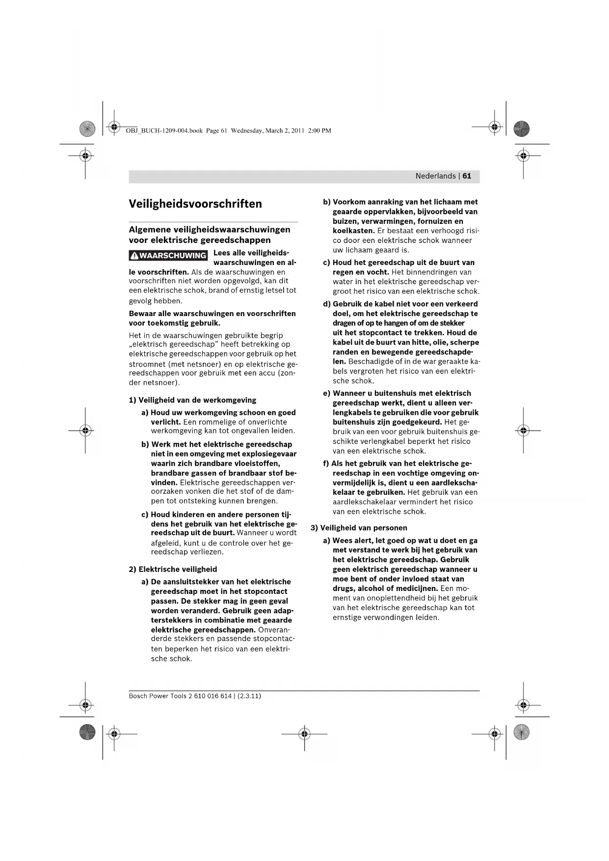 bruik van elektrische gereedschappen a) Overbelast het gereedschap niet. Ge- bruik voor uw werkzaamheden het daar- voor bestemde elektrische gereedschap. Met het passende elektrische gereed- schap werkt u beter en veiliger binnen het aangegeven capaciteitsbereik. b) Gebruik geen elektrisch gereedschap waarvan de schakelaar defect is. Elek- trisch gereedschap dat niet meer kan wor- den in- of uitgeschakeld, is gevaarlijk en moet worden gerepareerd. c) Trek de stekker uit het stopcontact of neem de accu uit het elektrische gereed- schap voordat u het gereedschap instelt, toebehoren wisselt of het gereedschap weglegt. Deze voorzorgsmaatregel voor- komt onbedoeld starten van het elektri- sche gereedschap. d) Bewaar niet-gebruikte elektrische ge- reedschappen buiten bereik van kinde- ren. Laat het gereedschap niet gebrui- ken door personen die er niet mee vertrouwd zijn en deze aanwijzingen niet hebben gelezen. Elektrische gereed- schappen zijn gevaarlijk wanneer deze door onervaren personen worden ge- bruikt. e) Verzorg het elektrische gereedschap zorgvuldig. Controleer of bewegende de- len van het gereedschap correct functio- neren en niet vastklemmen en of onder- delen zodanig gebroken of beschadigd zijn dat de werking van het elektrische gereedschap nadelig wordt beïnvloed. Laat deze beschadigde onderdelen voor het gebruik repareren. Veel ongevallen hebben hun oorzaak in slecht onderhou- den elektrische gereedschappen. f) Houd snijdende inzetgereedschappen scherp en schoon. Zorgvuldig onderhou- den snijdende inzetgereedschappen met scherpe snijkanten klemmen minder snel vast en zijn gemakkelijker te geleiden. OBJ_BUCH-1209-004.book Page 62 Wednesday, March 2, 2011 2:00 PMNederlands | 63 Bosch Power Tools 2 610 016 614 | (2.3.11) g) Gebruik elektrisch gereedschap, toebe- horen, inzetgereedschappen en dergelij- ke volgens deze aanwijzingen. Let daar- bij op de arbeidsomstandigheden en de uit te voeren werkzaamheden. Het ge- bruik van elektrische gereedschappen voor andere dan de voorziene toepassin- gen kan tot gevaarlijke situaties leiden.