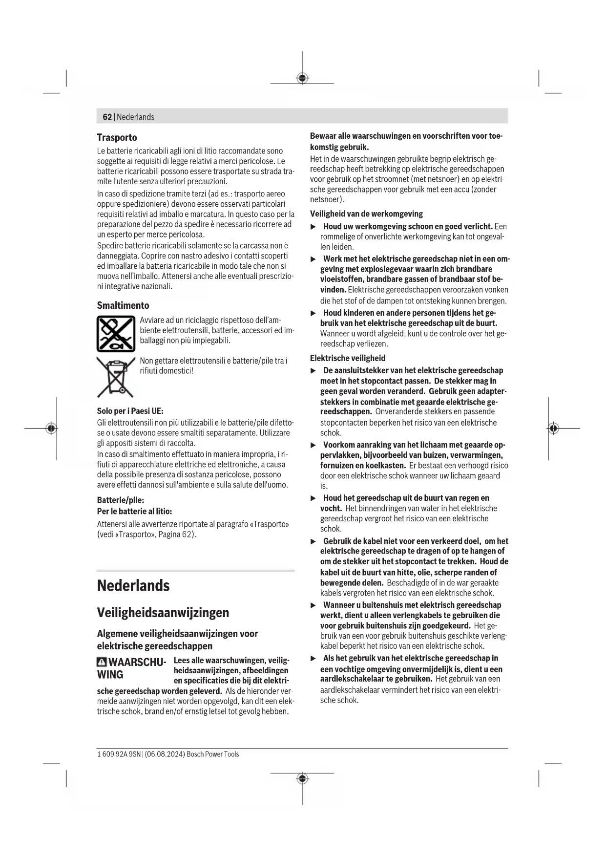 Per contrassegnare coppie di serraggio specifiche, l’anello di marcatura (17) si potrà sostituire con uno di altro colore. – Espellere l’anello di marcatura (17), utilizzando una lama sottile di cacciavite, una spatola o un oggetto simile. 1 609 92A 9SN | (06.08.2024) Bosch Power ToolsItaliano | 61 Accensione/spegnimento Gli avvitatori sono dotati di una frizione a stacco automatico proporzionale alla coppia di serraggio, regolabile nel campo indicato. Ta- le frizione interviene al raggiungimento della coppia di serraggio impostata. – Per accendere l’elettroutensile, spingere l’interruttore di avvio/arresto(10) sino a fine corsa. – L’elettroutensile si arresterà automaticamente al rag- giungimento della coppia di serraggio impostata. u Rilasciando in anticipo l’interruttore di avvio/arresto (10), la coppia di serraggio preimpostata non verrà raggiunta. u Verificare con regolarità la coppia di serraggio del col- legamento a vite e, all’occorrenza, regolare nuova- mente la frizione a stacco automatico. Accensione della lampada da lavoro La lampada da lavoro (13) consente d’illuminare il punto di avvitamento in condizioni di luminosità sfavorevoli. La lam- pada da lavoro (13) si accenderà premendo leggermente l’interruttore di avvio/arresto (10). Premendo maggiormen- te l'interruttore di avvio/arresto, si accenderà anche l’elet- troutensile e la lampada da lavoro resterà accesa a sua volta. u Non rivolgere direttamente lo sguardo verso luce di la- voro: vi è rischio di abbagliamento. Indicazioni operative u Applicare l’elettroutensile sul dado/sulla vite esclusi- vamente quando è spento. Gli utensili accessori in rota- zione possono scivolare. Indicatore avvitamenti (LED verde/rosso) Al raggiungimento della coppia preimpostata, la frizione a stacco automatico si attiverà. L’indicatore a LED (7) si ac- cenderà con luce verde. Se la coppia di serraggio preimpostata non è stata raggiunta, l’indicatore a LED (7) si accenderà con luce rossa e verrà emesso un segnale acustico. L’avvitamento dovrà essere eseguito nuovamente. Protezione dalle ripetizioni Se durante un avvitamento la frizione a stacco automatico è stata attivata, il motore si spegne. Il riavvio sarà possibile soltanto dopo 0,7 secondi di pausa. In tale modo si eviteran- no serraggi accidentali di avvitamenti già saldi. Manutenzione ed assistenza Manutenzione e pulizia u Prima di qualsiasi intervento sull’elettroutensile (ad es. per manutenzione, sostituzione dell’accessorio ecc.), prelevare la batteria. Qualora l’interruttore di av- vio/arresto venga premuto inavvertitamente, vi è rischio di lesioni. u Per poter garantire buone e sicure operazioni di lavo- ro, tenere sempre puliti l’elettroutensile e le fessure di ventilazione. Lubrificazione dell’elettroutensile Lubrificante: Grasso speciale per trasmissioni (225 ml) Codice prodotto 3 605 430 009 Grasso Molykote Olio motore SAE 10/SAE 20 – Dopo le prime 150 ore di funzionamento, pulire la tra- smissione utilizzando un solvente non aggressivo. Atte- nersi alle indicazioni del produttore del solvente relativa- mente all’uso ed allo smaltimento. Al termine dell’opera- zione, lubrificare la trasmissione, utilizzando l’apposito grasso Bosch. Ripetere l’operazione di pulizia rispettiva- mente dopo 300 ore di funzionamento dalla prima opera- zione di pulizia. – Dopo 100.000 avvitamenti, oliare le parti mobili della fri- zione a stacco automatico con alcune gocce di olio moto- re SAE 10/SAE 20. Lubrificare gli elementi radenti e vol- venti con grasso Molykote. In questa occasione, controlla- re lo stato di usura della frizione in modo da essere sicuri che non vi siano condizionamenti per la ripetibilità e la precisione. Al termine dell’operazione si deve correggere la registrazione della coppia della frizione. u Far eseguire gli interventi di manutenzione e di ripara- zione esclusivamente da personale specializzato. In questo modo verrà salvaguardata la sicurezza dell’elet- troutensile. Questo tipo di lavoro viene eseguito in maniera veloce ed af- fidabile da ogni Centro di assistenza Clienti Bosch. u Smaltire lubrificanti e detergenti nel rispetto dell’am- biente. Attenersi alle vigenti normative di legge. u Dopo massimo 100000 avvitamenti, controllare che l’elettroutensile non presenti danni o usura nella sua interezza e verificare tutte le funzioni. Successiva- mente, regolare nuovamente la coppia della frizione. Servizio di assistenza e consulenza tecnica Il servizio di assistenza risponde alle Vostre domande relati- ve alla riparazione ed alla manutenzione del Vostro prodotto nonché concernenti le parti di ricambio. Disegni esplosi ed informazioni relative alle parti di ricambio sono consultabili anche sul sito: www.bosch‑pt.com Il team Bosch che si occupa della consulenza impieghi vi aiu- terà in caso di domande relative ai nostri prodotti ed ai loro accessori. In caso di richieste o di ordinazione di pezzi di ricambio, co- municare sempre il codice prodotto a 10cifre riportato sulla targhetta di identificazione del prodotto. Italia Tel.: (02) 3696 2314 E-Mail: pt.hotlinebosch@it.bosch.com Ulteriori indirizzi per l'assistenza sono indicati sotto: www.bosch-pt.com/serviceaddresses Bosch Power Tools 1 609 92A 9SN | (06.08.2024)62 | Nederlands Trasporto Le batterie ricaricabili agli ioni di litio raccomandate sono soggette ai requisiti di legge relativi a merci pericolose. Le batterie ricaricabili possono essere trasportate su strada tra- mite l’utente senza ulteriori precauzioni. In caso di spedizione tramite terzi (ad es.: trasporto aereo oppure spedizioniere) devono essere osservati particolari requisiti relativi ad imballo e marcatura. In questo caso per la preparazione del pezzo da spedire è necessario ricorrere ad un esperto per merce pericolosa. Spedire batterie ricaricabili solamente se la carcassa non è danneggiata. Coprire con nastro adesivo i contatti scoperti ed imballare la batteri