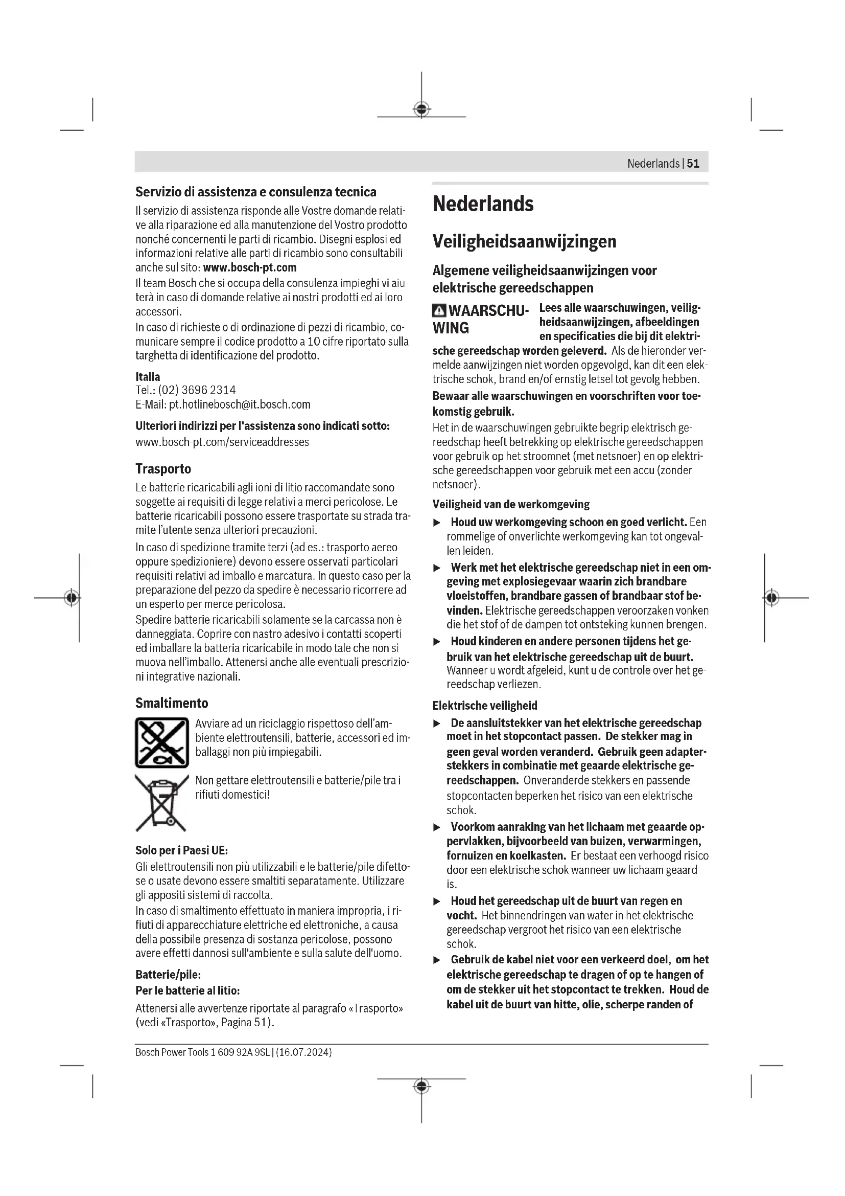 – Rotazione destrorsa: per avvitare viti, spingere verso si- nistra fino all’arresto il commutatore del senso di rotazio- ne (6). – Rotazione sinistrorsa: per allentare o svitare viti, spinge- re verso destra fino all’arresto il commutatore del senso di rotazione (6). Regolazione della coppia di serraggio (vedere Fig. D) La coppia dipende dalla tensione della molla della frizione a stacco automatico. La frizione a stacco automatico si attiva sia in senso sinistrorso sia in senso destrorso una volta rag- giunta la coppia precedentemente impostata. Per regolare la specifica coppia di serraggio, utilizzare esclu- sivamente l’apposito attrezzo (14), compreso in dotazione. – Spingere completamente all’indietro il corsoio (4) dell’elettroutensile. – Innestare l’attrezzo di regolazione (14) nell’attacco uten- sile (1) e ruotarlo lentamente. – Non appena, nell’apertura del corpo, sia visibile una pic- cola convessità (rondella di regolazione (15)) all’interno della frizione, innestare l’attrezzo di regolazione (14) in tale convessità e ruotarlo. Ruotando in senso orario si registra un momento di coppia maggiore, ruotando in senso antiorario si registra un mo- mento di coppia minore. – Prelevare l’attrezzo di regolazione (14). Spingere nuova- mente in avanti il corsoio (4), per proteggere la frizione dallo sporco. Avvertenza: La regolazione varia in base al tipo di collega- mento a vite e andrà determinata preferibilmente con una prova pratica. Controllare gli avvitamenti di prova utilizzando una chiave torsiometrica. Bosch Power Tools 1 609 92A 9SL | (16.07.2024)50 | Italiano u Registrare il valore di coppia esclusivamente nell’am- bito della potenza indicata, perché altrimenti la frizio- ne a stacco automatico non può più inserirsi. u Verificare con regolarità la coppia di serraggio del col- legamento a vite e, all’occorrenza, regolare nuova- mente la frizione a stacco automatico. Contrassegnatura dell'impostazione della coppia di serraggio (vedere Fig. E) Utilizzare sempre l’elettroutensile con un anello di marcatu- ra, per essere certi che il corpo sia protetto contro polvere e sporco. Per contrassegnare coppie di serraggio specifiche, l’anello di marcatura (16) potrà essere sostituito con uno di altro colo- re. – Espellere l’anello di marcatura (16), utilizzando una sotti- le lama di cacciavite, una spatola o un oggetto simile. Accensione/spegnimento Gli avvitatori sono dotati di una frizione a stacco automatico proporzionale alla coppia di serraggio, regolabile nel campo indicato. Ta- le frizione interviene al raggiungimento della coppia di serraggio impostata. – Per accendere l’elettroutensile, spingere l’interruttore di avvio/arresto(5) sino a fine corsa. – L’elettroutensile si arresterà automaticamente al rag- giungimento della coppia di serraggio impostata. u Rilasciando in anticipo l’interruttore di avvio/arresto (5), la coppia di serraggio preimpostata non verrà rag- giunta. u Verificare con regolarità la coppia di serraggio del col- legamento a vite e, all’occorrenza, regolare nuova- mente la frizione a stacco automatico. Accensione della lampada da lavoro La lampada da lavoro (3) consente d’illuminare il punto di avvitamento in condizioni di luminosità sfavorevoli. La lam- pada da lavoro (3) si accenderà premendo leggermente l’in- terruttore di avvio/arresto (5). Premendo maggiormente l'in- terruttore di avvio/arresto, si accenderà anche l’elettrouten- sile e la lampada da lavoro resterà accesa a sua volta. u Non rivolgere direttamente lo sguardo verso luce di la- voro: vi è rischio di abbagliamento. Indicazioni operative u Applicare l’elettroutensile sul dado/sulla vite esclusi- vamente quando è spento. Gli utensili accessori in rota- zione possono scivolare. Indicatore avvitamenti (LED verde/rosso) Al raggiungimento della coppia preimpostata, la frizione a stacco automatico si attiverà. L’indicatore a LED (8) si ac- cenderà con luce verde. Se la coppia di serraggio preimpostata non è stata raggiunta, l’indicatore a LED (8) si accenderà con luce rossa e verrà emesso un segnale acustico. L’avvitamento dovrà essere eseguito nuovamente. Protezione dalle ripetizioni Se durante un avvitamento la frizione a stacco automatico è stata attivata, il motore si spegne. Il riavvio sarà possibile soltanto dopo 0,7 secondi di pausa. In tale modo si eviteran- no serraggi accidentali di avvitamenti già saldi. Manutenzione ed assistenza Manutenzione e pulizia u Prima di qualsiasi intervento sull’elettroutensile (ad es. per manutenzione, sostituzione dell’accessorio ecc.), prelevare la batteria. Qualora l’interruttore di av- vio/arresto venga premuto inavvertitamente, vi è rischio di lesioni. u Per poter garantire buone e sicure operazioni di lavo- ro, tenere sempre puliti l’elettroutensile e le fessure di ventilazione. Lubrificazione dell’elettroutensile Lubrificante: Grasso speciale per trasmissioni (225 ml) Codice prodotto 3 605 430 009 Grasso Molykote Olio motore SAE 10/SAE 20 – Dopo le prime 150 ore di funzionamento, pulire la tra- smissione utilizzando un solvente non aggressivo. Atte- nersi alle indicazioni del produttore del solvente relativa- mente all’uso ed allo smaltimento. Al termine dell’opera- zione, lubrificare la trasmissione, utilizzando l’apposito grasso Bosch. Ripetere l’operazione di pulizia rispettiva- mente dopo 300 ore di funzionamento dalla prima opera- zione di pulizia. – Dopo 100.000 avvitamenti, oliare le parti mobili della fri- zione a stacco automatico con alcune gocce di olio moto- re SAE 10/SAE 20. Lubrificare gli elementi radenti e vol- venti con grasso Molykote. In questa occasione, controlla- re lo stato di usura della frizione in modo da essere sicuri che non vi siano condizionamenti per la ripetibilità e la precisione. Al termine dell’operazione si deve correggere la registrazione della coppia della frizione. u Far eseguire gli interventi d