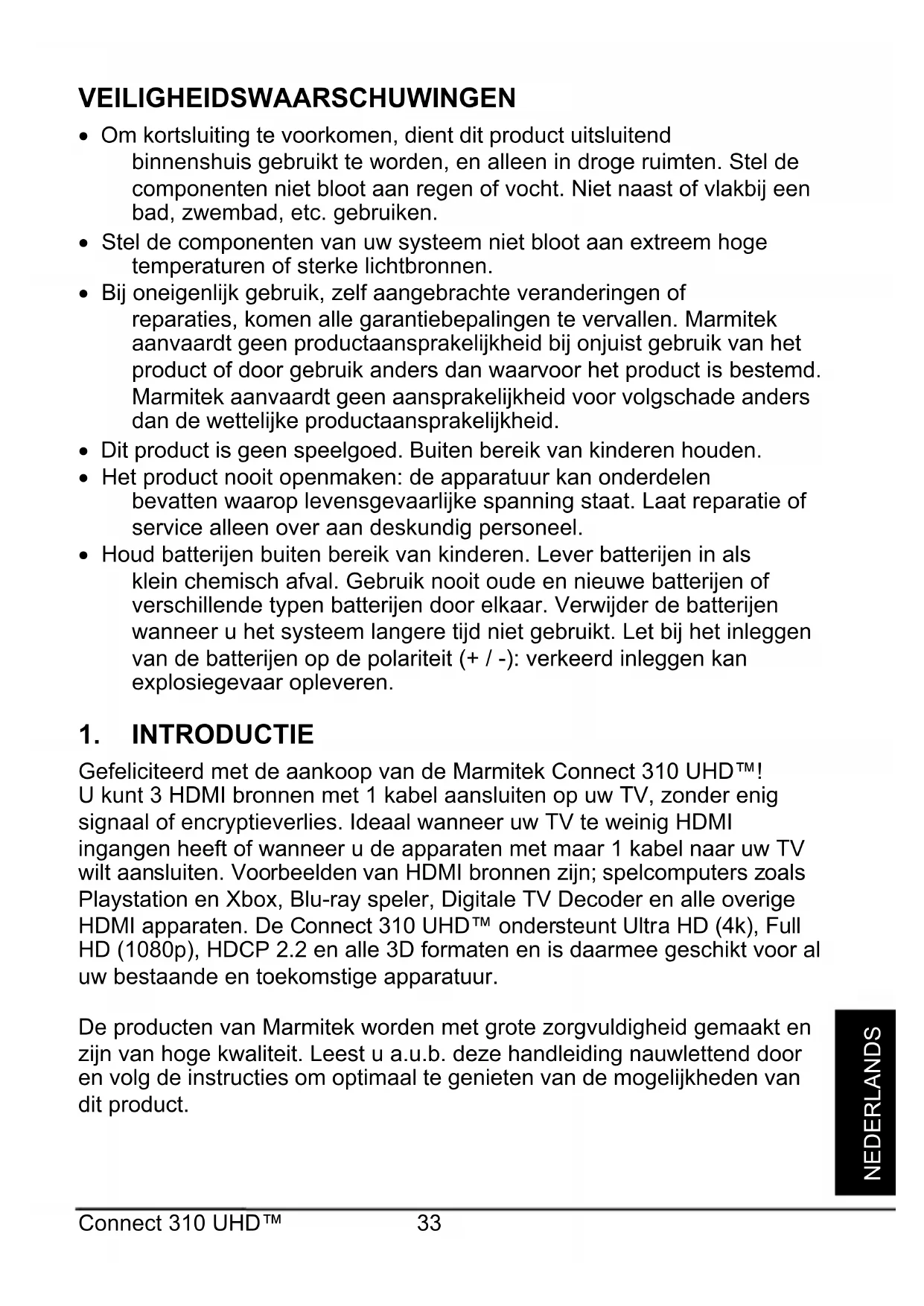 Gefeliciteerd met de aankoop van de Marmitek Connect 310 UHD™! U kunt 3 HDMI bronnen met 1 kabel aansluiten op uw TV, zonder enig signaal of encryptieverlies. Ideaal wanneer uw TV te weinig HDMI ingangen heeft of wanneer u de apparaten met maar 1 kabel naar uw TV wilt aansluiten. Voorbeelden van HDMI bronnen zijn; spelcomputers zoals Playstation en Xbox, Blu-ray speler, Digitale TV Decoder en alle overige HDMI apparaten. De Connect 310 UHD™ ondersteunt Ultra HD (4k), Full HD (1080p), HDCP 2.2 en alle 3D formaten en is daarmee geschikt voor al uw bestaande en toekomstige apparatuur. De producten van Marmitek worden met grote zorgvuldigheid gemaakt en zijn van hoge kwaliteit. Leest u a.u.b. deze handleiding nauwlettend door en volg de instructies om optimaal te genieten van de mogelijkheden van dit product.34 © MARMITEK