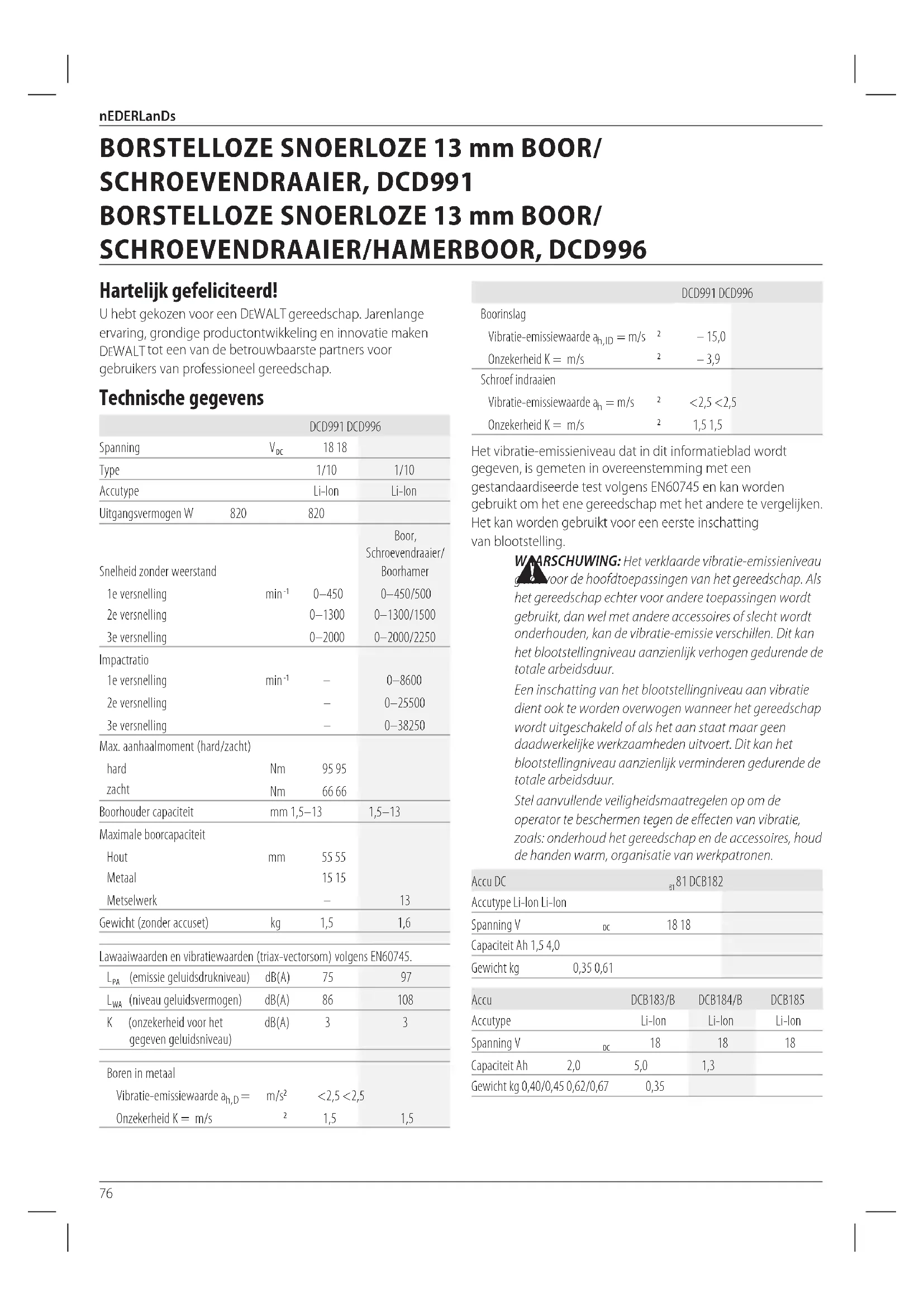 Capaciteit Ah 2,0 5,0 1,3 Gewicht kg 0,40/0,45 0,62/0,67 0,35 Hartelijk gefeliciteerd! U hebt gekozen voor een DeWALT gereedschap. Jarenlange ervaring, grondige productontwikkeling en innovatie maken DeWALT tot een van de betrouwbaarste partners voor gebruikers van professioneelgereedschap. Technische gegevens DCD991 DCD996 Spanning V