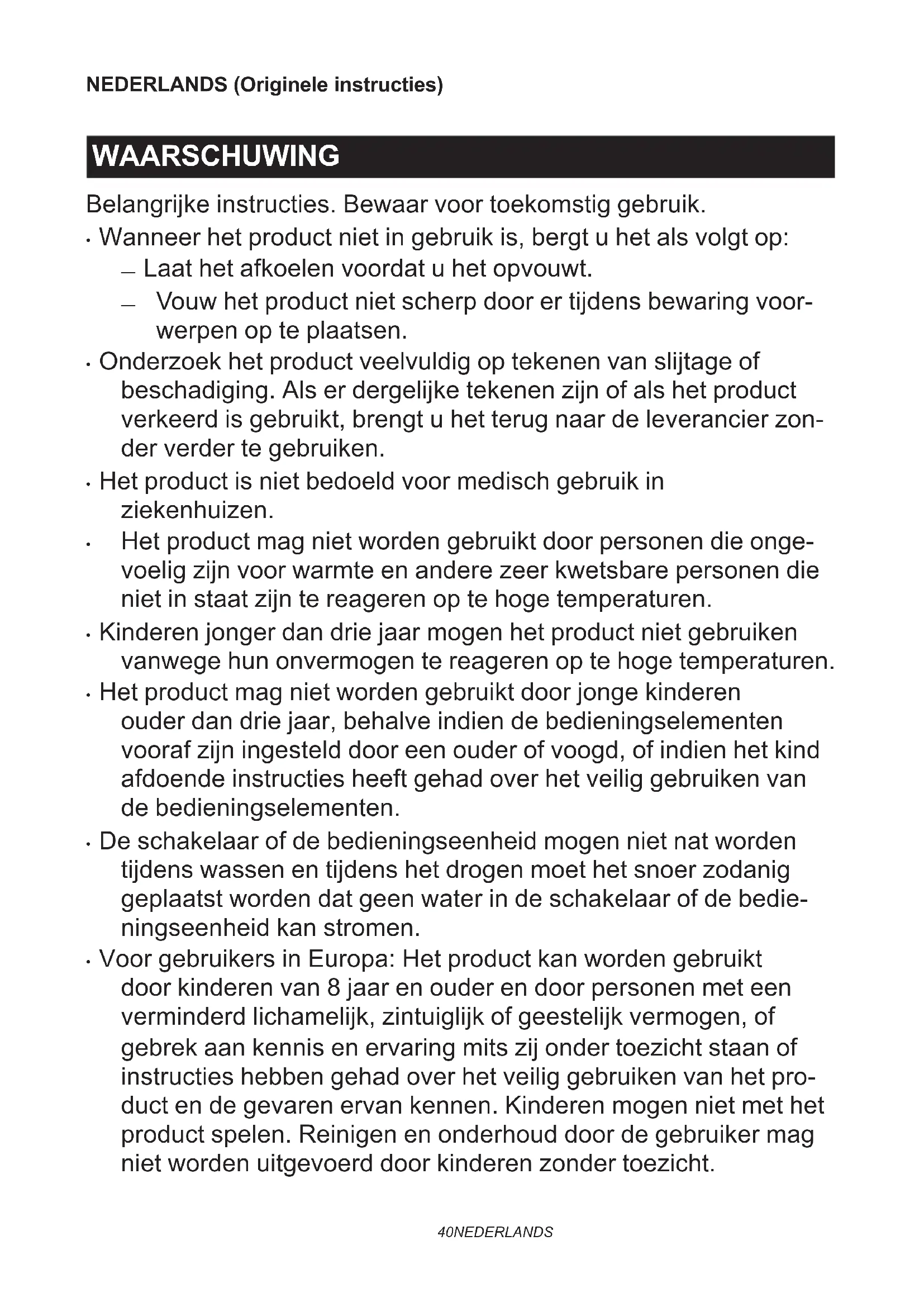 - Het product mag niet worden gebruikt door personen die onge- voelig zijn voor warmte en andere zeer kwetsbare personen die niet in staat zijn te reageren op te hoge temperaturen.