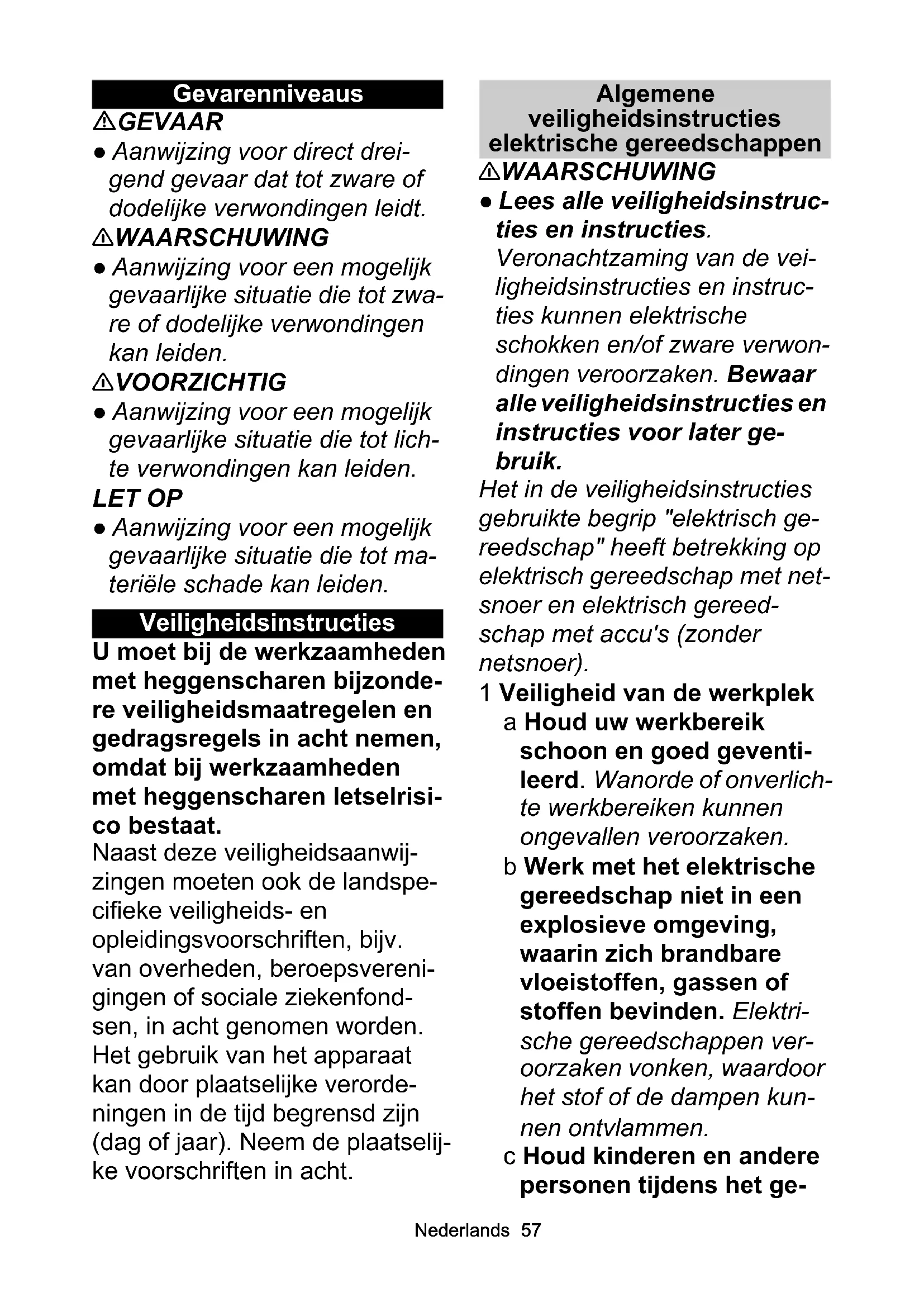 - EU-conformiteitsverklaring Nederlands 57 Gevarenniveaus GEVAAR ● Aanwijzing voor direct drei- gend gevaar dat tot zware of dodelijke verwondingen leidt. 몇 WAARSCHUWING ● Aanwijzing voor een mogelijk gevaarlijke situatie die tot zwa- re of dodelijke verwondingen kan leiden. 몇 VOORZICHTIG ● Aanwijzing voor een mogelijk gevaarlijke situatie die tot lich- te verwondingen kan leiden. LET OP ● Aanwijzing voor een mogelijk gevaarlijke situatie die tot ma- teriële schade kan leiden. Veiligheidsinstructies U moet bij de werkzaamheden met heggenscharen bijzonde- re veiligheidsmaatregelen en gedragsregels in acht nemen, omdat bij werkzaamheden met heggenscharen letselrisi- co bestaat. Naast deze veiligheidsaanwij- zingen moeten ook de landspe- cifieke veiligheids- en opleidingsvoorschriften, bijv. van overheden, beroepsvereni- gingen of sociale ziekenfond- sen, in acht genomen worden. Het gebruik van het apparaat kan door plaatselijke verorde- ningen in de tijd begrensd zijn (dag of jaar). Neem de plaatselij- ke voorschriften in acht. Algemene veiligheidsinstructies elektrische gereedschappen 몇 WAARSCHUWING ● Lees alle veiligheidsinstruc- ties en instructies. Veronachtzaming van de vei- ligheidsinstructies en instruc- ties kunnen elektrische schokken en/of zware verwon- dingen veroorzaken. Bewaar alle veiligheidsinstructies en instructies voor later ge- bruik. Het in de veiligheidsinstructies gebruikte begrip "elektrisch ge- reedschap" heeft betrekking op elektrisch gereedschap met net- snoer en elektrisch gereed- schap met accu's (zonder netsnoer). 1 Veiligheid van de werkplek a Houd uw werkbereik schoon en goed geventi- leerd. Wanorde of onverlich- te werkbereiken kunnen ongevallen veroorzaken. b Werk met het elektrische gereedschap niet in een explosieve omgeving, waarin zich brandbare vloeistoffen, gassen of stoffen bevinden. Elektri- sche gereedschappen ver- oorzaken vonken, waardoor het stof of de dampen kun- nen ontvlammen. c Houd kinderen en andere personen tijdens het ge-58 Nederlands bruik van het elektrische gereedschap buiten be- reik. Bij afleiding kunt u de controle over het apparaat verliezen. 2 Elektrische veiligheid a De aansluitstekker van het elektrische gereedschap moet in het stopcontact passen. De stekker mag op geen enkele manier veranderd worden. Ge- bruik geen adapterstek- kers samen met elektrische gereedschap- pen die over randaarding beschikken. Onverander- de stekkers en passende stopcontacten verminderen de kans op een elektrische schok. b Vermijd lichamelijk con- tact met geaarde opper- vlakken zoals van buizen, verwarmingen, ovens en koelkasten. Er bestaat ver- hoogde kans op een elektri- sche schok als uw lichaam geaard is. c Houd elektrische gereed- schappen uit de buurt van regen en vocht. Het indrin- gen van water in een elek- trisch gereedschap verhoogt de kans op een elektrische schok. d Gebruik de kabel niet voor andere doeleinden, bijv. om het elektrische gereed- schap te dragen of op te hangen of om de stekker uit het stopcontact te trek- ken. Houd de kabel uit de buurt van hitte, olie, scher- pe randen of bewegende apparaatonderdelen. Be- schadigde of in elkaar ge- wikkelde aansluitkabels verhogen de kans op een elektrische schok. e Als u met een elektrisch gereedschap in de open lucht werkt, gebruik dan alleen verlengsnoeren die ook voor buiten geschikt zijn. Het gebruik van een voor buiten geschikt ver- lengsnoer vermindert de kans op een elektrische schok. f Als het gebruik van het elektrische gereedschap in vochtige omgeving niet te vermijden is, gebruik dan een aardlekschake- laar. Het gebruik van een aardlekschakelaar vermin- dert de kans op een elektri- sche schok. 3 Veiligheid van personen a Wees aandachtig, let op wat u doet en ga verstan- dig te werk met een elek- trisch gereedschap. Gebruik geen elektrisch gereedschap als u moe bent of onder invloed staat van drugs, alcohol of me-Nederlands 59 dicijnen. Een moment van onachtzaamheid bij het ge- bruik van het elektrische ge- reedschap kan tot ernstig letsel leiden. b Draag een persoonlijke veiligheidsuitrusting en altijd een veiligheidsbril. Het dragen van een per- soonlijke veiligheidsuitrus- ting, zoals stofmasker, slipvaste veiligheidsschoe- nen, veiligheidshelm of ge- hoorbescherming, vermindert afhankelijk van het soort en het gebruik van het elektrische gereedschap de kans op letsels. c Vermijd een onbedoelde inbedrijfstelling. Contro- leer of het elektrisch ge- reedschap uitgeschakeld is, voordat u het op de stroomvoorziening en/of de accu aansluit, optilt of draagt. Als u bij het dragen van het elektrisch gereed- schap uw vinger op de scha- kelaar hebt of het apparaat in ingeschakelde toestand op de schakelaar aansluit, kan dit tot ongevallen leiden. d Verwijder instelgereed- schappen of schroefsleu- tels, voordat u het elektrische gereedschap inschakelt. Gereedschap- pen of sleutels die zich in een draaiend apparaaton- derdeel bevinden, kunnen tot verwondingen leiden. e Vermijd een abnormale li- chaamshouding. Zorg voor stabiliteit en blijf al- tijd in evenwicht. Daardoor kunt u het elektrische ge- reedschap in onverwachte situaties beter controleren. f Draag geschikte kleding. Draag geen wijde kleding of sieraden. Houd uw haar, kleding en handschoenen uit de buurt van bewegen- de onderdelen. Losse kle- ding, handschoenen, sieraden of lang haar kun- nen vast komen te zitten in bewegende delen. g Als stofafzuig- en opvan- ginrichtingen gemonteerd kunnen worden, contro- leer dan of deze aangeslo- ten zijn en juist gebruikt worden. Gebruik van een stofafzuiging kan gevaren door stof verminderen. 4 Gebruik en behandeling van het elektrische gereed- schap a Vermijd overbelasting van het apparaat. Gebruik voor uw werk het daarvoor be- stemde elektrische ge- reedschap. Met het passende elektrische ge- reedschap werkt u beter en veiliger in het opgegeven vermogensbereik.60 Nederlands b Gebruik geen elektrisch gereedschap waarvan de schakelaar defect is. Een elektrisch gereedsch