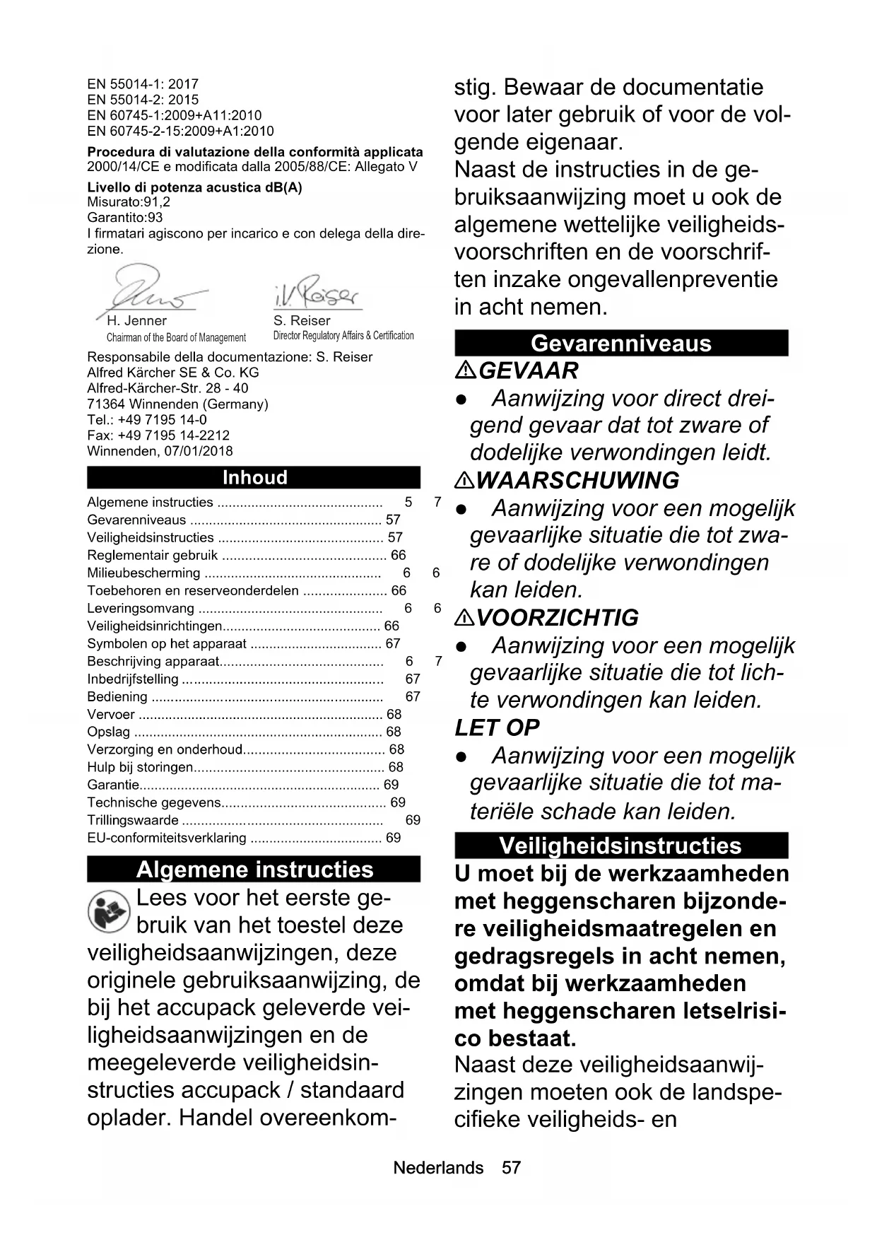 - Lunghezza lama di taglio mm 500 Peso (senza unità accumulatore) kg 2,7Nederlands 57 EN 55014-1: 2017 EN 55014-2: 2015 EN 60745-1:2009+A11:2010 EN 60745-2-15:2009+A1:2010 Procedura di valutazione della conformità applicata 2000/14/CE e modificata dalla 2005/88/CE: Allegato V Livello di potenza acustica dB(A) Misurato:91,2 Garantito:93 I firmatari agiscono per incarico e con delega della dire- zione. Responsabile della documentazione: S. Reiser Alfred Kärcher SE & Co. KG Alfred-Kärcher-Str. 28 - 40 71364 Winnenden (Germany) Tel.: +49 7195 14-0 Fax: +49 7195 14-2212 Winnenden, 07/01/2018 Inhoud Algemene instructies Lees voor het eerste ge- bruik van het toestel deze veiligheidsaanwijzingen, deze originele gebruiksaanwijzing, de bij het accupack geleverde vei- ligheidsaanwijzingen en de meegeleverde veiligheidsin- structies accupack / standaard oplader. Handel overeenkom- stig. Bewaar de documentatie voor later gebruik of voor de vol- gende eigenaar. Naast de instructies in de ge- bruiksaanwijzing moet u ook de algemene wettelijke veiligheids- voorschriften en de voorschrif- ten inzake ongevallenpreventie in acht nemen. Gevarenniveaus GEVAAR ● Aanwijzing voor direct drei- gend gevaar dat tot zware of dodelijke verwondingen leidt. 몇 WAARSCHUWING ● Aanwijzing voor een mogelijk gevaarlijke situatie die tot zwa- re of dodelijke verwondingen kan leiden. 몇 VOORZICHTIG ● Aanwijzing voor een mogelijk gevaarlijke situatie die tot lich- te verwondingen kan leiden. LET OP ● Aanwijzing voor een mogelijk gevaarlijke situatie die tot ma- teriële schade kan leiden. Veiligheidsinstructies U moet bij de werkzaamheden met heggenscharen bijzonde- re veiligheidsmaatregelen en gedragsregels in acht nemen, omdat bij werkzaamheden met heggenscharen letselrisi- co bestaat. Naast deze veiligheidsaanwij- zingen moeten ook de landspe- cifieke veiligheids- en Algemene instructies p. 57