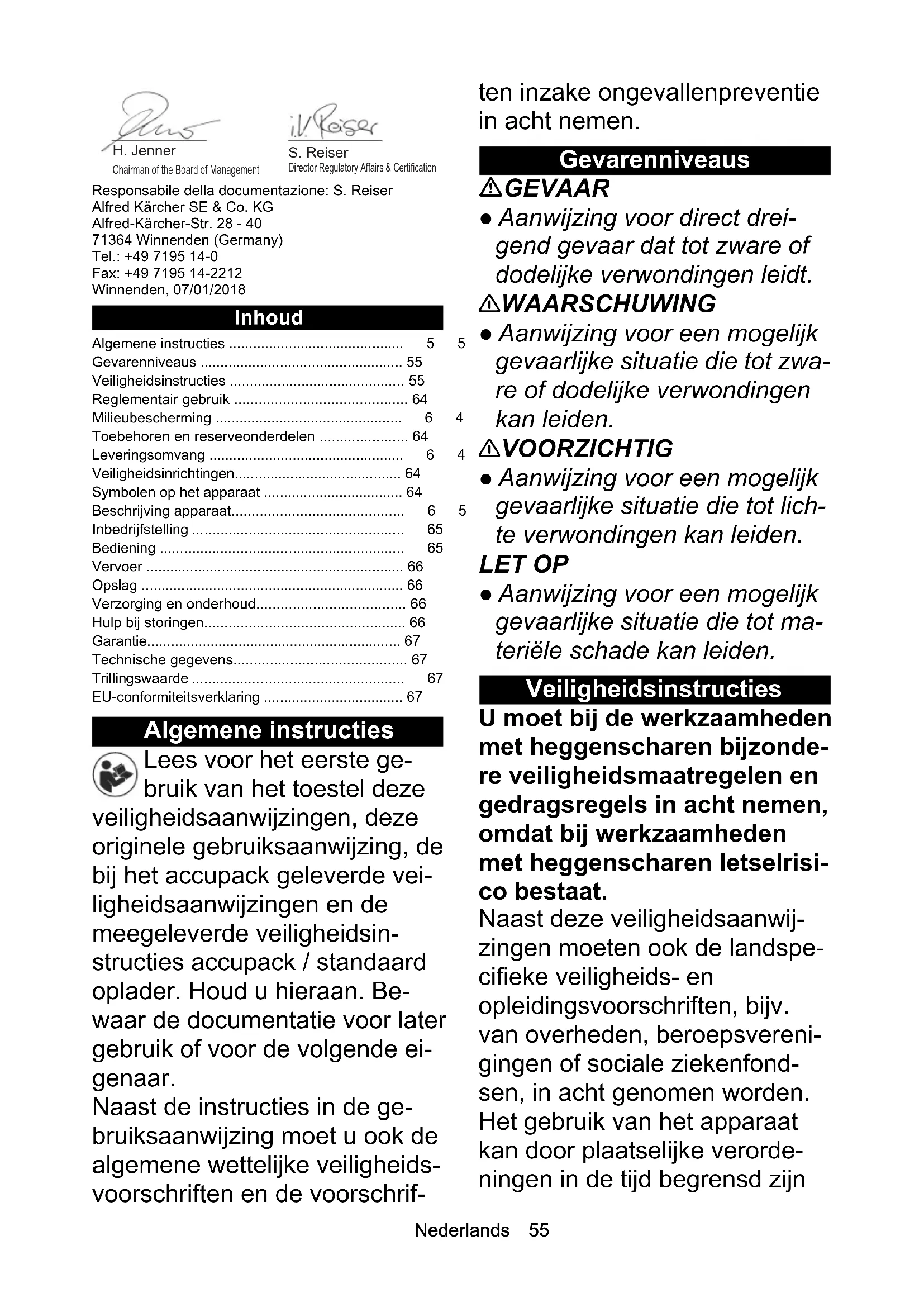- Lunghezza lama di taglio mm 450 Peso (senza unità accumulatore) kg 2,55Nederlands 55 Responsabile della documentazione: S. Reiser Alfred Kärcher SE & Co. KG Alfred-Kärcher-Str. 28 - 40 71364 Winnenden (Germany) Tel.: +49 7195 14-0 Fax: +49 7195 14-2212 Winnenden, 07/01/2018 Inhoud Algemene instructies Lees voor het eerste ge- bruik van het toestel deze veiligheidsaanwijzingen, deze originele gebruiksaanwijzing, de bij het accupack geleverde vei- ligheidsaanwijzingen en de meegeleverde veiligheidsin- structies accupack / standaard oplader. Houd u hieraan. Be- waar de documentatie voor later gebruik of voor de volgende ei- genaar. Naast de instructies in de ge- bruiksaanwijzing moet u ook de algemene wettelijke veiligheids- voorschriften en de voorschrif- ten inzake ongevallenpreventie in acht nemen. Gevarenniveaus GEVAAR ● Aanwijzing voor direct drei- gend gevaar dat tot zware of dodelijke verwondingen leidt. 몇 WAARSCHUWING ● Aanwijzing voor een mogelijk gevaarlijke situatie die tot zwa- re of dodelijke verwondingen kan leiden. 몇 VOORZICHTIG ● Aanwijzing voor een mogelijk gevaarlijke situatie die tot lich- te verwondingen kan leiden. LET OP ● Aanwijzing voor een mogelijk gevaarlijke situatie die tot ma- teriële schade kan leiden. Veiligheidsinstructies U moet bij de werkzaamheden met heggenscharen bijzonde- re veiligheidsmaatregelen en gedragsregels in acht nemen, omdat bij werkzaamheden met heggenscharen letselrisi- co bestaat. Naast deze veiligheidsaanwij- zingen moeten ook de landspe- cifieke veiligheids- en opleidingsvoorschriften, bijv. van overheden, beroepsvereni- gingen of sociale ziekenfond- sen, in acht genomen worden. Het gebruik van het apparaat kan door plaatselijke verorde- ningen in de tijd begrensd zijn Algemene instructies p. 55