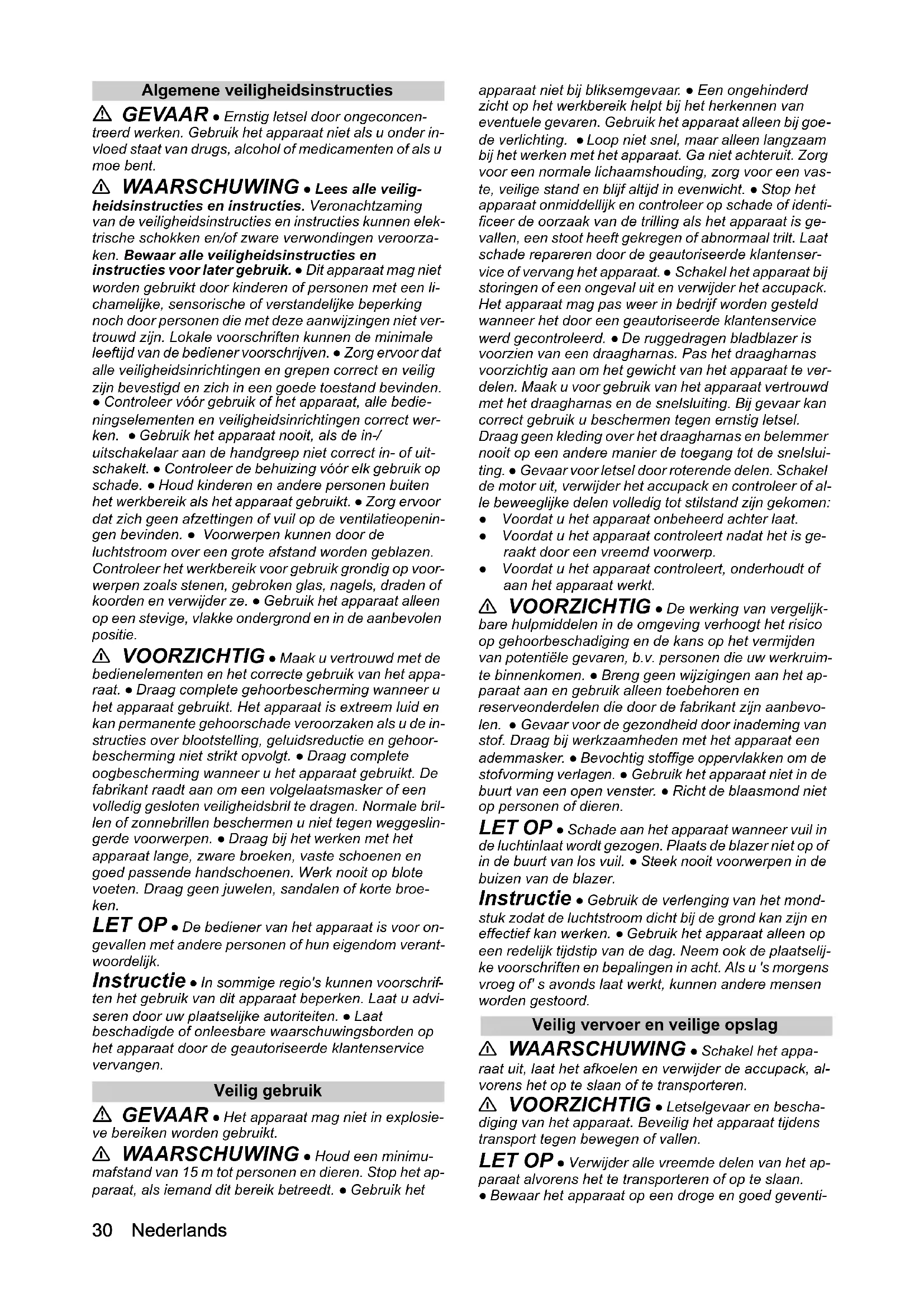 - EU-conformiteitsverklaring Chairman of the Board of ManagementDirector Regulatory Affairs & Certification H. Jenner S. Reiser30 Nederlands Algemene veiligheidsinstructies GEVAAR ● Ernstig letsel door ongeconcen- treerd werken. Gebruik het apparaat niet als u onder in- vloed staat van drugs, alcohol of medicamenten of als u moe bent. 몇 WAARSCHUWING ● Lees alle veilig- heidsinstructies en instructies. Veronachtzaming van de veiligheidsinstructies en instructies kunnen elek- trische schokken en/of zware verwondingen veroorza- ken. Bewaar alle veiligheidsinstructies en instructies voor later gebruik. ● Dit apparaat mag niet worden gebruikt door kinderen of personen met een li- chamelijke, sensorische of verstandelijke beperking noch door personen die met deze aanwijzingen niet ver- trouwd zijn. Lokale voorschriften kunnen de minimale leeftijd van de bediener voorschrijven. ● Zorg ervoor dat alle veiligheidsinrichtingen en grepen correct en veilig zijn bevestigd en zich in een goede toestand bevinden. ● Controleer vóór gebruik of het apparaat, alle bedie- ningselementen en veiligheidsinrichtingen correct wer- ken. ● Gebruik het apparaat nooit, als de in-/ uitschakelaar aan de handgreep niet correct in- of uit- schakelt. ● Controleer de behuizing vóór elk gebruik op schade. ● Houd kinderen en andere personen buiten het werkbereik als het apparaat gebruikt. ● Zorg ervoor dat zich geen afzettingen of vuil op de ventilatieopenin- gen bevinden. ● Voorwerpen kunnen door de luchtstroom over een grote afstand worden geblazen. Controleer het werkbereik voor gebruik grondig op voor- werpen zoals stenen, gebroken glas, nagels, draden of koorden en verwijder ze. ● Gebruik het apparaat alleen op een stevige, vlakke ondergrond en in de aanbevolen positie. 몇 VOORZICHTIG ● Maak u vertrouwd met de bedienelementen en het correcte gebruik van het appa- raat. ● Draag complete gehoorbescherming wanneer u het apparaat gebruikt. Het apparaat is extreem luid en kan permanente gehoorschade veroorzaken als u de in- structies over blootstelling, geluidsreductie en gehoor- bescherming niet strikt opvolgt. ● Draag complete oogbescherming wanneer u het apparaat gebruikt. De fabrikant raadt aan om een volgelaatsmasker of een volledig gesloten veiligheidsbril te dragen. Normale bril- len of zonnebrillen beschermen u niet tegen weggeslin- gerde voorwerpen. ● Draag bij het werken met het apparaat lange, zware broeken, vaste schoenen en goed passende handschoenen. Werk nooit op blote voeten. Draag geen juwelen, sandalen of korte broe- ken. LET OP ● De bediener van het apparaat is voor on- gevallen met andere personen of hun eigendom verant- woordelijk. Instructie ● In sommige regio's kunnen voorschrif- ten het gebruik van dit apparaat beperken. Laat u advi- seren door uw plaatselijke autoriteiten. ● Laat beschadigde of onleesbare waarschuwingsborden op het apparaat door de geautoriseerde klantenservice vervangen. Veilig gebruik GEVAAR ● Het apparaat mag niet in explosie- ve bereiken worden gebruikt. 몇 WAARSCHUWING ● Houd een minimu- mafstand van 15 m tot personen en dieren. Stop het ap- paraat, als iemand dit bereik betreedt. ● Gebruik het apparaat niet bij bliksemgevaar. ● Een ongehinderd zicht op het werkbereik helpt bij het herkennen van eventuele gevaren. Gebruik het apparaat alleen bij goe- de verlichting. ● Loop niet snel, maar alleen langzaam bij het werken met het apparaat. Ga niet achteruit. Zorg voor een normale lichaamshouding, zorg voor een vas- te, veilige stand en blijf altijd in evenwicht. ● Stop het apparaat onmiddellijk en controleer op schade of identi- ficeer de oorzaak van de trilling als het apparaat is ge- vallen, een stoot heeft gekregen of abnormaal trilt. Laat schade repareren door de geautoriseerde klantenser- vice of vervang het apparaat. ● Schakel het apparaat bij storingen of een ongeval uit en verwijder het accupack. Het apparaat mag pas weer in bedrijf worden gesteld wanneer het door een geautoriseerde klantenservice werd gecontroleerd. ● De ruggedragen bladblazer is voorzien van een draagharnas. Pas het draagharnas voorzichtig aan om het gewicht van het apparaat te ver- delen. Maak u voor gebruik van het apparaat vertrouwd met het draagharnas en de snelsluiting. Bij gevaar kan correct gebruik u beschermen tegen ernstig letsel. Draag geen kleding over het draagharnas en belemmer nooit op een andere manier de toegang tot de snelslui- ting. ● Gevaar voor letsel door roterende delen. Schakel de motor uit, verwijder het accupack en controleer of al- le beweeglijke delen volledig tot stilstand zijn gekomen: ● Voordat u het apparaat onbeheerd achter laat. ● Voordat u het apparaat controleert nadat het is ge- raakt door een vreemd voorwerp. ● Voordat u het apparaat controleert, onderhoudt of aan het apparaat werkt. 몇 VOORZICHTIG ● De werking van vergelijk- bare hulpmiddelen in de omgeving verhoogt het risico op gehoorbeschadiging en de kans op het vermijden van potentiële gevaren, b.v. personen die uw werkruim- te binnenkomen. ● Breng geen wijzigingen aan het ap- paraat aan en gebruik alleen toebehoren en reserveonderdelen die door de fabrikant zijn aanbevo- len. ● Gevaar voor de gezondheid door inademing van stof. Draag bij werkzaamheden met het apparaat een ademmasker. ● Bevochtig stoffige oppervlakken om de stofvorming verlagen. ● Gebruik het apparaat niet in de buurt van een open venster. ● Richt de blaasmond niet op personen of dieren. LET OP ● Schade aan het apparaat wanneer vuil in de luchtinlaat wordt gezogen. Plaats de blazer niet op of in de buurt van los vuil. ● Steek nooit voorwerpen in de buizen van de blazer. Instructie ● Gebruik de verlenging van het mond- stuk zodat de luchtstroom dicht bij de grond kan zijn en effectief kan werken. ● Gebruik het apparaat alleen op een redelijk tijdstip van de dag. Neem ook de plaatselij- ke voorschriften en bepalingen in acht. Als u 's morgens vroeg of' s avon