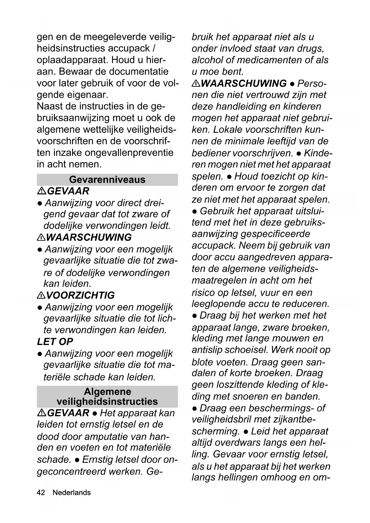 - EU-conformiteitsverklaring Chairman of the Board of ManagementDirector Regulatory Affairs & Certification H. Jenner S. Reiser42 Nederlands gen en de meegeleverde veilig- heidsinstructies accupack / oplaadapparaat. Houd u hier- aan. Bewaar de documentatie voor later gebruik of voor de vol- gende eigenaar. Naast de instructies in de ge- bruiksaanwijzing moet u ook de algemene wettelijke veiligheids- voorschriften en de voorschrif- ten inzake ongevallenpreventie in acht nemen. Gevarenniveaus GEVAAR ● Aanwijzing voor direct drei- gend gevaar dat tot zware of dodelijke verwondingen leidt. 몇 WAARSCHUWING ● Aanwijzing voor een mogelijk gevaarlijke situatie die tot zwa- re of dodelijke verwondingen kan leiden. 몇 VOORZICHTIG ● Aanwijzing voor een mogelijk gevaarlijke situatie die tot lich- te verwondingen kan leiden. LET OP ● Aanwijzing voor een mogelijk gevaarlijke situatie die tot ma- teriële schade kan leiden. Algemene veiligheidsinstructies GEVAAR ● Het apparaat kan leiden tot ernstig letsel en de dood door amputatie van han- den en voeten en tot materiële schade. ● Ernstig letsel door on- geconcentreerd werken. Ge- bruik het apparaat niet als u onder invloed staat van drugs, alcohol of medicamenten of als u moe bent. 몇 WAARSCHUWING ● Perso- nen die niet vertrouwd zijn met deze handleiding en kinderen mogen het apparaat niet gebrui- ken. Lokale voorschriften kun- nen de minimale leeftijd van de bediener voorschrijven. ● Kinde- ren mogen niet met het apparaat spelen. ● Houd toezicht op kin- deren om ervoor te zorgen dat ze niet met het apparaat spelen. ● Gebruik het apparaat uitslui- tend met het in deze gebruiks- aanwijzing gespecificeerde accupack. Neem bij gebruik van door accu aangedreven appara- ten de algemene veiligheids- maatregelen in acht om het risico op letsel, vuur en een leeglopende accu te reduceren. ● Draag bij het werken met het apparaat lange, zware broeken, kleding met lange mouwen en antislip schoeisel. Werk nooit op blote voeten. Draag geen san- dalen of korte broeken. Draag geen loszittende kleding of kle- ding met snoeren en banden. ● Draag een beschermings- of veiligheidsbril met zijkantbe- scherming. ● Leid het apparaat altijd overdwars langs een hel- ling. Gevaar voor ernstig letsel, als u het apparaat bij het werken langs hellingen omhoog en om-Nederlands 43 laag leidt. ● Loop niet snel, maar alleen langzaam bij het werken met het apparaat. Zorg voor een stevige basis en be- houd van uw evenwicht, in het bijzonder bij hellingen. ● Gevaar voor ongevallen door uitglijden. Gebruik het apparaat niet langs hellingen, kuilen, zeer steile hel- lingen of dijken. 몇 VOORZICHTIG ● Maak u vertrouwd met de bedienele- menten en het correcte gebruik van het apparaat. Veiligheid van de werkplek GEVAAR ● Ernstig letsel, als van het snijmes voorwerpen worden geslingerd of draden of snoeren in het snijwerktuig ver- strikt raken. Controleer het werkbereik voor gebruik grondig op voorwerpen zoals stenen, stokken, metaal, draden, botten of speelgoed en verwijder dit. ● Gebruik het apparaat nooit, als personen, in het bijzonder kinderen of dieren, zich binnen een straal van 15 m bevinden, omdat er gevaar bestaat dat voorwerpen door het snijmes worden weggeslingerd. ● Explo- siegevaar. Het apparaat veroor- zaakt vonken die stof, gas dampen kunnen doen ontvlam- men. Werk met het apparaat niet in een explosieve omge- ving, waarin zich brandbare vloeistoffen, gassen of stoffen bevinden. ● Ernstig letsel bij kin- deren. Kinderen kunnen door het apparaat en de bewegingen ervan worden aangetrokken. Let steeds op kinderen, omdat ze zich vrij bewegen. 몇 WAARSCHUWING ● Ge- bruik het apparaat niet bij blik- semgevaar. ● Maai altijd bij daglicht of bij goed kunstlicht. ● Houd kinderen uit de buurt van de maaiomgeving en onder toe- zicht van een volwassene die niet de bediener is; pas goed open schakel het apparaat uit, als een kind de maaiomgeving betreedt. ● Wees voorzichtig hoe blinde hoeken, struiken, bo- men of objecten uw zicht nega- tief kunnen beïnvloeden. LET OP ● De bediener van het apparaat is voor ongevallen met andere personen of hun eigen- dom verantwoordelijk. Veilig gebruik GEVAAR ● Controleer voor gebruik van het apparaat of messen, mespennen en me- seenheid noch versleten noch beschadigd zijn. ● Vergrendel de in-/uitschakelaar nooit in de AAN-positie; dit is extreem ge- vaarlijk. ● Trek het apparaat al- leen achteruit, als dit absoluut noodzakelijk is. Het apparaat van een wand of een hindernis moet worden weggetrokken, kijk dan eerst omlaag, om te voorko-44 Nederlands men dat u struikelt of met appa- raat over uw voeten rijdt. ● Gevaar in contact met het vrijliggende mes te komen of door weggeslingerde voorwer- pen te worden getroffen. Kantel het apparaat niet, als u de motor start of terwijl de motor loopt. Als kantelen toch noodzakelijk is, bijvoorbeeld om het starten te vereenvoudigen, kunt u de voor- zijde van het apparaat met 5 cm optillen. Druk hiervoor de hand- greep voorzichtig omlaag. U moet het apparaat in de normale bedrijfsstand brengen (d.w.z. Al- le vier wielen op de grond), alvo- rens met het maaien te beginnen. ● Messen die met een stroomvoerende kabel in contact komen, kunnen vrijlig- gende metalen onderdelen van het apparaat onder stroom zet- ten en een elektrische schok veroorzaken. 몇 WAARSCHUWING ● De messen van het apparaat zijn scherp. Draag stevige hand- schoenen en werk voorzichtig, als u monteert, vervangt, reinigt of de bevestiging van schroeven controleert. ● Vervang versleten of beschadigde delen steeds per set, om de balans te garande- ren. ● Zorg ervoor dat het appa- raat in een veilige toestand is door regelmatig te controleren of bouten, moeren en schroeven vast zijn aangedraaid. ● Ver- vang versleten of beschadigde delen, alvorens het apparaat in bedrijf te nemen. ● Gebruik het apparaat nooit, als de in-/uit- schakelaar aan de handgreep niet correct in- of uitschake