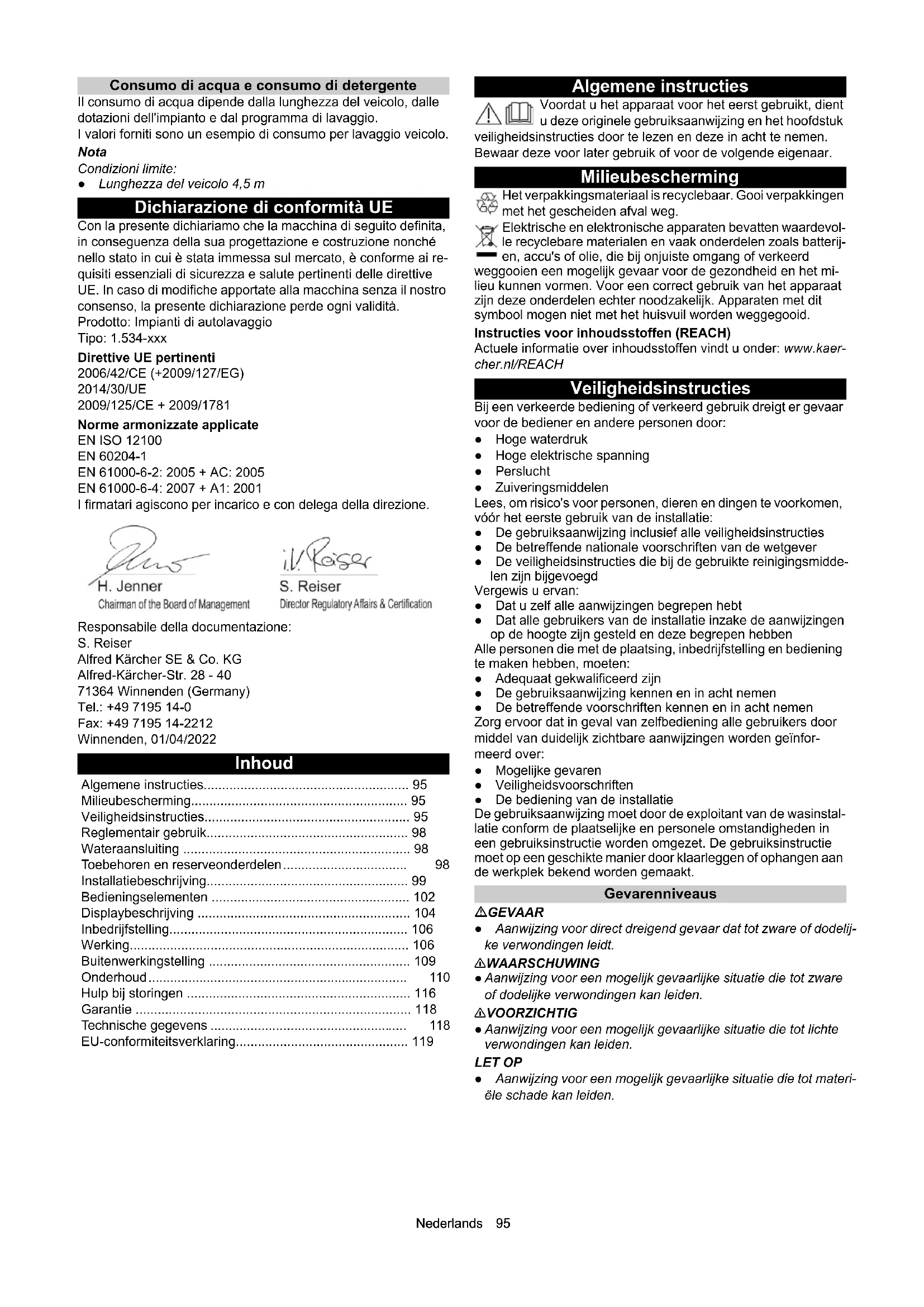 - Dati tecnici Con riserva di modifiche tecniche. CW 3 / CW 5 (CWB 3/1) CW 3 / CW 5 (CWB 3/2) CW 3 / CW 5 (CWB 3/3) Dimensioni impianto Altezza di lavaggio mm 2100, 2200, 2300 2400, 2500, 2600 2700, 2800, 2900 Altezza telaio mm 2900 3200 3500 Altezza totale mm 2930, 3030, 3130 3230, 3330, 3430 3530, 3630, 3730 Larghezza telaio mm 3500 3500 3500 Larghezza totale spazzole laterali mm 4040 4040 4040 Larghezza totale protezione antispruzzo mm 4060 4060 4060 Profondità del telaio / Profondità con spazzole in rotazione mm 1600 / 2170 1600 / 2170 1600 / 2170 Lunghezza totale capannone corto mm 2070 2070 2070 Larghezza impianto all'altezza specchio mm 2450 2450 2450 Larghezza impianto nella zona del lavaggio ruote mm 2100 2100 2100 Larghezza pista rotaie di scorrimento mm 2550, 2700, 2800 2550, 2700, 2800 2550, 2700, 2800 Larghezza capannone con distanza di sicurezza mm 4500 4500 4500 Misure limite del veicolo Spazzole di lavaggio Diametro spazzole laterale mm 975 975 975 Numero di giri delle spazzole 1/min 107 107 107 Diametro spazzole orizzontali mm 975 975 975 Numero di giri delle spazzole orizzontali 1/min 127 127 127 Velocità del portale m/min 0 - 24 0 - 24 0 - 24 Collegamento elettrico Tensione di rete V 400 400 400 Frequenza Hz 50 50 50 Potenza assorbita dalla rete kW 10-16 10-16 10-16 Fusibile dispositivo di comando max. A 35-50 35-50 35-50 Collegamento idrico Diametro nominale Pollici 1 1 1 Pressione flusso secondo DIN 1988 (con 100 l/min) MPa 0,4 - 0,6 0,4 - 0,6 0,4 - 0,6 Temperatura max. °C 50 50 50 Attacco utensile ad aria compressa Diametro nominale Pollici 1/2 1/2 1/2 Pressione MPa 0,6 - 0,8 0,6 - 0,8 0,6 - 0,8 Consumo / Lavaggio (senza dispositivo antigelo, in base al programma con veicolo lungo 4,5 m) l505050 Consumo con antigelo, circa l 700 700 700 Valori rilevati secondo EN 60335-2-79 Livello sonoro con funzionamento a secco dB(A) 94 94 94 Modulo di alta pressione del livello sonoro dB(A) 87 87 87Nederlands 95 Consumo di acqua e consumo di detergente Il consumo di acqua dipende dalla lunghezza del veicolo, dalle dotazioni dell'impianto e dal programma di lavaggio. I valori forniti sono un esempio di consumo per lavaggio veicolo. Nota Condizioni limite: ● Lunghezza del veicolo 4,5 m Dichiarazione di conformità UE Con la presente dichiariamo che la macchina di seguito definita, in conseguenza della sua progettazione e costruzione nonché nello stato in cui è stata immessa sul mercato, è conforme ai re- quisiti essenziali di sicurezza e salute pertinenti delle direttive UE. In caso di modifiche apportate alla macchina senza il nostro consenso, la presente dichiarazione perde ogni validità. Prodotto: Impianti di autolavaggio Tipo: 1.534-xxx Direttive UE pertinenti 2006/42/CE (+2009/127/EG) 2014/30/UE 2009/125/CE + 2009/1781 Norme armonizzate applicate EN ISO 12100 EN 60204-1 EN 61000-6-2: 2005 + AC: 2005 EN 61000-6-4: 2007 + A1: 2001 I firmatari agiscono per incarico e con delega della direzione. Responsabile della documentazione: S. Reiser Alfred Kärcher SE & Co. KG Alfred-Kärcher-Str. 28 - 40 71364 Winnenden (Germany) Tel.: +49 7195 14-0 Fax: +49 7195 14-2212 Winnenden, 01/04/2022 Inhoud Algemene instructies Voordat u het apparaat voor het eerst gebruikt, dient u deze originele gebruiksaanwijzing en het hoofdstuk veiligheidsinstructies door te lezen en deze in acht te nemen. Bewaar deze voor later gebruik of voor de volgende eigenaar. Milieubescherming Het verpakkingsmateriaal is recyclebaar. Gooi verpakkingen met het gescheiden afval weg. Elektrische en elektronische apparaten bevatten waardevol- le recyclebare materialen en vaak onderdelen zoals batterij- en, accu's of olie, die bij onjuiste omgang of verkeerd weggooien een mogelijk gevaar voor de gezondheid en het mi- lieu kunnen vormen. Voor een correct gebruik van het apparaat zijn deze onderdelen echter noodzakelijk. Apparaten met dit symbool mogen niet met het huisvuil worden weggegooid. Instructies voor inhoudsstoffen (REACH) Actuele informatie over inhoudsstoffen vindt u onder: www.kaer- cher.nl/REACH Veiligheidsinstructies Bij een verkeerde bediening of verkeerd gebruik dreigt er gevaar voor de bediener en andere personen door: ● Hoge waterdruk ● Hoge elektrische spanning ● Perslucht ● Zuiveringsmiddelen Lees, om risico's voor personen, dieren en dingen te voorkomen, vóór het eerste gebruik van de installatie: ● De gebruiksaanwijzing inclusief alle veiligheidsinstructies ● De betreffende nationale voorschriften van de wetgever ● De veiligheidsinstructies die bij de gebruikte reinigingsmidde- len zijn bijgevoegd Vergewis u ervan: ● Dat u zelf alle aanwijzingen begrepen hebt ● Dat alle gebruikers van de installatie inzake de aanwijzingen op de hoogte zijn gesteld en deze begrepen hebben Alle personen die met de plaatsing, inbedrijfstelling en bediening te maken hebben, moeten: ● Adequaat gekwalificeerd zijn ● De gebruiksaanwijzing kennen en in acht nemen ● De betreffende voorschriften kennen en in acht nemen Zorg ervoor dat in geval van zelfbediening alle gebruikers door middel van duidelijk zichtbare aanwijzingen worden geïnfor- meerd over: ● Mogelijke gevaren ● Veiligheidsvoorschriften ● De bediening van de installatie De gebruiksaanwijzing moet door de exploitant van de wasinstal- latie conform de plaatselijke en personele omstandigheden in een gebruiksinstructie worden omgezet. De gebruiksinstructie moet op een geschikte manier door klaarleggen of ophangen aan de werkplek bekend worden gemaakt. Gevarenniveaus GEVAAR ● Aanwijzing voor direct dreigend gevaar dat tot zware of dodelij- ke verwondingen leidt. 몇 WAARSCHUWING ● Aanwijzing voor een mogelijk gevaarlijke situatie die tot zware of dodelijke verwondingen kan leiden. 몇 VOORZICHTIG ● Aanwijzing voor een mogelijk gevaarlijke situatie die tot lichte verwondingen kan leiden. LET OP ● Aanwijzing voor een mogelijk gevaarlijke situatie die tot materi- ële schade kan leiden. Algemene instructies p. 95