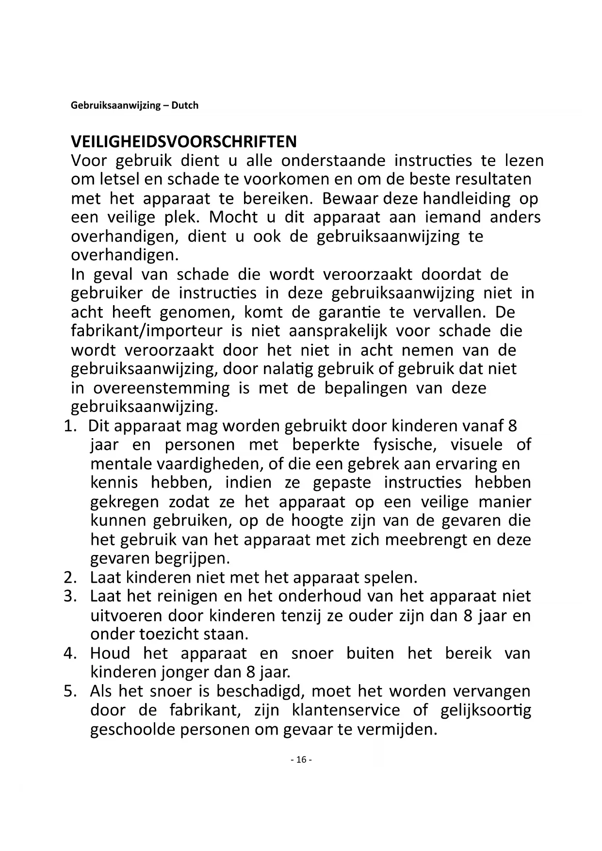 16. Probeer nooit de behuizing van het apparaat te openen en