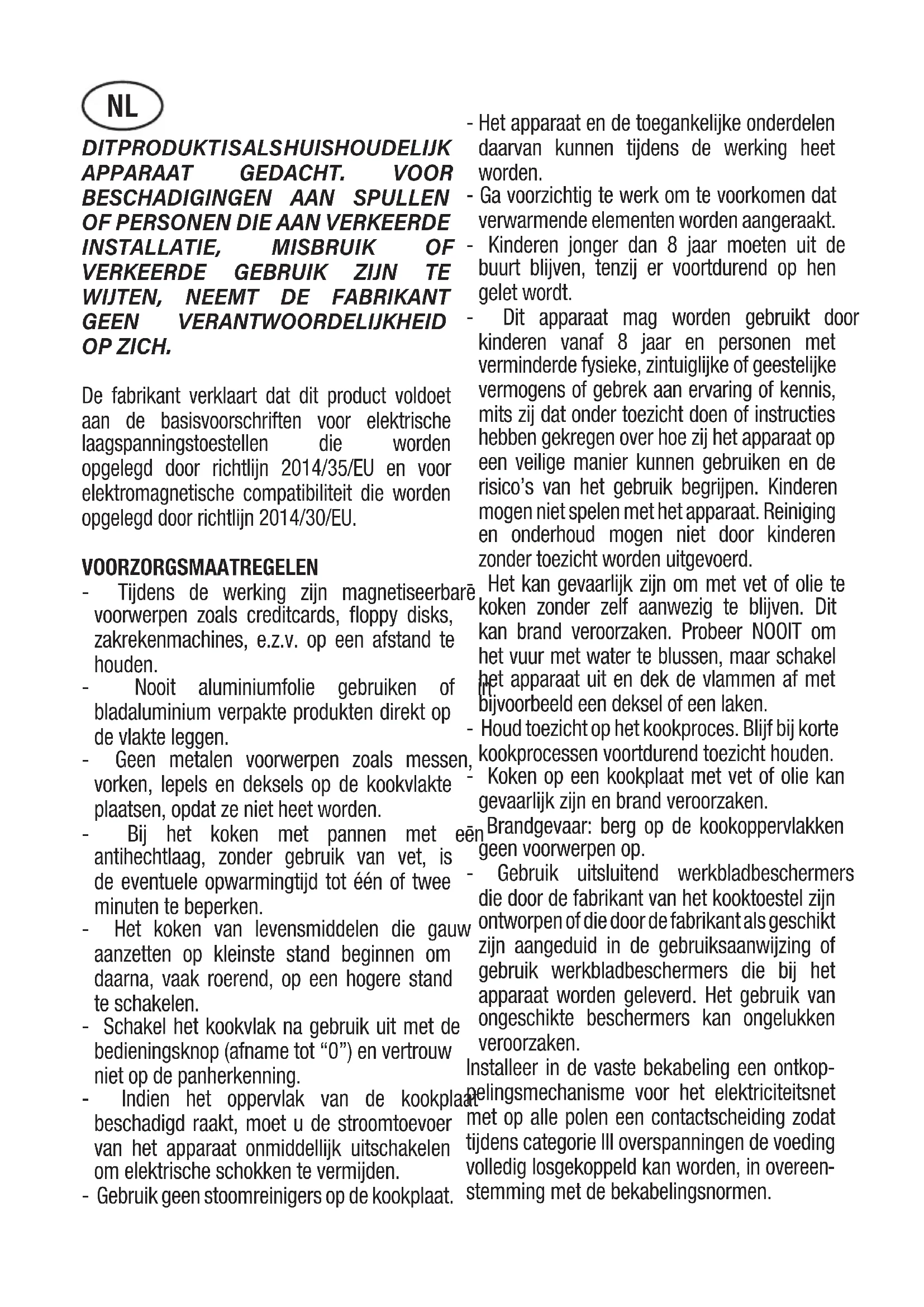 GEEN VERANTWOORDELIJKHEID OP ZICH. De fabrikant verklaart dat dit product voldoet aan de basisvoorschriften voor elektrische laagspanningstoestellen die worden opgelegd door richtlijn 2014/35/EU en voor elektromagnetische compatibiliteit die worden opgelegd door richtlijn 2014/30/EU. VOORZORGSMAATREGELEN - Tijdens de werking zijn magnetiseerbare voorwerpen zoals creditcards, floppy disks, zakrekenmachines, e.z.v. op een afstand te houden. - Nooit aluminiumfolie gebruiken of in bladaluminium verpakte produkten direkt op de vlakte leggen. - Geen metalen voorwerpen zoals messen, vorken, lepels en deksels op de kookvlakte plaatsen, opdat ze niet heet worden. - Bij het koken met pannen met een antihechtlaag, zonder gebruik van vet, is de eventuele opwarmingtijd tot één of twee minuten te beperken. - Het koken van levensmiddelen die gauw aanzetten op kleinste stand beginnen om daarna, vaak roerend, op een hogere stand te schakelen. - Schakel het kookvlak na gebruik uit met de bedieningsknop (afname tot “0”) en vertrouw niet op de panherkenning. - Indien het oppervlak van de kookplaat beschadigd raakt, moet u de stroomtoevoer van het apparaat onmiddellijk uitschakelen om elektrische schokken te vermijden. - Gebruik geen stoomreinigers op de kookplaat. - Het apparaat en de toegankelijke onderdelen daarvan kunnen tijdens de werking heet worden. - Ga voorzichtig te werk om te voorkomen dat verwarmende elementen worden aangeraakt. - Kinderen jonger dan 8 jaar moeten uit de buurt blijven, tenzij er voortdurend op hen gelet wordt. - Dit apparaat mag worden gebruikt door kinderen vanaf 8 jaar en personen met verminderde fysieke, zintuiglijke of geestelijke vermogens of gebrek aan ervaring of kennis, mits zij dat onder toezicht doen of instructies hebben gekregen over hoe zij het apparaat op een veilige manier kunnen gebruiken en de risico’s van het gebruik begrijpen. Kinderen mogen niet spelen met het apparaat. Reiniging en onderhoud mogen niet door kinderen zonder toezicht worden uitgevoerd. - Het kan gevaarlijk zijn om met vet of olie te koken zonder zelf aanwezig te blijven. Dit kan brand veroorzaken. Probeer NOOIT om het vuur met water te blussen, maar schakel het apparaat uit en dek de vlammen af met bijvoorbeeld een deksel of een laken. - Houd toezicht op het kookproces. Blijf bij korte kookprocessen voortdurend toezicht houden. - Koken op een kookplaat met vet of olie kan gevaarlijk zijn en brand veroorzaken. - Brandgevaar: berg op de kookoppervlakken geen voorwerpen op. - Gebruik uitsluitend werkbladbeschermers die door de fabrikant van het kooktoestel zijn ontworpen of die door de fabrikant als geschikt zijn aangeduid in de gebruiksaanwijzing of gebruik werkbladbeschermers die bij het apparaat worden geleverd. Het gebruik van ongeschikte beschermers kan ongelukken veroorzaken. Installeer in de vaste bekabeling een ontkop