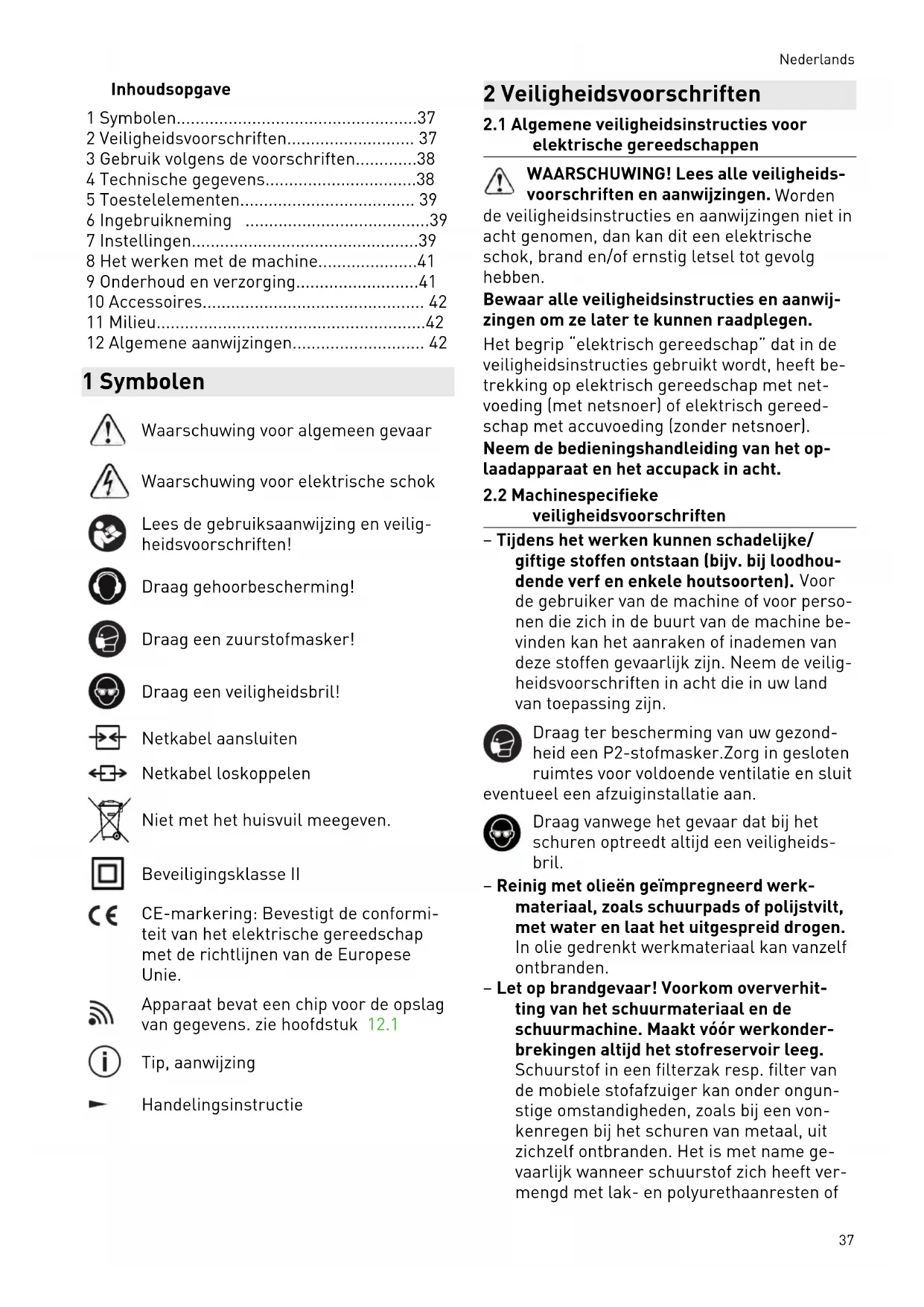 - 12 Algemene aanwijzingen 1 Symbolen Waarschuwing voor algemeen gevaar Waarschuwing voor elektrische schok Lees de gebruiksaanwijzing en veilig heidsvoorschriften! Draag gehoorbescherming! Draag een zuurstofmasker! Draag een veiligheidsbril! Netkabel aansluiten Netkabel loskoppelen Niet met het huisvuil meegeven. Beveiligingsklasse II CE-markering: Bevestigt de conformi teit van het elektrische gereedschap met de richtlijnen van de Europese Unie. Apparaat bevat een chip voor de opslag van gegevens. zie hoofdstuk 12.1 Tip, aanwijzing Handelingsinstructie 2 Veiligheidsvoorschriften p. 42