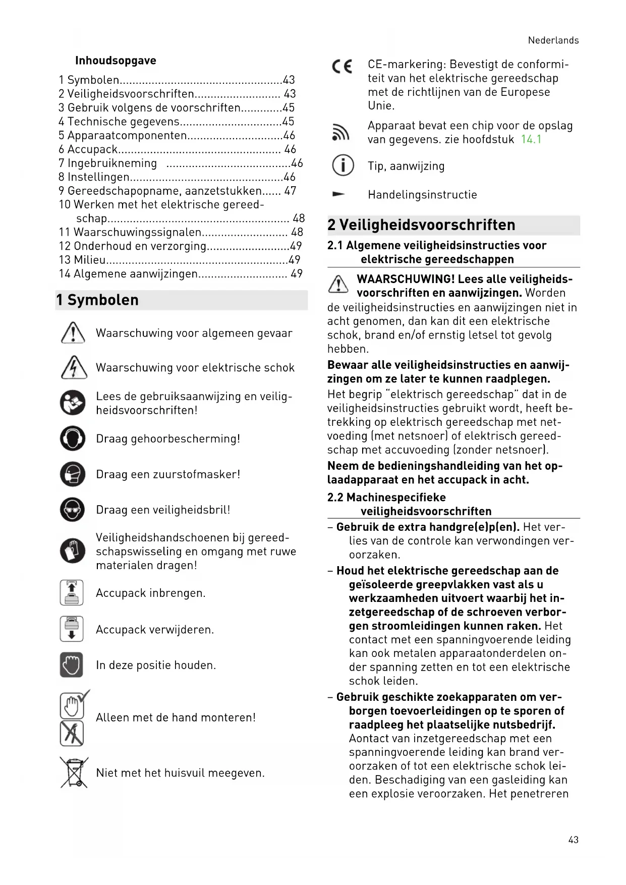 - 14 Algemene aanwijzingen 1 Symbolen Waarschuwing voor algemeen gevaar Waarschuwing voor elektrische schok Lees de gebruiksaanwijzing en veilig heidsvoorschriften! Draag gehoorbescherming! Draag een zuurstofmasker! Draag een veiligheidsbril! Veiligheidshandschoenen bij gereed schapswisseling en omgang met ruwe materialen dragen! Accupack inbrengen. Accupack verwijderen. In deze positie houden. Alleen met de hand monteren! Niet met het huisvuil meegeven. CE-markering: Bevestigt de conformi teit van het elektrische gereedschap met de richtlijnen van de Europese Unie. Apparaat bevat een chip voor de opslag van gegevens. zie hoofdstuk 14.1 Tip, aanwijzing Handelingsinstructie 2 Veiligheidsvoorschriften p. 49