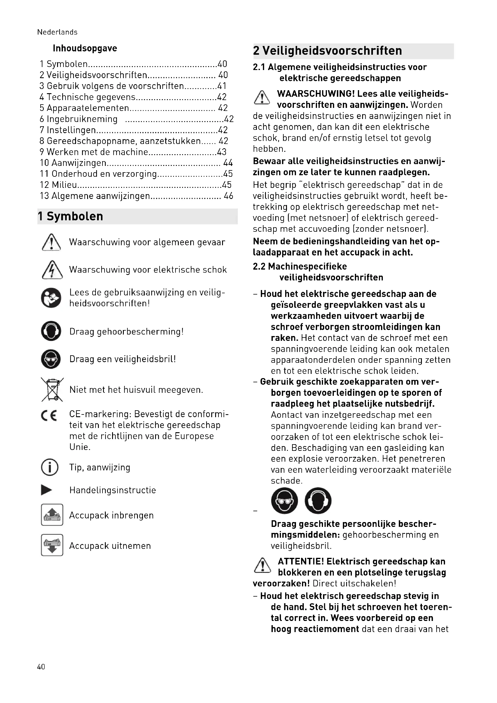 - 13 Algemene aanwijzingen 1 Symbolen Waarschuwing voor algemeen gevaar Waarschuwing voor elektrische schok Lees de gebruiksaanwijzing en veilig heidsvoorschriften! Draag gehoorbescherming! Draag een veiligheidsbril! Niet met het huisvuil meegeven. CE-markering: Bevestigt de conformi teit van het elektrische gereedschap met de richtlijnen van de Europese Unie. Tip, aanwijzing Handelingsinstructie Accupack inbrengen Accupack uitnemen 2 Veiligheidsvoorschriften p. 46