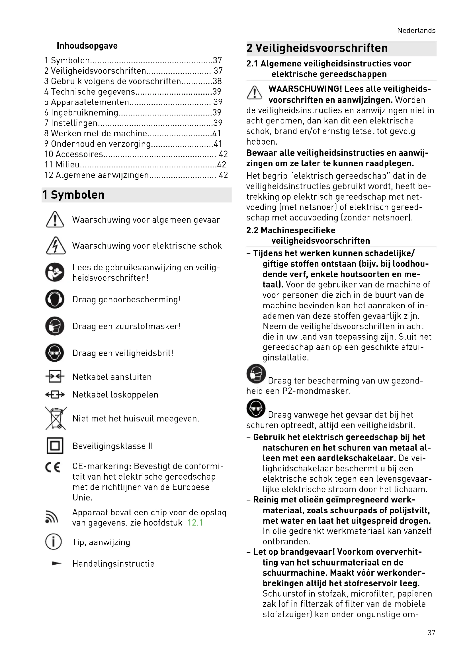 - 12 Algemene aanwijzingen 1 Symbolen Waarschuwing voor algemeen gevaar Waarschuwing voor elektrische schok Lees de gebruiksaanwijzing en veilig heidsvoorschriften! Draag gehoorbescherming! Draag een zuurstofmasker! Draag een veiligheidsbril! Netkabel aansluiten Netkabel loskoppelen Niet met het huisvuil meegeven. Beveiligingsklasse II CE-markering: Bevestigt de conformi teit van het elektrische gereedschap met de richtlijnen van de Europese Unie. Apparaat bevat een chip voor de opslag van gegevens. zie hoofdstuk 12.1 Tip, aanwijzing Handelingsinstructie 2 Veiligheidsvoorschriften p. 42