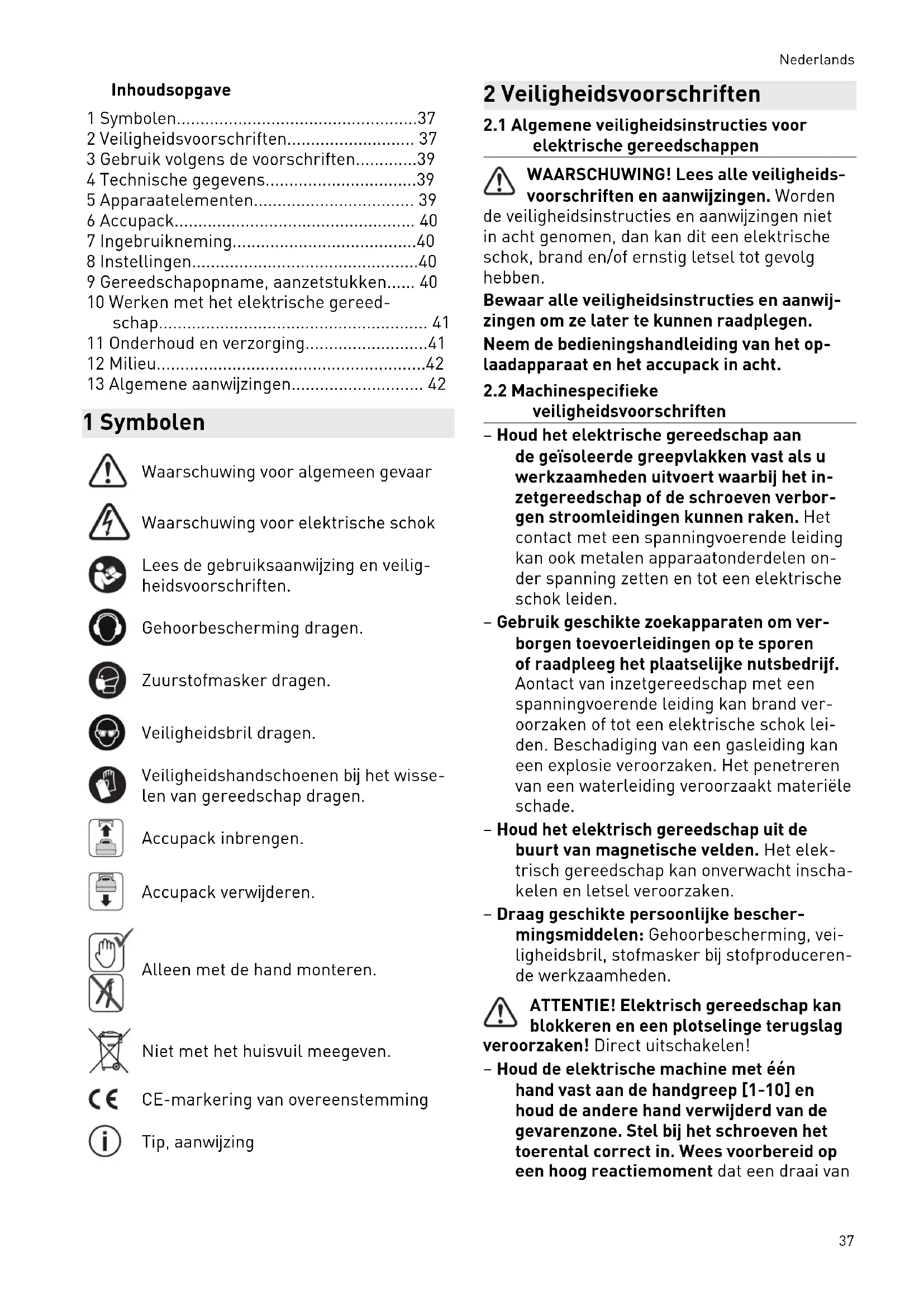 veiligheidsvoorschriften – Houd het elektrische gereedschap aan de geïsoleerde greepvlakken vast als u werkzaamheden uitvoert waarbij het in zetgereedschap of de schroeven verbor gen stroomleidingen kunnen raken. Het contact met een spanningvoerende leiding kan ook metalen apparaatonderdelen on der spanning zetten en tot een elektrische schok leiden. – Gebruik geschikte zoekapparaten om ver borgen toevoerleidingen op te sporen of raadpleeg het plaatselijke nutsbedrijf. Aontact van inzetgereedschap met een spanningvoerende leiding kan brand ver oorzaken of tot een elektrische schok lei den. Beschadiging van een gasleiding kan een explosie veroorzaken. Het penetreren van een waterleiding veroorzaakt materiële schade. – Houd het elektrisch gereedschap uit de buurt van magnetische velden. Het elek trisch gereedschap kan onverwacht inscha kelen en letsel veroorzaken. – Draag geschikte persoonlijke bescher mingsmiddelen: Gehoorbescherming, vei ligheidsbril, stofmasker bij stofproduceren de werkzaamheden. ATTENTIE! Elektrisch gereedschap kan blokkeren en een plotselinge terugslag veroorzaken! Direct uitschakelen! – Houd de elektrische machine met één hand vast aan de handgreep[1-10] en houd de andere hand verwijderd van de gevarenzone. Stel bij het schroeven het toerental correct in. Wees voorbereid op een hoog reactiemoment dat een draai van Nederlands 37de elektrische machine veroorzaakt en let sel tot gevolg kan hebben. – Gebruik het elektrisch gereedschap niet in de regen of in een vochtige omgeving. Vocht in het elektrisch gereedschap kan tot kortsluiting en brand leiden. – Wacht tot het elektrische gereedschap tot stilstand gekomen is voor u het weglegt. Het inzetgereedschap kan zich vasthaken en tot het verlies van de controle over het elektrische gereedschap leiden. – Bedieningselementen zoals de aan/uit- schakelaar niet manipuleren of blokkeren. – Gebruik alleen de daarvoor bedoelde ac cu's en geen netvoedingen voor het ge bruik van de accumachines. Gebruik geen oplaadapparaten van andere leveranciers voor het laden van de accu's. Het gebruik van accessoires die niet door de fabrikant worden voorgeschreven, kan tot een elek trische schok en/of ernstig letsel leiden. – Gebruik geen inzetgereedschappen en ac cessoires die niet door de fabrikant spe ciaal voor deze elektrische machine zijn geadviseerd en niet hiervoor bedoeld zijn. Dat u de accessoires of inzetgereedschap aan uw elektrische machine kunt beves tigen, is nog geen garantie voor een vei lig gebruik. Het letselrisico en de slijtage van de elektrische machine kan hoger zijn en de kwaliteit van het werkresultaat kan slechter zijn. – Afhankelijk van het type en het gebruik van de accessoires kunnen stofdeeltjes, inzetgereedschap en delen van het in zetgereedschap losraken. Er kan sprake zijn van verhoogde stofbelasting en on verwachte bewegingen. Draag geschikte persoonlijke beschermingsmiddelen. Wees voorbereid op een hoog reactiemoment dat een draai van de elektrische machine ver oorzaakt en letsel tot gevolg kan hebben.