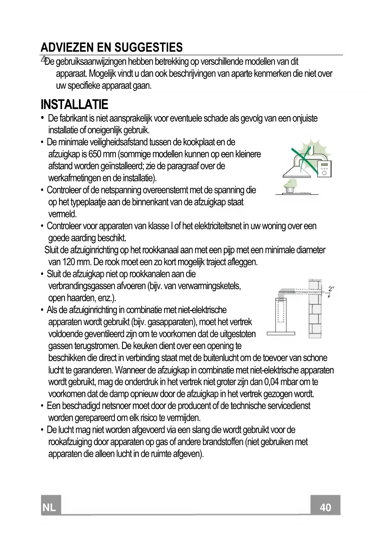 - Als de afzuiginrichting in combinatie met Niet-elektrische apparatusen worden gebruikt (bijv. gasapparaten),要去 het vertrek voldoende geventileerd着眼 om te voorkomen dat de uitgestoten gassen terugstromen. De keuken dient over een opening te beschikken die direct in verbinding staat met de buitenlucht om de toevoer van schone lucht te garanderen. Wanner de afzuigkap in combinatie met Niet-elektrische apparatusen worden gebruikt, mag de onderdruk in het vertrek Niet groter着眼 dan 0,04 mbar om te voorkomen dat de damp opnieuw door de afzuigkap in het vertrek gezogen worden.