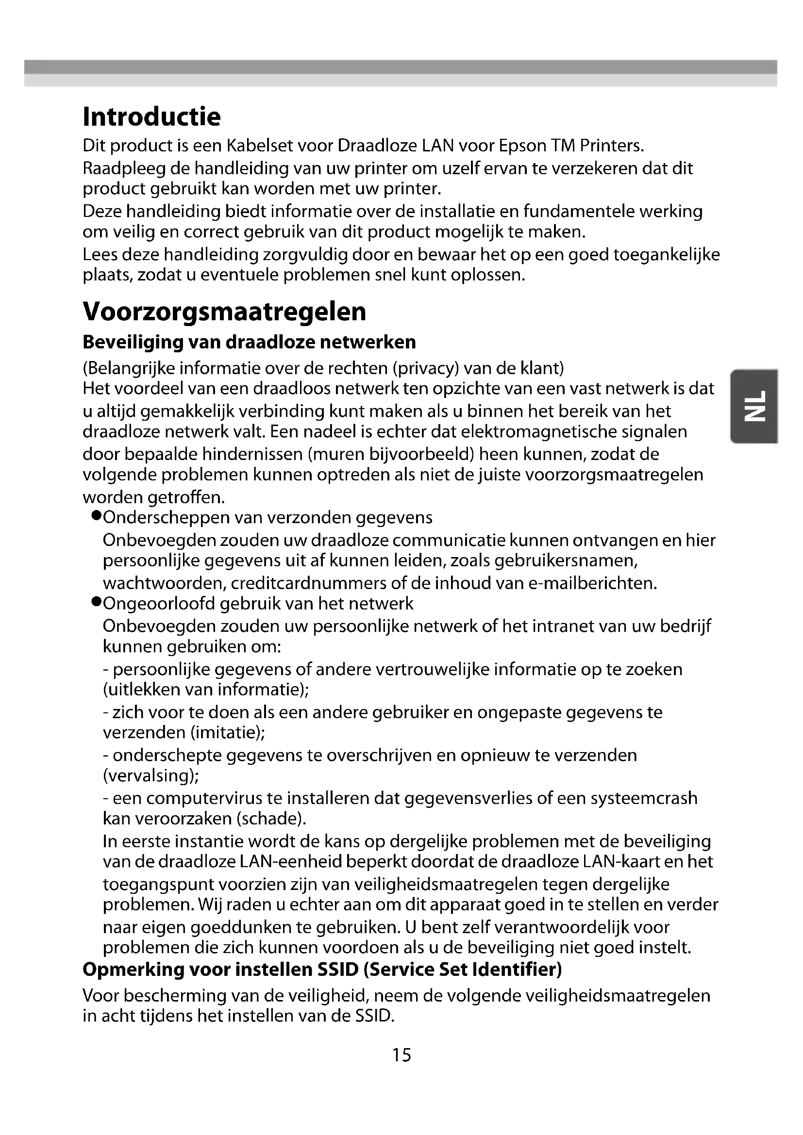 Nederlands Introductie Dit product is een Kabelset voor Draadloze LAN voor Epson TM Printers. Raadpleeg de handleiding van uw printer om uzelf ervan te verzekeren dat dit product gebruikt kan worden met uw printer. Deze handleiding biedt informatie over de installatie en fundamentele werking om veilig en correct gebruik van dit product mogelijk te maken. Lees deze handleiding zorgvuldig door en bewaar het op een goed toegankelijke plaats, zodat u eventuele problemen snel kunt oplossen. Voorzorgsmaatregelen Beveiliging van draadloze netwerken (Belangrijke informatie over de rechten (privacy) van de klant) Het voordeel van een draadloos netwerk ten opzichte van een vast netwerk is dat u altijd gemakkelijk verbinding kunt maken als u binnen het bereik van het draadloze netwerk valt. Een nadeel is echter dat elektromagnetische signalen door bepaalde hindernissen (muren bijvoorbeeld) heen kunnen, zodat de volgende problemen kunnen optreden als niet de juiste voorzorgsmaatregelen worden getroffen.