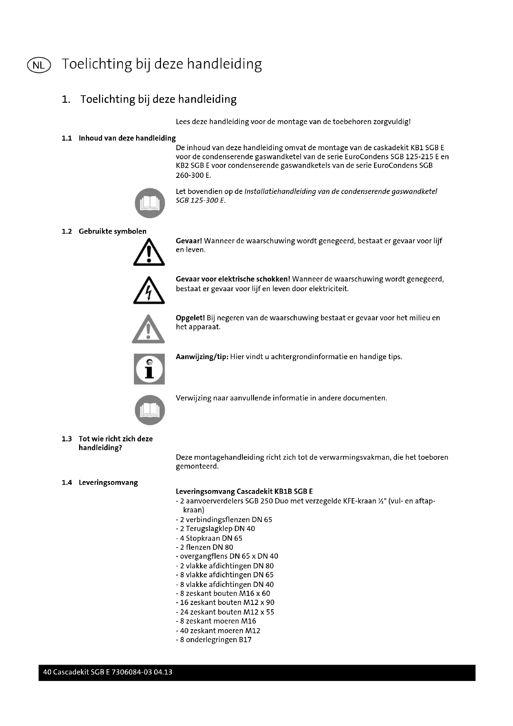De inhoud van deze handleiding omvat de montage van de caskadekit KB1 SGB E voor de condenserende gaswandketel van de serie EuroCondens SGB 125-215 E en KB2 SGB E voor condenserende gaswandketels van de serie EuroCondens SGB 260-300 E. Let bovendien op de Installatiehandleiding van de condenserende gaswandketel SGB 125-300 E.