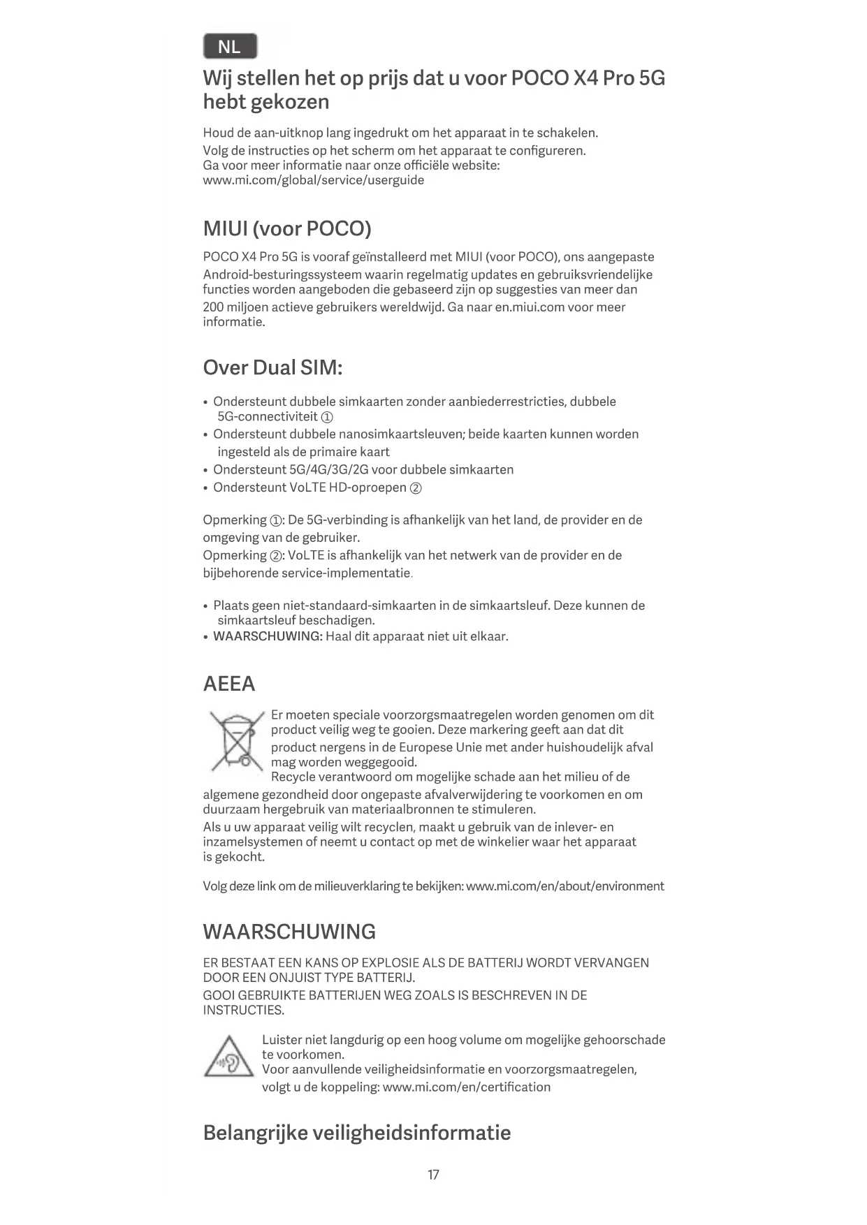 - WAARSCHUWING: Haal dit apparaat niet uit elkaar. AEEA Er moeten speciale voorzorgsmaatregelen worden genomen om dit product veilig weg te gooien. Deze markering gee aan dat dit product nergens in de Europese Unie met ander huishoudelijk afval mag worden weggegooid. Recycle verantwoord om mogelijke schade aan het milieu of de algemene gezondheid door ongepaste afvalverwijdering te voorkomen en om duurzaam hergebruik van materiaalbronnen te stimuleren. Als u uw apparaat veilig wilt recyclen, maakt u gebruik van de inlever- en inzamelsystemen of neemt u contact op met de winkelier waar het apparaat is gekocht. Volg deze link om de milieuverklaring te bekijken: www.mi.com/en/about/environment WAARSCHUWING ER BESTAAT EEN KANS OP EXPLOSIE ALS DE BATTERIJ WORDT VERVANGEN DOOR EEN ONJUIST TYPE BATTERIJ. GOOI GEBRUIKTE BATTERIJEN WEG ZOALS IS BESCHREVEN IN DE INSTRUCTIES. Luister niet langdurig op een hoog volume om mogelijke gehoorschade te voorkomen. Voor aanvullende veiligheidsinformatie en voorzorgsmaatregelen, volgt u de koppeling: www.mi.com/en/certification Belangrijke veiligheidsinformatie 17Lees alle veiligheidsinformatie voordat u het apparaat gebruikt:
