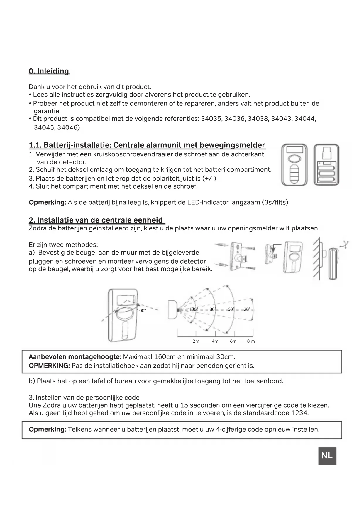 Une Zodra u uw batterijen hebt geplaatst, heeft u 15 seconden om een viercijferige code te kiezen. Als u geen tijd hebt gehad om uw persoonlijke code in te voeren, is de standaardcode 1234. Opmerking: Telkens wanneer u batterijen plaatst, moet u uw 4-cijferige code opnieuw instellen. 100° 2m 4m 6m 8 m 100° 80° 60° 20°NL