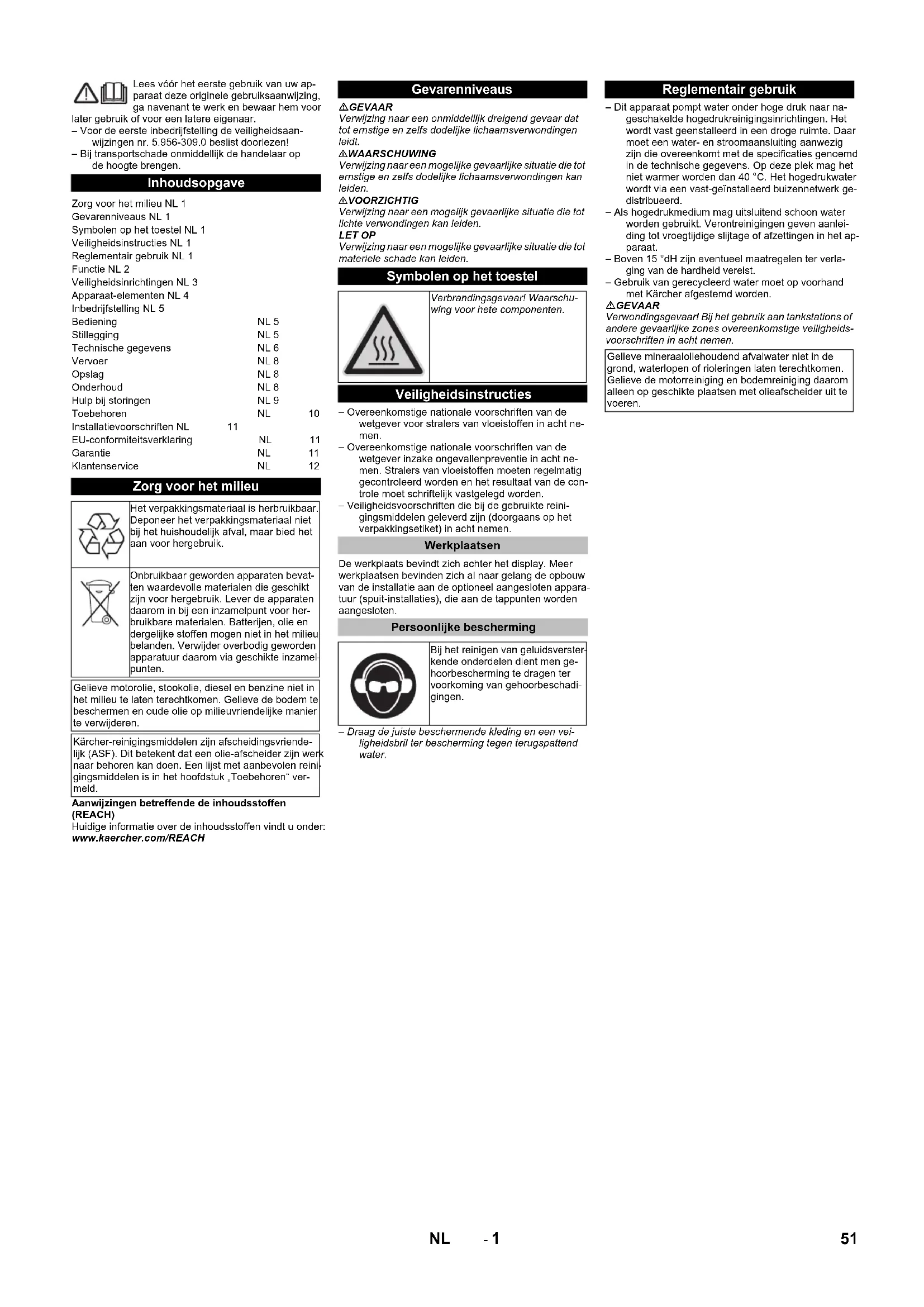 Alimentazione dell'acqua Valore pH 6,5...9,5Conducibilità elettrica < 2000 µS/cmSostanze sedimentabili < 0,5 mg/l *Sostanze filtrabili (grandezza gra-nulare inferiore a 0,025 mm)< 20 mg/lIdrocarburi < 20 mg/lCloruro < 300 mg/lCalcio < 85 mg/l **Durezza complessiva < 15 °dH **Ferro < 0,5 mg/lManganese < 0,05 mg/lRame < 0,02 mg/lprivo di odori fastidiosi Collegamento elettrico Dichiarazione di conformità UE Prodotto: IdropulitriceModello: 2.509-xxxDirettive UE pertinenti2006/42/CE (+2009/127/CE)2009/125/CE2011/65/UE2014/30/UENorme armonizzate applicateEN IEC 63000: 2018EN 55014–1: 2017 + A11: 2020EN 55014–2: 2015EN 60335–1EN 60335–2–79EN 61000–3–2: 2014EN 61000–3–3: 2013EN 61000–3–12: 2011EN 61000–6–2: 2005EN 61000–6–4: 2007EN 62233: 2008Regolamentazioni applicate(UE) 2019/1781 Garanzia Chairman of the Board of ManagementDirector Regulatory Affairs & Certification 49IT- 12 Servizio assistenza Tipo di impianto: Codice produttore: Data messa in funzione: Data del controllo: Diagnosi: Firma Data del controllo: Diagnosi: Firma Data del controllo: Diagnosi: Firma Data del controllo: Diagnosi: Firma 50 IT- 1 Lees vóór het eerste gebruik van uw ap- paraat deze originele gebruiksaanwijzing, ga navenant te werk en bewaar hem voor later gebruik of voor een latere eigenaar. – Voor de eerste inbedrijfstelling de veiligheidsaan- wijzingen nr. 5.956-309.0 beslist doorlezen! – Bij transportschade onmiddellijk de handelaar op de hoogte brengen. Aanwijzingen betreffende de inhoudsstoffen (REACH) Huidige informatie over de inhoudsstoffen vindt u onder: www.kaercher.com/REACH GEVAAR Verwijzing naar een onmiddellijk dreigend gevaar dat tot ernstige en zelfs dodelijke lichaamsverwondingen leidt. 몇 WAARSCHUWING Verwijzing naar een mogelijke gevaarlijke situatie die tot ernstige en zelfs dodelijke lichaamsverwondingen kan leiden. 몇 VOORZICHTIG Verwijzing naar een mogelijk gevaarlijke situatie die tot lichte verwondingen kan leiden. LET OP Verwijzing naar een mogelijke gevaarlijke situatie die tot materiele schade kan leiden. – Overeenkomstige nationale voorschriften van de wetgever voor stralers van vloeistoffen in acht ne- men. – Overeenkomstige nationale voorschriften van de wetgever inzake ongevallenpreventie in acht ne- men. Stralers van vloeistoffen moeten regelmatig gecontroleerd worden en het resultaat van de con- trole moet schriftelijk vastgelegd worden. – Veiligheidsvoorschriften die bij de gebruikte reini- gingsmiddelen geleverd zijn (doorgaans op het verpakkingsetiket) in acht nemen. De werkplaats bevindt zich achter het display. Meer werkplaatsen bevinden zich al naar gelang de opbouw van de installatie aan de optioneel aangesloten appara- tuur (spuit-installaties), die aan de tappunten worden aangesloten. – Draag de juiste beschermende kleding en een vei- ligheidsbril ter bescherming tegen terugspattend water. – Dit apparaat pompt water onder hoge druk naar na- geschakelde hogedrukreinigingsinrichtingen. Het wordt vast geenstalleerd in een droge ruimte. Daar moet een water- en stroomaansluiting aanwezig zijn die overeenkomt met de specificaties genoemd in de technische gegevens. Op deze plek mag het niet warmer worden dan 40 °C. Het hogedrukwater wordt via een vast-geïnstalleerd buizennetwerk ge- distribueerd. – Als hogedrukmedium mag uitsluitend schoon water worden gebruikt. Verontreinigingen geven aanlei- ding tot vroegtijdige slijtage of afzettingen in het ap- paraat. – Boven 15 °dH zijn eventueel maatregelen ter verla- ging van de hardheid vereist. – Gebruik van gerecycleerd water moet op voorhand met Kärcher afgestemd worden. GEVAAR Verwondingsgevaar! Bij het gebruik aan tankstations of andere gevaarlijke zones overeenkomstige veiligheids- voorschriften in acht nemen. Inhoudsopgave Zorg voor het milieu NL 1 Gevarenniveaus NL 1 Symbolen op het toestel NL 1 Veiligheidsinstructies NL 1 Reglementair gebruik NL 1 Functie NL 2 Veiligheidsinrichtingen NL 3 Apparaat-elementen NL 4 Inbedrijfstelling NL 5 Bediening NL 5 Stillegging NL 5 Technische gegevens NL 6 Vervoer NL 8 Opslag NL 8 Onderhoud NL 8 Hulp bij storingen NL 9 Toebehoren NL 10 Installatievoorschriften NL 11 EU-conformiteitsverklaring NL 11 Garantie NL 11 Klantenservice NL 12 Zorg voor het milieu Het verpakkingsmateriaal is herbruikbaar. Deponeer het verpakkingsmateriaal niet bij het huishoudelijk afval, maar bied het aan voor hergebruik. Onbruikbaar geworden apparaten bevat- ten waardevolle materialen die geschikt zijn voor hergebruik. Lever de apparaten daarom in bij een inzamelpunt voor her- bruikbare materialen. Batterijen, olie en dergelijke stoffen mogen niet in het milieu belanden. Verwijder overbodig geworden apparatuur daarom via geschikte inzamel- punten. Gelieve motorolie, stookolie, diesel en benzine niet in het milieu te laten terechtkomen. Gelieve de bodem te beschermen en oude olie op milieuvriendelijke manier te verwijderen. Kärcher-reinigingsmiddelen zijn afscheidingsvriende- lijk (ASF). Dit betekent dat een olie-afscheider zijn werk naar behoren kan doen. Een lijst met aanbevolen reini- gingsmiddelen is in het hoofdstuk „Toebehoren“ ver- meld. Gevarenniveaus Symbolen op het toestel Verbrandingsgevaar! Waarschu- wing voor hete componenten. Veiligheidsinstructies Werkplaatsen Persoonlijke bescherming Bij het reinigen van geluidsverster- kende onderdelen dient men ge- hoorbescherming te dragen ter voorkoming van gehoorbeschadi- gingen. Reglementair gebruik Gelieve mineraaloliehoudend afvalwater niet in de grond, waterlopen of rioleringen laten terechtkomen. Gelieve de motorreiniging en bodemreiniging daarom alleen op geschikte plaatsen met olieafscheider uit te voeren. 51NL- 2 1 Voorfilter (apparaatkant)2 Temperatuursensor3 Watertekortbeveiliging4 Vlotterhouder5 Voordrukpomp(optie)6 Krukaspomp7 Veiligheidsventiel8 Elektromotor9 Terugslagklep10 Hogedrukslang11 Druksensor voor hogedruk12 Overstroomklep13 Debietmeter14 Vlotterventiel15 Afsluitventiel (bouwzijde