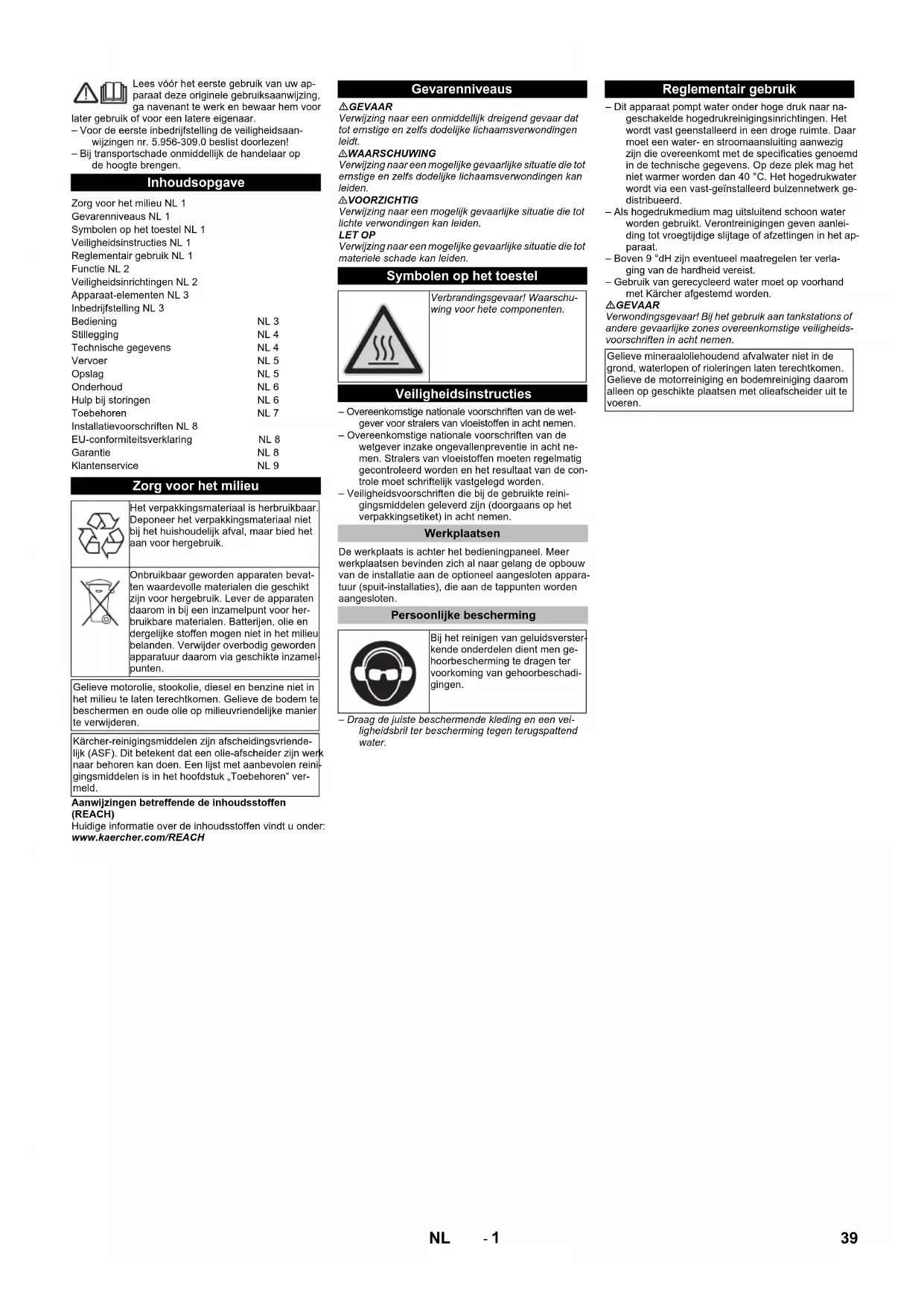 Controlelampjes Inbedrijfstelling Bediening Veiligheidsinstructies 41NL- 4 – De reinigingsmiddelen levert gevaar voor vergifti-ging of verbranding op! Neem de aanwijzingen op de reinigingsmiddelen. Bewaar reinigingsmiddelen op een plaats waar onbevoegden niet bij kunnen. GEVAARLevensgevaar door elektrische schok! Richt de water-straal niet op de volgende zaken:– Elektrische apparaten en installaties,– de hier beschreven installatie zelf,– alle stroomvoerende voorwerpen binnen het werk-gebied.Door de waterstraal uit de straalpijp ontstaat een terug-slagkracht. Doordat de straalpijp gebogen is, treedt er een opwaartse kracht op. GEVAAR– Verwondingsgevaar! De terugslag van de straalpijp kan u uit uw evenwicht brengen. U kunt vallen. De straalpijp kan in het rond vliegen en personen ver-wonden. Kies een veilige plek en houd het pistool goed vast. Klem de hendel van het handspuitpi-stool nooit vast.– Richt de straal niet op anderen of uzelf, teneinde kleding of schoenen te reinigen.– Verwondingsgevaar door wegvliegende onderde-len! Wegvliegende brokstukken of voorwerpen kun-nen personen of dieren verwonden. Richt de water-straal nooit op breekbare of losse voorwerpen.– Kans op ongelukken door beschadiging! Reinig wielen en ventielen met een minimale afstand van 30 cm. GEVAARGevaar door gezondheidsschadelijke stoffen! Spuit de volgende materialen niet af, omdat gezondheidsscha-delijke stoffen in de lucht kunnen worden verspreid:– Asbesthoudende materialen,– Materialen, die mogelijk gezondheidsschadelijke stoffen bevatten. GEVAAR– Verwondingsgevaar door naar buiten komende, eventueel hete waterstraal! Alleen originele Kär-cher-hogedrukslangen zijn optimaal op de installa-tie afgestemd. Als er andere slangen worden ge-bruik zijn wij niet aansprakelijk.– Gezondheidsgevaar door reinigingsmiddel! Door eventueel bijgemengde reinigingsmiddelen heeft het door het apparaat afgegeven water geen drink-waterkwaliteit.– Gevaar voor gehoorbeschadiging door het werken aan geluidsversterkende onderdelen. Draag in dit geval gehoorbescherming.몇 WAARSCHUWINGLangere gebruiksduur van het apparaat kan door de vi-braties leiden tot doorbloedingstoornissen in de handen.Een algemeen geldende duur voor het gebruik kan niet vastgelegd worden aangezien die afhangt van verschil-lende factoren:– persoonlijke neiging tot slechte doorbloeding (vaak koude vingers, kriebelen van de vingers).– Lage omgevingstemperatuur. Warme handschoe-nen dragen ter bescherming van de handen.– Stevig vasthouden hindert de doorbloeding.– Ononderbroken werking is slechter dan een wer-king met pauzen.Bij een regelmatig, langdurig gebruik van het apparaat en bij herhaaldelijk optreden van die symptomen (bij-voorbeeld kriebelen van de vingers, koude vingers) be-velen wij een medisch onderzoek aan. GEVAARVerwondingsgevaar door naar buiten komende, even-tueel hete waterstraal! GEVAARControleer de hogedrukslang vóór ieder gebruik altijd op beschadigingen. Vervang een beschadigde hoge-drukslang onmiddellijk. Controleer de hogedrukslang, de leidingen, arma-turen en de straalpijp voor elk gebruik op bescha-digingen. Controleer of de slangkoppeling goed vast zit en niet lek is. Hoofdschakelaar in stand '0' draaien. Watertoevoer sluiten. Handspuitpistool bedienen tot het apparaat drukvrij is. Open de watertoevoer. Hoofdschakelaar in stand '1' draaien. Ontgrendelingsknop indrukken.Controlelampje klaar voor bedrijf licht op. Reiniging uitvoeren.Instructie: Bij een reinigingspauze van meer dan 30 seconden stopt de pomp. Tegelijkertijd wordt een stand-by-tijd van 6 uren gestart. Binnen die stand-by-tijd start het apparaat automatisch door de drukdaling bij het openen van het handspuitpistool. Ontgrendelingsknop indrukken.Controlelampje klaar voor bedrijf licht op. Hoofdschakelaar in stand '0' draaien. Watertoevoer sluiten. Handspuitpistool bedienen tot het apparaat drukvrij is. Handspuitpistool met veiligheidspal beveiligen te-gen onbedoeld openen.Bij langere werkonderbrekingen of als vorstvrije opslag niet mogelijk is, dienen de volgende maatregelen te worden genomen (zie het hoofdstuk „Onderhoudsvoor-schriften“,de paragraaf over „Vorstbeveiliging“ : Water aflaten. Apparaat met antivriesmiddel spoelen. Hoofdschakelaar uitschakelen en beveiligen.