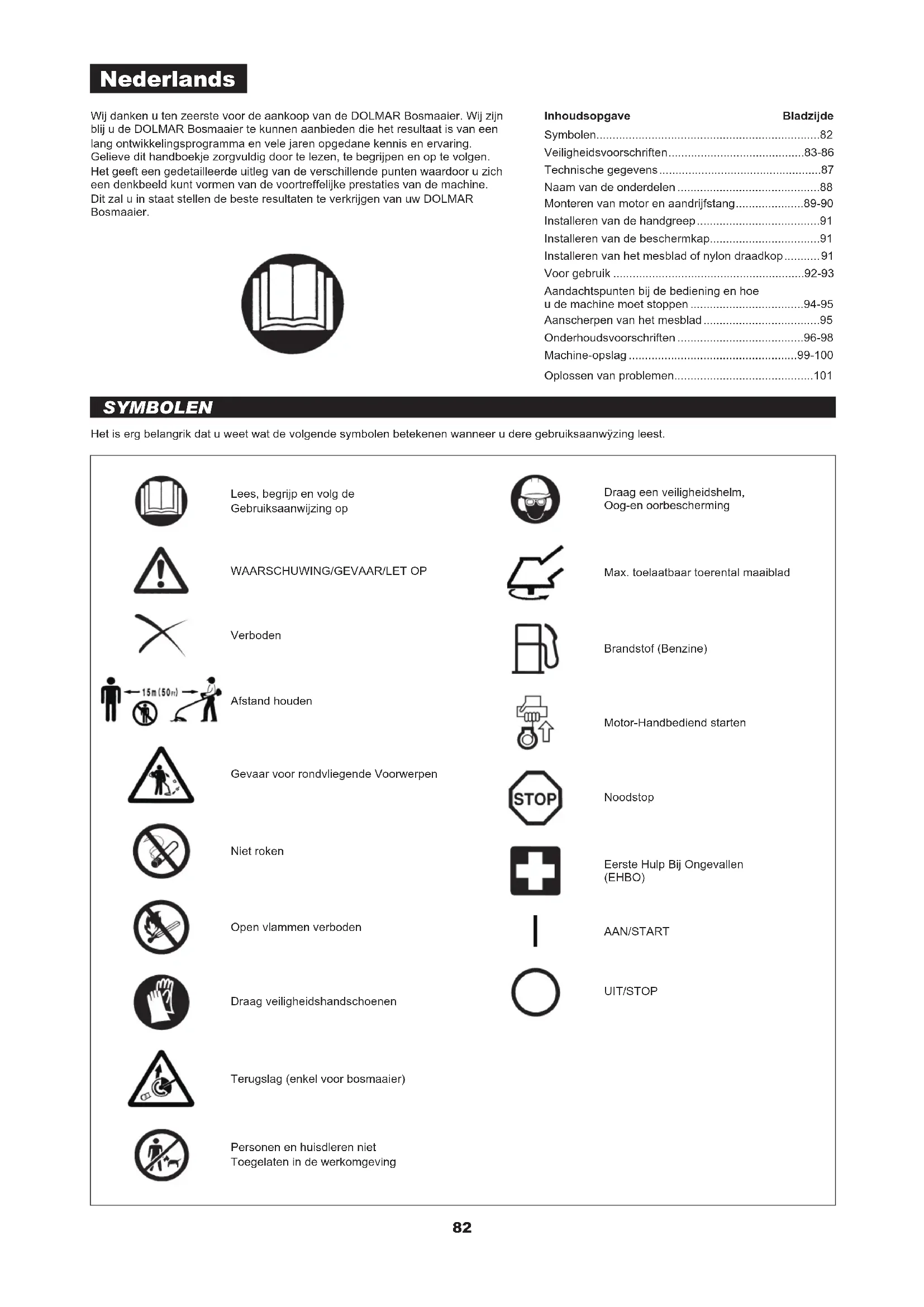 - Wij danken u ten zeerste voor de aankoop van de DOLMAR Bosmaaier. Wij zijn blij u de DOLMAR Bosmaaier te kunnen aanbieden die het resultaat is van een lang ontwikkelingsprogramma en vele jaren opgedane kennis en ervaring.Gelieve dit handboekje zorgvuldig door te lezen, te begrijpen en op te volgen. Het geeft een gedetailleerde uitleg van de verschillende punten waardoor u zich een denkbeeld kunt vormen van de voortreffelijke prestaties van de machine. Dit zal u in staat stellen de beste resultaten te verkrijgen van uw DOLMAR Bosmaaier.Inhoudsopgave BladzijdeHet is erg belangrik dat u weet wat de volgende symbolen betekenen wanneer u dere gebruiksaanwÿzing leest. SYMBOLEN Nederlands Symbolen p. 82