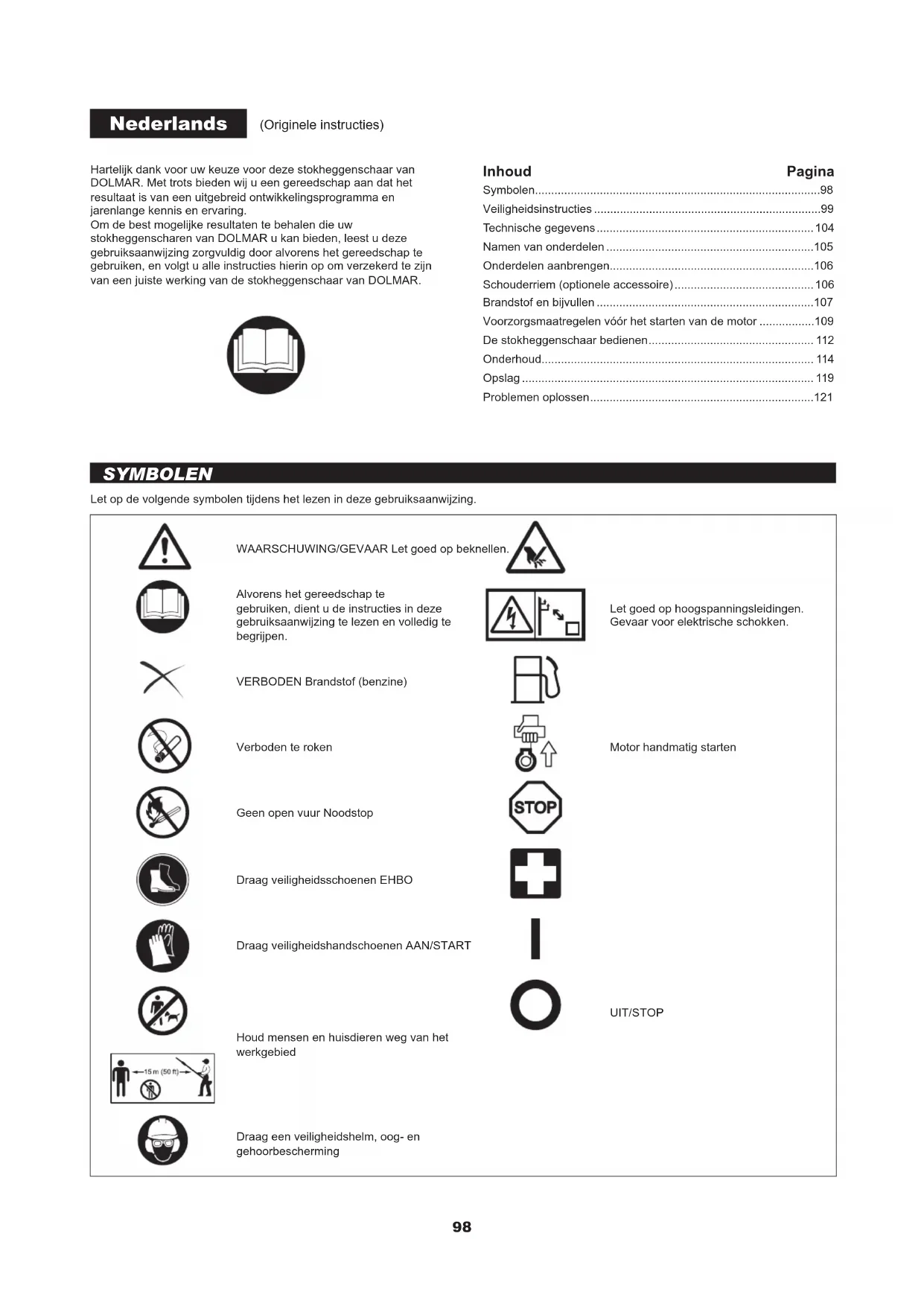 - Hartelijk dank voor uw keuze voor deze stokheggenschaar van DOLMAR. Met trots bieden wij u een gereedschap aan dat het resultaat is van een uitgebreid ontwikkelingsprogramma en jarenlange kennis en ervaring. Om de best mogelijke resultaten te behalen die uw stokheggenscharen van DOLMAR u kan bieden, leest u deze gebruiksaanwijzing zorgvuldig door alvorens het gereedschap te gebruiken, en volgt u alle instructies hierin op om verzekerd te zijn van een juiste werking van de stokheggenschaar van DOLMAR. Nederlands (Originele instructies) Inhoud Pagina Symbolen p. 98