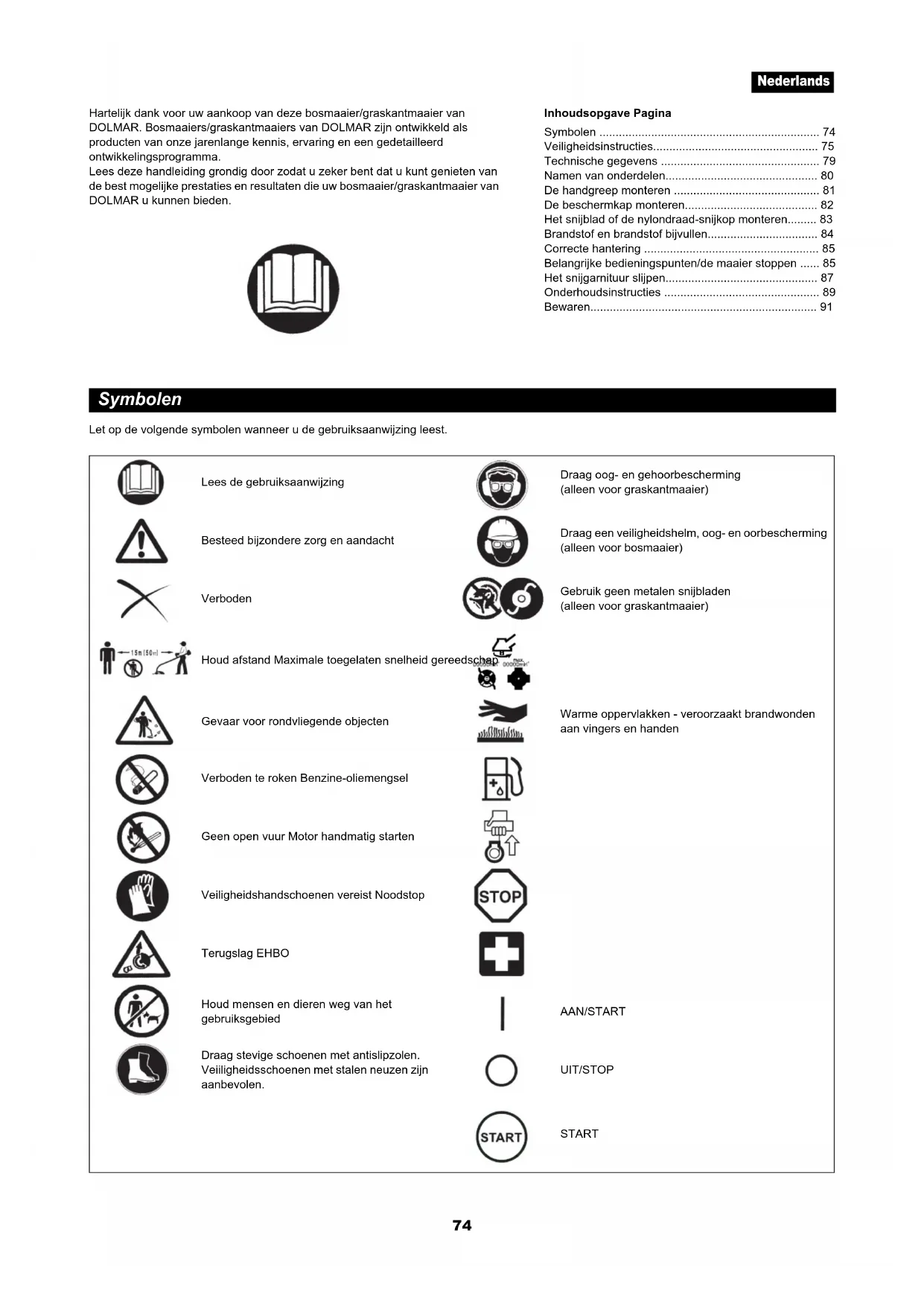 – Gebruik de bosmaaier/graskantmaaier met zo weinig mogelijk lawaai en vervuiling. Controleer vooral of de carburateur correct is afgesteld. – Maak de bosmaaier/graskantmaaier regelmatig schoon en controleer of alle schroeven en moeren stevig zijn vastgemaakt. – Onderhoud of bewaar de bosmaaier/graskantmaaier niet in de buurt van open vuur. – Bewaar de bosmaaier/graskantmaaier altijd in een afgesloten ruimte en met een leeggemaakte brandstoftank. – Wanneer u het gereedschap reinigt, onderhoudt of opbergt, bevestigt u altijd de beschermkap op het snijblad. Volg de relevante instructies voor het voorkomen van ongevallen die door de relevante beroepsverenigingen en verzekeringsmaatschappijen zijn uitgevaardigd. Breng geen wijzigingen aan de bosmaaier/graskantmaaier aan, omdat u op die manier uw veiligheid in gevaar brengt. Het uitvoeren van onderhoud of reparaties door de gebruiker is beperkt tot de activiteiten die in de gebruiksaanwijzing zijn beschreven. Alle andere werkzaamheden moet worden uitgevoerd door een erkend servicecentrum. Gebruik alleen originele reserveonderdelen en accessoires die zijn vervaardigd en geleverd door DOLMAR. Als u niet-goedgekeurde accessoires en gereedschappen gebruikt, zal het risico op ongevallen toenemen. DOLMAR aanvaardt geen enkele aansprakelijkheid voor ongevallen of schade, veroorzaakt door het gebruik van niet-goedgekeurde snijgarnituren, bevestigingsmiddelen voor snijgarnituren of accessoires. EHBO Zorg dat er altijd een EHBO-doos beschikbaar is in de buurt waar er wordt gemaaid om eerste hulp te bieden bij eventuele ongevallen. Vervang onmiddellijk elk item dat uit de EHBO-doos is genomen. Geef de volgende informatie wanneer u hulp inroept: – Plaats van het ongeval – Beschrijving van het ongeval – Aantal gewonden – Soort letsels – Uw naam Trillingen – Personen met een slechte bloedsomloop die worden blootgesteld aan sterke trillingen, kunnen verwondingen aan bloedvaten of het zenuwstelsel oplopen. Trillingen kunnen de volgende symptomen veroorzaken in de vingers, handen of polsen: “slapen” (ongevoeligheid), tintellingen, pijn, stekend gevoel, veranderen van huidskleur of van de huid. Als een van deze symptomen zich voordoet, raadpleegt u uw huisarts! – Om de kans op deze “witte-vingerziekte” te verkleinen, houdt u uw handen warm tijdens het werk en onderhoudt u het gereedschap en de accessoires goed. Alleen voor Europese landen EU-verklaring van conformiteit Ondergetekenden, Tamiro Kishima en Rainer Bergfeld, als erkende vertegenwoordigers van Dolmar GmbH, verklaren dat de DOLMAR- machine(s): Aanduiding van de machine: Bosmaaier/Graskantmaaier Modelnr./Type: MS-27 U, MS-27 C Technische gegevens: zie de tabel “TECHNISCHE GEGEVENS” in serie zijn geproduceerd en Voldoen aan de volgende Europese richtlijnen: 2000/14/EC en 2006/42/EC, 2004/108/EC En zijn gefabriceerd in overeenstemming met de volgende normen of genormaliseerd documenten:
