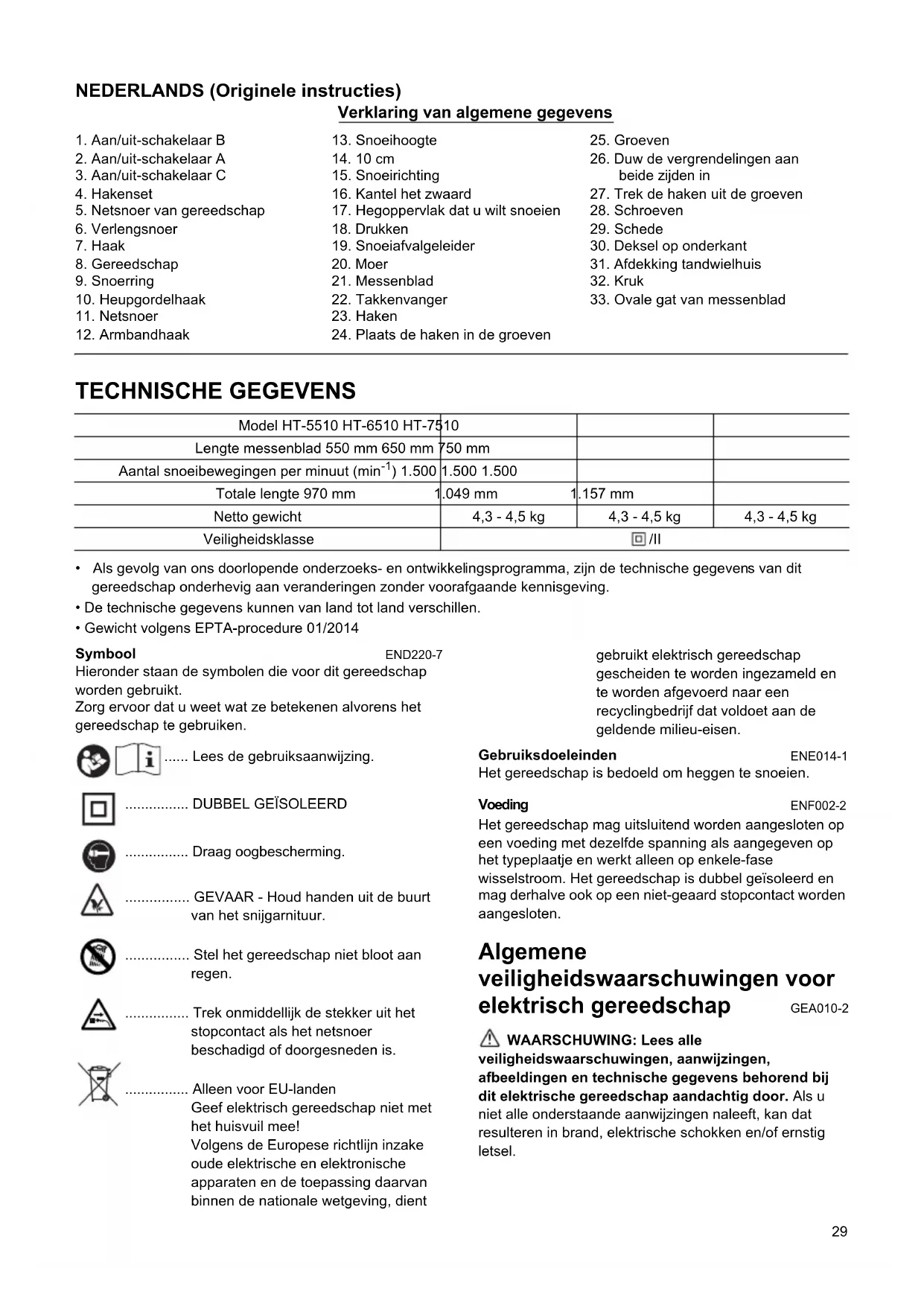 ................ Draag oogbescherming. ................ GEVAAR - Houd handen uit de buurt van het snijgarnituur. ................ Stel het gereedschap niet bloot aan regen. ................ Trek onmiddellijk de stekker uit het stopcontact als het netsnoer beschadigd of doorgesneden is. ................ Alleen voor EU-landen Geef elektrisch gereedschap niet met het huisvuil mee! Volgens de Europese richtlijn inzake oude elektrische en elektronische apparaten en de toepassing daarvan binnen de nationale wetgeving, dient gebruikt elektrisch gereedschap gescheiden te worden ingezameld en te worden afgevoerd naar een recyclingbedrijf dat voldoet aan de geldende milieu-eisen. Gebruiksdoeleinden ENE014-1 Het gereedschap is bedoeld om heggen te snoeien. Voeding ENF002-2 Het gereedschap mag uitsluitend worden aangesloten op een voeding met dezelfde spanning als aangegeven op het typeplaatje en werkt alleen op enkele-fase wisselstroom. Het gereedschap is dubbel geïsoleerd en mag derhalve ook op een niet-geaard stopcontact worden aangesloten. Algemene veiligheidswaarschuwingen voor elektrisch gereedschap GEA010-2 WAARSCHUWING: Lees alle veiligheidswaarschuwingen, aanwijzingen, afbeeldingen en technische gegevens behorend bij dit elektrische gereedschap aandachtig door. Als u niet alle onderstaande aanwijzingen naleeft, kan dat resulteren in brand, elektrische schokken en/of ernstig letsel.