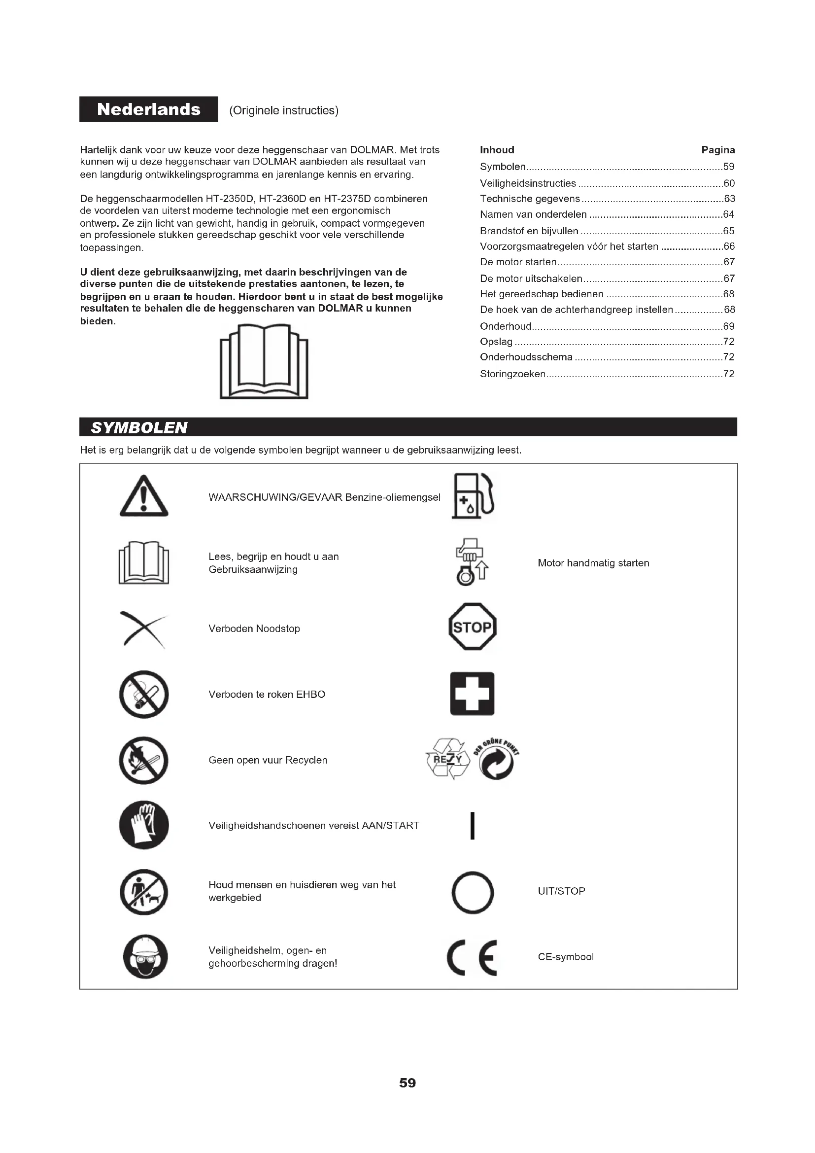 - Problema Sistema Osservazione Causa Il motore non si avvia o si avvia con difcoltà Sistema di accensione La scintilla di accensione è presente Problema nel sistema di alimentazione del carburante o nel sistema di compressione, difetto meccanico Nessuna scintilla di accensione Azionamento dell’Interruttore di avviamento e arresto, problema di cavi o corto circuito, candela o cavo della candela difettosi, modulo di accensione guasto Alimentazione del carburante Il serbatoio contiene carburante Levetta dell’aria in posizione non corretta, carburatore difettoso, testina aspirante (ltro della linea del gas) sporca, linea di alimentazione del carburante piegata o interrotta Compressione Interno del motore Guarnizione inferiore del cilindro guasta, guarnizioni dell’albero a manovella danneggiate, anelli del cilindro o del pistone guasti Esterno del motore Chiusura della candela non corretta Guasto meccanico L’avviamento non funziona Molla dell’avviamento rotta, parti danneggiate all’interno del motore Problemi nell’avviamento a caldo Scintilla di accensione con serbatoio pieno presente Carburatore contaminato, richiederne la pulizia Il motore parte ma si spegne immediatamente Alimentazione del carburante Il serbatoio contiene carburante Regolazione del minimo non corretta, testina aspirante o carburatore contaminati Apertura del serbatoio del carburante difettosa, linea di alimentazione del carburante interrotta, cavo o interruttore di avviamento e arresto difettosi Prestazioni insufcienti Possono essere interessati contemporaneamente più sistemi Motore al minimo Filtro dell’aria sporco, carburatore sporco, tubo di scarico otturato, condotto di scarico del cilindro otturato59 Hartelijk dank voor uw keuze voor deze heggenschaar van DOLMAR. Met trots kunnen wij u deze heggenschaar van DOLMAR aanbieden als resultaat van een langdurig ontwikkelingsprogramma en jarenlange kennis en ervaring. De heggenschaarmodellen HT-2350D, HT-2360D en HT-2375D combineren de voordelen van uiterst moderne technologie met een ergonomisch ontwerp. Ze zijn licht van gewicht, handig in gebruik, compact vormgegeven en professionele stukken gereedschap geschikt voor vele verschillende toepassingen. U dient deze gebruiksaanwijzing, met daarin beschrijvingen van de diverse punten die de uitstekende prestaties aantonen, te lezen, te begrijpen en u eraan te houden. Hierdoor bent u in staat de best mogelijke resultaten te behalen die de heggenscharen van DOLMAR u kunnen bieden. Het is erg belangrijk dat u de volgende symbolen begrijpt wanneer u de gebruiksaanwijzing leest. SYMBOLEN Nederlands WAARSCHUWING/GEVAAR Benzine-oliemengsel Lees, begrijp en houdt u aan Gebruiksaanwijzing Motor handmatig starten Verboden Noodstop Verboden te roken EHBO Geen open vuur Recyclen Veiligheidshandschoenen vereist AAN/START Houd mensen en huisdieren weg van het werkgebied UIT/STOP Veiligheidshelm, ogen- en gehoorbescherming dragen! CE-symbool (Originele instructies) Inhoud Pagina Symbolen p. 59